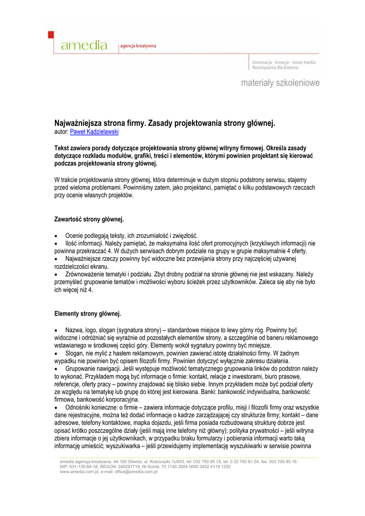 materiały szkoleniowe Najważniejsza strona firmy. Zasady projektowania strony głównej. autor: Paweł Kądzielawski Tekst zawiera porady dotyczące projektowania strony głównej witryny firmowej. Określa zasady dotyczące rozkładu modułów, grafiki, treści i elementów, którymi powinien projektant się kierować podczas projektowania strony głównej. W trakcie projektowania strony głównej, która determinuje w dużym stopniu podstrony serwisu, stajemy przed wieloma problemami. Powinniśmy zatem, jako projektanci, pamiętać o kilku podstawowych rzeczach przy ocenie własnych projektów. Zawartość strony głównej. Ocenie podlegają teksty, ich zrozumiałość i zwięzłość. Ilość informacji. Należy pamiętać, że maksymalna ilość ofert promocyjnych (krzykliwych informacji) nie powinna przekraczać 4. W dużych serwisach dobrym podziale na grupy w grupie maksymalnie 4 oferty. • Najważniejsze rzeczy powinny być widoczne bez przewijania strony przy najczęściej używanej rozdzielczości ekranu. • Zrównoważenie tematyki i podziału. Zbyt drobny podział na stronie głównej nie jest wskazany. Należy przemyśleć grupowanie tematów i możliwości wyboru ścieżek przez użytkowników. Zaleca się aby nie było ich więcej niż 4. • • Elementy strony głównej. • Nazwa, logo, slogan (sygnatura strony) – standardowe miejsce to lewy górny róg. Powinny być widoczne i odróżniać się wyraźnie od pozostałych elementów strony, a szczególnie od baneru reklamowego wstawianego w środkowej części góry. Elementy wokół sygnatury powinny być mniejsze. • Slogan, nie mylić z hasłem reklamowym, powinien zawierać istotę działalności firmy. W żadnym wypadku nie powinien być opisem filozofii firmy. Powinien dotyczyć wyłącznie zakresu działania. • Grupowanie nawigacji. Jeśli występuje możliwość tematycznego grupowania linków do podstron należy to wykonać. Przykładem mogą być informacje o firmie: kontakt, relacje z inwestorami, biuro prasowe, referencje, oferty pracy – powinny znajdować się blisko siebie. Innym przykładem może być podział oferty ze względu na tematykę lub grupę do której jest kierowana. Banki: bankowość indywidualna, bankowość firmowa, bankowość korporacyjna. • Odnośniki konieczne: o firmie – zawiera informacje dotyczące profilu, misji i filozofii firmy oraz wszystkie dane rejestracyjne, można też dodać informacje o kadrze zarządzającej czy strukturze firmy; kontakt – dane adresowe, telefony kontaktowe, mapka dojazdu, jeśli firma posiada rozbudowaną strukturę dobrze jest opisać krótko poszczególne działy (jeśli mają inne telefony niż główny); polityka prywatności – jeśli witryna zbiera informacje o jej użytkownikach, w przypadku braku formularzy i pobierania informacji warto taką informację umieścić; wyszukiwarka – jeśli przewidujemy implementację wyszukiwarki w serwisie powinna ………………………………………………………………………………………………………………………….……….…….… amedia agencja kreatywna, 44-100 Gliwice, ul. Kościuszki 1c/603, tel: 032 750 85 15, tel: 0 32 750 81 04, fax: 032 750 85 16 NIP: 631-130-84-18, REGON: 240287719, Nr Konta: 70 1140 2004 0000 3402 4119 1250 www.amedia.com.pl, e-mail: [email protected] materiały szkoleniowe być ona na stronie głównej wraz z przyciskiem „szukaj” tuż przy polu tekstowym wyszukiwarki, odsyłanie do innych stron w celu wyszukiwania jest niedopuszczalne, moduł wyszukiwarki nie trzeba opisywać nagłówkiem, w zupełności zastępuje do przycisk „szukaj”; odnośniki priorytetowe – tylko odnośniki o charakterze priorytetowym powinny znajdować się na stronie głównej aby miały odpowiednią „moc przekazu”. • Odnośniki zbyteczne: data i godzina – wszystkie systemy komputerowe oferują funkcje daty i godziny na pulpicie lub pasku narzędzi; imieniny, prognoza pogody – jeśli nie jest to uzasadnione treścią lub specyfiką witryny; odnośniki nieistotne – odnośniki prowadzące do mało ważnych z punktu widzenia celów głównych witryny nie powinny być umieszczane na stronach głównych. Grafika. Trzy zasady dobrej grafiki internetowej: 1. Profesjonalizm – dobrze przygotowana grafika i dobrane kolory czynią stronę wiarygodną. 2. Przekaz – elementy graficzne powinny służyć podkreśleniu ważnego przekazu lub informacji, nie są elementem dekorującym serwisy. Zastanów się jakie elementy graficzne nie wnoszą do zawartości witryny nic, prócz tego że ładnie wyglądają. 3. Tematyczność – elementy graficzne powinny być w prosty sposób powiązane z treścią i zawartością witryny, w przeciwnym razie powodują jedynie rozproszenie przekazu. • Rozmiary plików graficznych powinny być jak najmniejsze przy zachowaniu jakości obrazu. Ciężkie pliki graficzne, jeśli jest potrzeba ich wstawienia, powinny być ładowane w osobnych oknach lub powinna być możliwość ich ściągnięcia na komputer lokalny. • Grafika jako podkład pod tekst (znaki wodne) są niedopuszczalne. • Animacje na stronach powinny mieć konieczne uzasadnienie i nie powinno być ich więcej niż 2. Wstawienie większej ilości animacji rozprasza użytkownika i odwraca jego uwagę od treści właściwej. • Logotyp, nazwa strony i slogan nie powinny być animowane. Służą one do szybkiej orientacji w tematyce strony i miejsca gdzie znajduje się użytkownik. • Elementy graficzne, jeśli dotyczą tekstów będących linkami, powinny być klikalne podobnie jak tekst. Panel użytkownika, interakcja. Umiejscowienie panelu logowania – standardowo jest to prawy górny róg. Należy pamiętać aby panel logowania nie był tuż obok wyszukiwarki, jeśli jest na stronie. Umieszczenie panelu logowania w bezpośrednim sąsiedztwie wyszukiwarki jest często mylące. • Elementy panelu logowania powinny być maksymalnie skrócone. Dw