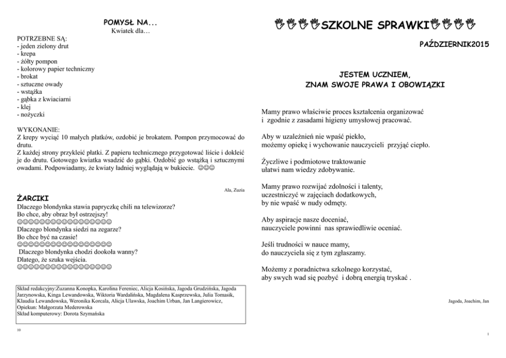SZKOLNE SPRAWKI POMYSŁ NA... Kwiatek dla… POTRZEBNE SĄ: - jeden zielony drut - krepa - żółty pompon - kolorowy papier techniczny - brokat - sztuczne owady - wstążka - gąbka z kwiaciarni - klej - nożyczki PAŹDZIERNIK2015 JESTEM UCZNIEM, ZNAM SWOJE PRAWA I OBOWIĄZKI Mamy prawo właściwie proces kształcenia organizować i zgodnie z zasadami higieny umysłowej pracować. WYKONANIE: Z krepy wyciąć 10 małych płatków, ozdobić je brokatem. Pompon przymocować do drutu. Z każdej strony przykleić płatki. Z papieru technicznego przygotować liście i dokleić je do drutu. Gotowego kwiatka wsadzić do gąbki. Ozdobić go wstążką i sztucznymi owadami. Podpowiadamy, że kwiaty ładniej wyglądają w bukiecie. Ala, Zuzia ŻARCIKI Dlaczego blondynka stawia papryczkę chili na telewizorze? Bo chce, aby obraz był ostrzejszy! Dlaczego blondynka siedzi na zegarze? Bo chce być na czasie! Dlaczego blondynka chodzi dookoła wanny? Dlatego, że szuka wejścia. Skład redakcyjny:Zuzanna Konopka, Karolina Fereniec, Alicja Kosińska, Jagoda Grudzińska, Jagoda Jarzynowska, Kinga Lewandowska, Wiktoria Wardalińska, Magdalena Kasprzewska, Julia Tomasik, Klaudia Lewandowska, Weronika Korcala, Alicja Ulawska, Joachim Urban, Jan Langierowicz, Opiekun: Małgorzata Mederowska Skład komputerowy: Dorota Szymańska Aby w uzależnień nie wpaść piekło, możemy opiekę i wychowanie nauczycieli przyjąć ciepło. Życzliwe i podmiotowe traktowanie ułatwi nam wiedzy zdobywanie. Mamy prawo rozwijać zdolności i talenty, uczestniczyć w zajęciach dodatkowych, by nie wpaść w nudy odmęty. Aby aspiracje nasze doceniać, nauczyciele powinni nas sprawiedliwie oceniać. Jeśli trudności w nauce mamy, do nauczyciela się z tym zgłaszamy. Możemy z poradnictwa szkolnego korzystać, aby swych wad się pozbyć i dobrą energią tryskać . Jagoda, Joachim, Jan 10 1 JESTEM UCZNIEM, ZNAM SWOJE PRAWA I OBOWIĄZKI RECENZJA Autorem książki pt. ,,Za niebieskimi drzwiami” jest Marcin Szczygielski. Książka opowiada o chłopcu, który, jadąc na wakacje z mamą, miał wypadek. Mama ma poważne obrażenia ciała, dlatego musi zostać w szpitalu. Po chłopca przyjeżdża sąsiadka, pani Cebulka. Kiedy rozpoczyna się rok szkolny, pojawia się ciocia chłopca, której ten nie znał. Zabiera go do hotelu Wysoki Klif, który sama prowadzi. Chłopak mieszka w pokoju, w którym kiedyś mieszkała jego mama. Dowiaduje się, że w dzieciństwie mama pomalowała drzwi do pokoju na niebiesko. Po jakimś czasie bohater spotyka na ulicy troje dzieci: Pchełkę, Monikę i Zgryza. Dokuczają mu z powodu jego kalectwa. W jego obronie staje ciotka. Jednak dlatego że zawstydziła go przed dziećmi, kłóci się z nią i ze złości zamyka się w pokoju. Zmartwiona ciotka puka do drzwi jego pokoju, on dla śmiechu odpukuje. Ze złości robi to coraz szybciej. Jego pukanie zamienia się w rytm. Nagle drzwi się otwierają i ukazuje się mu magiczna kraina. Tajemnicza okolica pachnie pudrem jego mamy. Jest w odcieniach turkusu i srebra. Mieszkują tam arynie -ważko-ptaki oraz Krwawiec. Chłopiec przywiązuje się do magicznej okolicy i odwiedza ją coraz częściej, przez co wpada w poważne kłopoty. Świat fantastyczny chce zawładnąć światem rzeczywistym. A to wszystko dzieje się za sprawą małej, cienkiej niteczki… Książka spodoba się zarówno chłopcom jak i dziewczynkom. Dzięki ciekawej fabule szybko się ją czyta. Porusza ona problem niepełnosprawności, samotności człowieka. Szczerze polecamy! Moim obowiązkiem jest wiedzy zdobywanie i w pełni czasu na naukę wykorzystywanie. Choć po szkole podwórko, telefon, komputer mnie kusi, pamiętam, że uczeń najpierw lekcje odrobić musi. Dbałość o kulturę zachowania, stroju i języka to moje zadanie. Gdy okażę szacunek, wszyscy będą mieli o mnie dobre zdanie. Brak reakcji na brzydkie słowo i brutalność nie przystoi. Niech się uczeń reagować na brzydkie słowo i brutalność nie boi. Rozumiem, że zabawa na przerwie bezpieczna być musi, bym cały i zdrowy do domu wrócił. Ład i porządek w szkole zachowuję, wyrządzoną szkodę zawsze rekompensuję. Julia i Klaudia Wiem, że każdy może mieć swoje poglądy i własne zdanie, gdy je uszanuję, nic złego mi się nie stanie. Podporządkowuję się zarządzeniom pana dyrektora i nauczycieli, widać ważne zmiany wprowadzić musieli. Telefon na lekcji muszę mieć wyłączony, gdyż na temacie zajęć mam być maksymalnie skupiony. Jagoda, Julia 2 9 HOROSKOP WYWIAD 14 października Dzień Edukacji Narodowej Nauczyciel też uczniem był… I to naszej szkoły!!! Na rozmowę udało się nam namówić pana Mirosława Murawskiego, nauczyciela historii, który jest absolwentem Szkoły Podstawowej Nr 9 na Wrzosach. Lew (23.07. - 23.08.) SZCZĘŚLIWE DNI: 17 i 19 października UWAŻAJ: Na pędzące samochody. PORADA MIESIĄCA: Ucz się na bieżąco. SZKOŁA: Niedługo niezapowiedziana kartkówka. PRZYJAŹŃ: Przyjaciel czeka na Twoją pomoc. Panna (23.08. – 22.09.) SZCZĘŚLIWE DNI: 5 i 29 października UWAŻAJ: Na błąkające się psy. PORADA MIESIĄCA: Bądź sobą! SZKOŁA: Szykuje się szóstka! PRZYJAŹŃ: Ktoś uważnie Ci się przypatruje. Joachim, Jan Czy praca szkoły wyglądała kiedyś inaczej? Kiedyś szkoła była pomyślana po prostu jako miejsce, które ma uczyć i już. Teraz jest spora rozmaitość (w granicach możliwości) zajęć i pomysłów. Bardziej rozmaite są też formy lekcji i innych zajęć. Nie tylko dzięki multimediom, ale i przez dostępność różnych materiałów. Dzisiaj uczyć się jest na pewno łatwiej, ale to wcale nie zawsze pomaga. Jest też odczuwalne inne nastawienie. Często słyszę o przyjaznej atmosferze. Kiedyś nauczyciel budził ogromny respekt, czasem obrywało się „w skórę”. Dzisiaj jest większa „kontaktowość”. Praca i wymagania to jedno, ale da się wyczuć, że nauczyciele otaczają swoich podopiecznych większą troską. Ni