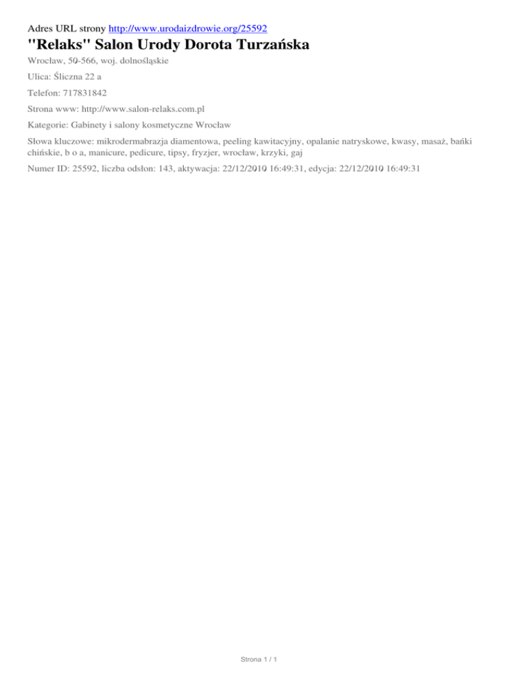 "Relaks" Salon Urody Dorota Turzanska, Wroclaw, Sliczna 22 a