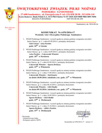 KOMUNIKAT Nr 6/PS/2016-17 - Świętokrzyski Związek Piłki Nożnej