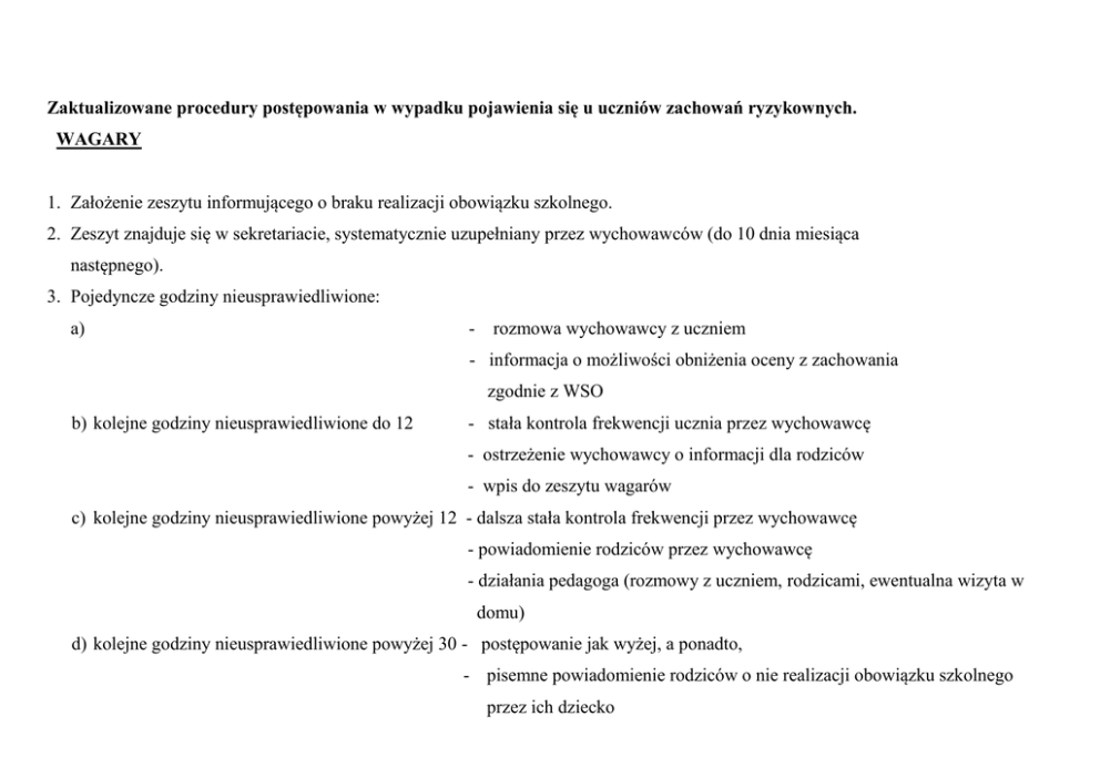 Zaktualizowane procedury postępowania w wypadku pojawienia się u uczniów zachowań ryzykownych. WAGARY 1. Założenie zeszytu informującego o braku realizacji obowiązku szkolnego. 2. Zeszyt znajduje się w sekretariacie, systematycznie uzupełniany przez wychowawców (do 10 dnia miesiąca następnego). 3. Pojedyncze godziny nieusprawiedliwione: a) - rozmowa wychowawcy z uczniem - informacja o możliwości obniżenia oceny z zachowania zgodnie z WSO b) kolejne godziny nieusprawiedliwione do 12 - stała kontrola frekwencji ucznia przez wychowawcę - ostrzeżenie wychowawcy o informacji dla rodziców - wpis do zeszytu wagarów c) kolejne godziny nieusprawiedliwione powyżej 12 - dalsza stała kontrola frekwencji przez wychowawcę - powiadomienie rodziców przez wychowawcę - działania pedagoga (rozmowy z uczniem, rodzicami, ewentualna wizyta w domu) d) kolejne godziny nieusprawiedliwione powyżej 30 - postępowanie jak wyżej, a ponadto, - pisemne powiadomienie rodziców o nie realizacji obowiązku szkolnego przez ich dziecko - uprzedzenie rodziców o możliwości wystąpienia do Sądu dla Nieletnich o przyznaniu kuratora e) kolejne godziny nieusprawiedliwione powyżej 60 – postępowanie jak wyżej - kontakt z kuratorem dziecka (jeśli jest) - obniżenie oceny z zachowania zgodnie z WSO - dalsza procedura: 3-krotna informacja pisemna do rodziców, następnie informacja do organu prowadzącego (U. Gminy) o nałożenie grzywny - pedagog w porozumieniu z zespołem wychowawczym na WNIOSEK WYCHOWAWCY kieruje sprawę do sądu o przyznanie kuratora 4. Aby zapobiegać problemowi wagarów, minimalizować jego rozmiar należy motywować uczniów do realizowania obowiązku szkolnego przez ogłoszenie konkursów: a) „Punktualna klasa” - oceniać co miesiąc, podsumowanie wyników na zakończenie semestru (wręczenie dyplomów, ewentualnie upominków) b) „Stu -% klasa” - podsumowanie wyników na koniec semestru (wręczenie dyplomów, ewentualnych upominków)