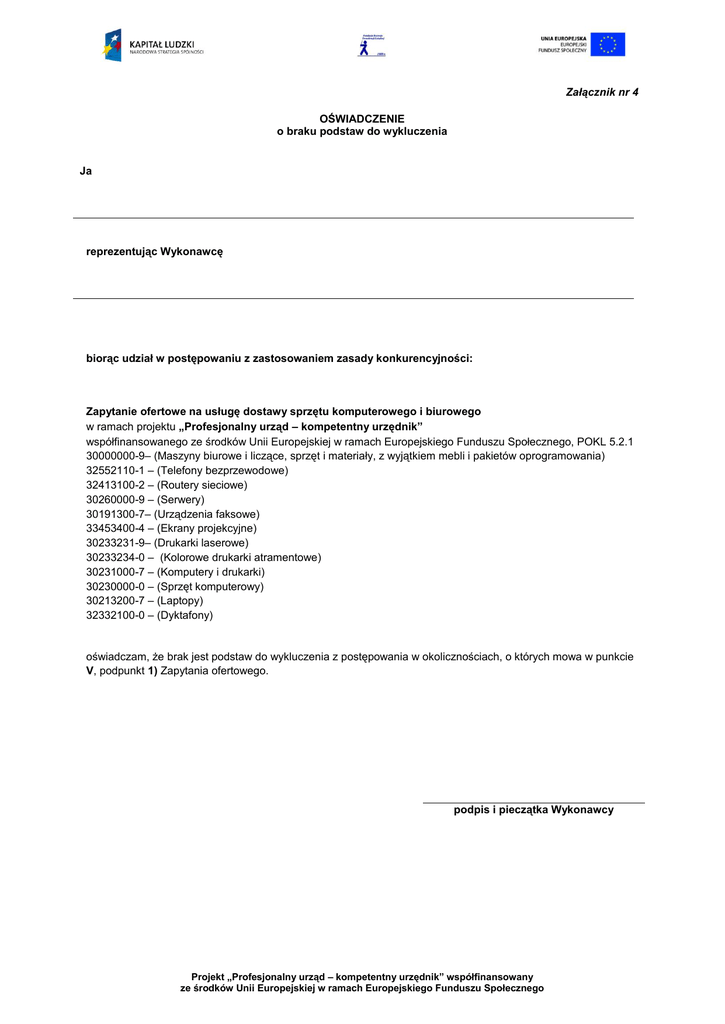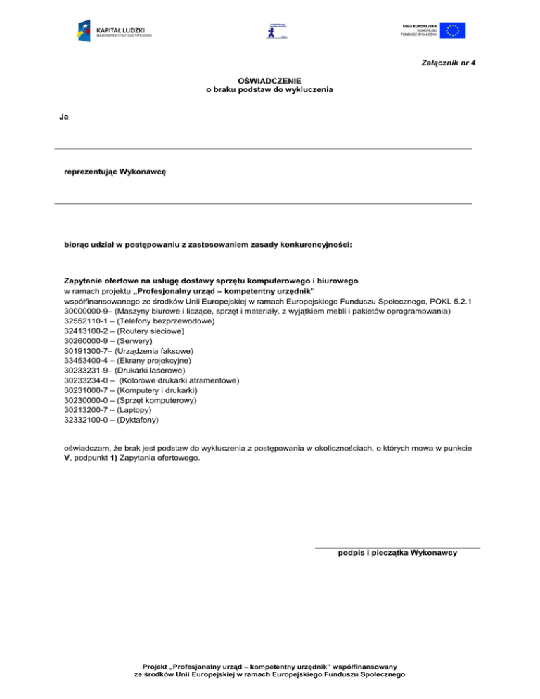Załącznik nr 4 OŚWIADCZENIE o braku podstaw do wykluczenia Ja reprezentując Wykonawcę biorąc udział w postępowaniu z zastosowaniem zasady konkurencyjności: Zapytanie ofertowe na usługę dostawy sprzętu komputerowego i biurowego w ramach projektu „Profesjonalny urząd – kompetentny urzędnik” współfinansowanego ze środków Unii Europejskiej w ramach Europejskiego Funduszu Społecznego, POKL 5.2.1 30000000-9– (Maszyny biurowe i liczące, sprzęt i materiały, z wyjątkiem mebli i pakietów oprogramowania) 32552110-1 – (Telefony bezprzewodowe) 32413100-2 – (Routery sieciowe) 30260000-9 – (Serwery) 30191300-7– (Urządzenia faksowe) 33453400-4 – (Ekrany projekcyjne) 30233231-9– (Drukarki laserowe) 30233234-0 – (Kolorowe drukarki atramentowe) 30231000-7 – (Komputery i drukarki) 30230000-0 – (Sprzęt komputerowy) 30213200-7 – (Laptopy) 32332100-0 – (Dyktafony) oświadczam, że brak jest podstaw do wykluczenia z postępowania w okolicznościach, o których mowa w punkcie V, podpunkt 1) Zapytania ofertowego. podpis i pieczątka Wykonawcy Projekt „Profesjonalny urząd – kompetentny urzędnik” współfinansowany ze środków Unii Europejskiej w ramach Europejskiego Funduszu Społecznego