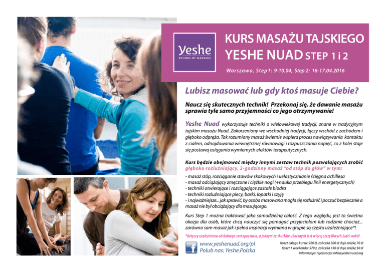 KURS MASAŻU TAJSKIEGO YESHE NUAD STEP 1 i 2 Warszawa, Step1: 9-10.04, Step 2: 16-17.04.2016 Lubisz masować lub gdy ktoś masuje Ciebie? Naucz się skutecznych technik! Przekonaj się, że dawanie masażu sprawia tyle samo przyjemności co jego otrzymywanie! Yeshe Nuad wykorzystuje techniki o wielowiekowej tradycji, znane w tradycyjnym tajskim masażu Nuad. Zakorzeniony we wschodniej tradycji, łączy wschód z zachodem i głęboko odpręża. Tak rozumiany masaż świetnie wspiera proces nawiązywania kontaktu z ciałem, odnajdowania wewnętrznej równowagi i rozpuszczania napięć, co z kolei staje się postawą osiągania wymiernych efektów terapeutycznych. Kurs będzie obejmować między innymi zestaw technik pozwalających zrobić głęboko rozluźniający, 2-godzinny masaż “od stóp do głów” w tym: - masaż stóp, rozciąganie stawów skokowych i uelastycznianie ścięgna achillesa - masaż odciążający zmęczone i ciężkie nogi (+nauka przebiegu linii energetycznych) - techniki otwierające i rozciągające zastałe biodra - techniki rozluźniające plecy, barki, łopatki i szyję - i najważniejsze... jak sprawić, by osoba masowana mogła się rozluźnić i poczuć bezpiecznie a masaż nie był obciążający dla masującego. Kurs Step 1 można traktować jako samodzielną całość. Z tego względu, jest to świetna okazja dla osób, które chcą nauczyć się pomagać przyjaciołom lub rodzinie chociaż... zarówno sam masaż jak i pełna inspiracji wymiana w grupie są często uzależniające*! *dotyczy uzależnienia od dobrego samopoczucia; a jednym ze skutków ubocznych jest więcej szczęśliwych ludzi wokół www.yeshenuad.org/pl Polub nas: Yeshe.Polska Koszt całego kursu: 920 zł, zaliczka 300 zł daje zniżkę 70 zł Koszt 1 weekendu: 570 z, zaliczka 150 zł daje zniżkę 50 zł Informacje/ rejestracja: [email protected]