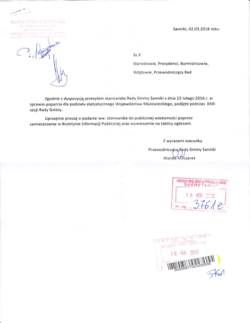 sanniki, 02.03.2016 roku sż.P. starostoWie, Prezydenci, BurmistrzoWie, Wójtowie, Przewodniczący Rad Zgodnie z dyspozycją przesyłam stanowisko Rady Gminy sanniki z dnia 23 lutego 2016 r, w sprawie poparcia dla podziału statystyczneBo Województwa Mazowieckie8o, podjęte podczas xxlll sesji Rady Gminy, Uprzejmie proszę o podanie wW. stanowiska do publicznej wiadomośai poprzez żamieszczenie W Biuletynie lnformacji Publicznej olaż Wywieszenie na tablicy o8łoszeń. z Wyrazami szacunku PżeWodnicz?cą/Tly Gminy sanniki *".,P,n#.-*n ,!lr,].i .l:\,§ _ ,t 4q STANOWISKO RADY GMINrY SANNIKI z dnia 23 lutego 2016 r. W sprawie zamiaru podziału statystycznego Wojewódawa Mazowieckiego. § 1.1. Rada Gminy Sanniki zdecydowanie popiera propozycję w sprawie podziału Województwa Mazowieckiego na dwie jednostki siatystyczne. 2. Uznalemy, że optymaln)m i 1edynym rozwtązaniem problemu Wojewódawa Mazowieckiego w kontekście moż]iwościskorzystania z Funduszy Europejskich w ramach Polityki Spójności po roku 2020 jest podział na dwiejednostki statystyczne NUTS 2. § 2. Rada Gminy Sanniki upoważnia Przewodniczącą Rady do przekazania niniejszego stanowiska l) 2) 3) 4) 5) 6) 7) 8) 9) : Prezydentowi RP; Prezesowi Rady Ministrów; Marszałkowi Senatu RP; Marszałkowi Sejmu RP; Eurodeputowanym z wojewódźwa mazowieckiego; Posłom i Senatorom z wojewódźwa mazowieckiego ; Wojewodzie Mazowieckiemu; Samorządowi Wojewódźwa Mazowieckiego; Samorządom powiatowym i samorządom gmimym z terenu województwa mazowieckiego; Mieszkańcomwojewództwamazowieckiego zapośrednictwem środków masowego pRzEwi.})N iC ZĄa.l R \JY Cla kń !,_,\NlĘ, t ] .l_/ v.Ą]itililżL,eĘ l0) Przekazu' - łiĄii,\ (]' ;, 1 ; _ .. .j j:] U], !j!1l1![.; ,oRial_!|\1lni]\i:j tćL ]l]- ł.] : ]]ł|n 1.:k]! l24l2i] ii j(] 'il]],]] ]i l] UZASADNIENIE Podział Województwa Mazowieckiego na dwie jednostki statystyczne NUTS 2 jest optymalnym rozwiązaniem. Jest g,\łarantem w miarę możliwościrównomiemej dystrybucji środków finansowych z Funduszu Europejskiego w ramach Polityki Spójności po roku 2020 na wszystkie jednostki administracyjne w województłie mazowieckim, co gwaraŃlje także nównowżony rozwój całego regionu Mazowsza. PRZEwotrNIqzĄcA R1DY cMe.iryANNlKI wande MilczaleŁ