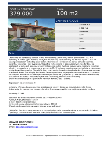 DOM na SPRZEDAŻ 379 000 Niwka 100 m2 27549/3877/ODS 379 000 PLN 3 790 PLN Secondary 1300 100 2010 4 Perfect Opis Oferujemy do sprzedaży bardzo ładny, nowoczesny, parterowy dom o powierzchni 100 m2 położony w Niwce (gm. Radłów). Budynek murowany, wybudowany na działce o pow. 13 ar. W skład pomieszczeń wchodzą: duży salon z kominkiem i wyjściem na taras, otwarta kuchnia, łazienka, wiatrołap i trzy sypialnie. Wszystko wykończone w podwyższonym standardzie. Na podłogach w pokojach panele, w kuchni i łazience płytki. Kuchnia zabudowana meblami wysokiej jakości i wyposażona w nowoczesne sprzęty AGD. W łazience narożna wanna, toaleta w zabudowie podtynkowej i umywalka. Okna PCV. Gaz, prąd, woda, kanalizacja w budynku. Ogrzewanie gazowe oraz kominkowe. Dach kryty dachówką. Teren ogrodzony, zagospodarowany drzewami, krzewami ozdobnymi. Ponadto na działce postawiony jest budynek gospodarczy, wiata na samochód i mały plac zabaw dla dzieci. Podjazdy wykonane z wysokiej jakości kostki brukowej. Znakomita lokalizacja w sąsiedztwie nowych domów, lasu i jeziora. Zapraszam na prezentację !!! Jesteśmy z Tobą od prezentacji do przekazania kluczy. Sprawnie przygotujemy dla Ciebie dokumenty do zakupu, a z naszym doradcą finansowym wybierzesz najlepszą ofertę kredytu. Nr oferty: 27549 Zadzwoń do mnie: Bochenek Dawid, tel.: +48500130465 PÓŁNOC Nieruchomości Tarnów e-mail: [email protected] Nr licencji osoby odpowiedzialnej zawodowo: 20064 Więcej ofert znajdziesz na naszej stronie www.polnoc.pl * UWAGA! Zamieszczone na naszych stronach oferty nie stanowią oferty w rozumieniu Kodeksu Cywilnego, a dane w nich zawarte mają jedynie charakter informacyjny. Dawid Bochenek tel. 500-130-465 email: [email protected] PÓŁNOC Nieruchomości - ogólnopolska sieć biur nieruchomości www.polnoc.pl PÓŁNOC Nieruchomości - ogólnopolska sieć biur nieruchomości www.polnoc.pl Powered by TCPDF (www.tcpdf.org)