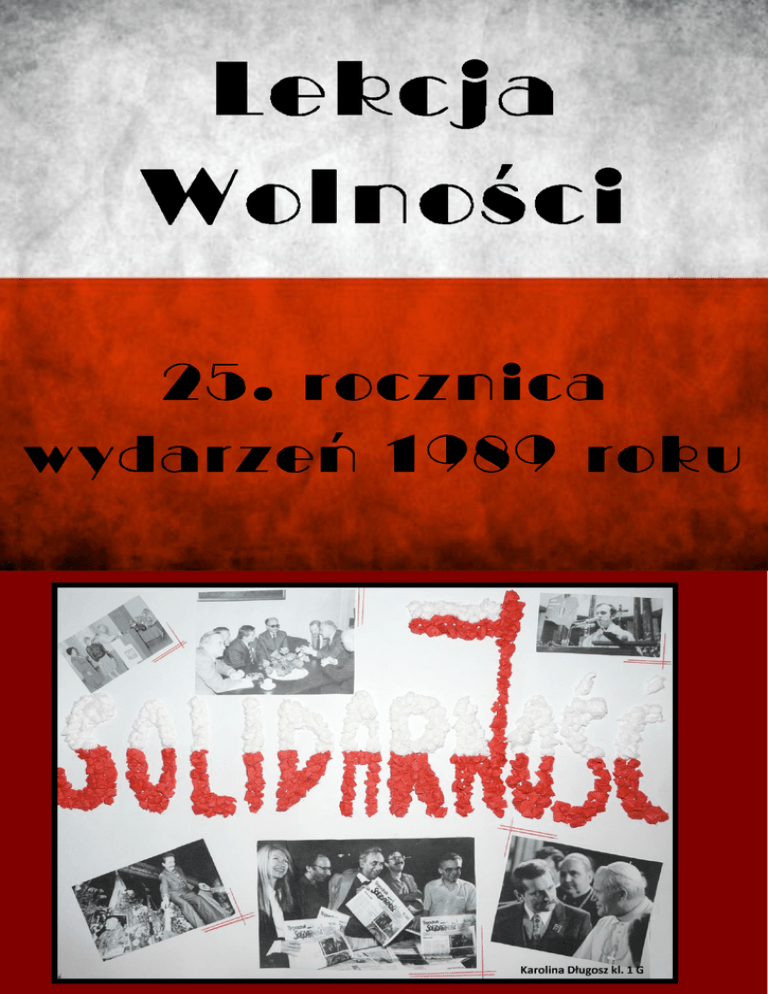 „ Lekcja Wolności 25. rocznica wydarzeń 1989 roku Dominika Krupka MY WOLNI POLACY Ach, my Polacy! W wolnej Polsce żyjemy. Robimy, co chcemy! Często zapominamy, co swoim przodkom zawdzięczamy. Lecz nadszedł czas, aby docenić ich zasługi, o Solidarności głośno zacząć mówić i dumnymi z nich być! Musimy spłacić Wolności długi. Musimy, bo oni nasz kraj z komunizmu wyzwolili. Do pierwszych wolnych wyborów doprowadzili. W tym roku ich 25-lecie obchodzimy . Doceniamy ich działanie, więc teraz my o los Polski będziemy mieli staranie. Karolina Winiarska WITAJ, WOLNOŚCI! Witaj Wolności! Witaj Narodzie! Coś trwał przez lata w czerwonym chłodzie! Solidarności ludu i przodkom chwała! Że dziś Ojczyzna wolną się stała! Po dniach ciemięstwa, rozruchów i sporów Ruszył Naród do wolnych wyborów! By na zawsze zatrzasnąć wrota Tyrani spod znaku sierpa i młota! Niech jak pąk róży pięknie rozkwita Polska wyśniona, Rzeczpospolita! Niech już na zawsze na Polski tronie Króluje Biały Orzeł w koronie! Naród, który nie pamięta swojej historii, nie ma także swojej przyszłości. (Jan Paweł II) Trudna droga do wolności Rok 1918 przyniósł Polsce wyczekiwaną przez lata zaborów niepodległość, ale nie na długo. Już 1 września 1939 r. Niemcy rozpoczęły atak, a kilkanaście dni później do Polski wkroczyła Armia Czerwona. Po zakończeniu II wojny światowej państwo polskie nie było suwerenne, rządy sprawowali komuniści. Czym był komunizm? Dlaczego do niego doszło? Komunizm w Polsce po raz pierwszy pojawił się pod koniec II wojny światowej, kiedy Armia Czerwona w 1944 r. wkroczyła do Polski. Na konferencjach w Jałcie i Poczdamie ustalono, że Polska pozostanie pod wpływami Związku Radzieckiego. Tak rozpoczęło się powolne i mozolne budowanie aparatu komunistycznego w Polsce. Powołano policję polityczną (SB – Służba Bezpieczeństwa). Urząd ten zajmował się tropieniem i aresztowaniem przeciwników politycznych w Polsce. Władza, która podporządkowała sobie administrację, podlegała ścisłym rozkazom z ZSRR. Rozpoczęto wprowadzanie systemu propagandowego komunizmu do szkół, język rosyjski stał się obowiązkowy. Rząd wprowadził monopolistyczną gospodarkę, upaństwowił ją i podporządkował partii. Budowa państwa polskiego na wzór Związku Radzieckiego była planem Stalina, który opracował go już na długo przed końcem wojny. Polska w sidłach komunistycznych coraz bardziej pogrążała się w biedzie i kryzysie. Powołano nowy rząd na czele z Józefem Cyrankiewiczem z Polskiej Partii Socjalistycznej, który popierał komunistyczne rozwiązania w stosunku do Polski. Na prezydenta został wybrany jedyny kandydat, Bolesław Bierut. Rozpoczęła się ostra sowietyzacja Polski. Polscy komuniści wspólnie z sowietami przystąpili do budowy aparatu komunistycznego w Polsce, aresztowano żołnierzy Armii Krajowej. Rozpoczęto otwartą walkę z Kościołem, kiedy prymasem został Stefan Wyszyński. Jednak wszystkie działania wymierzone przeciw księżom, fałszywe oskarżenia, aresztowania, umacniały wpływ Kościoła w społeczeństwie. Kościół był bowiem instytucją chroniącą wartości narodowe. Komunizm narzucony Polsce siłą po II wojnie światowej nie spotkał się z aprobatą polskiej społeczności. Pierwsze oznaki niezadowolenia pojawiły się w 1956 r. W Poznaniu w Zakładach im H. Cegielskiego rozpoczął się strajk robotników. Stutysięczną manifestację żądającą „ chleba i wolności” brutalnie stłumiono ( śmierć poniosło 75 osób, ok. 800 zostało rannych). Później w marcu 1968 r. wystąpili studenci. Pretekstem do demonstracji w Warszawie było zdjęcie z afisza antyrosyjskiego przedstawienia „Dziadów” A. Mickiewicza. W grudniu 1970 r. falę strajków i demonstracji w Gdańsku i Szczecinie wywołały wprowadzone przez rząd podwyżki o 20% cen na artykuły spożywcze. W wyniku starć zginęło 45 osób, 1164 zostało rannych, 277 aresztowano. Grudniowe wydarzenia doprowadziły do rezygnacji ze stanowiska I sekretarza PZPR Władysława Gomułki, a jego następcą został Edward Gierek. W latach siedemdziesiątych zaczął się uwidaczniać coraz ostrzejszy kryzys. W czerwcu 1976 władze znów podwyższyły ceny( mięsa o 69% i cukru o 100%), co wywołało zamieszki w kraju. Wprowadzono kartki na cukier W 1980 r. władze komunistyczne po raz kolejny po cichu zdecydowały się na podwyżki cen, co wywołało protesty w Stoczni Gdańskiej. Na czele strajku stanął Lech Wałęsa, przedstawiając 21 postulatów m.in. utworzenia wolnych związków zawodowych. W sierpniu 1980 roku zostały podpisane porozumienia władz ze strajkującymi w Szczecinie, Gdańsku i Jastrzębiu. Władze zgodziły się na rejestrację Niezależnego Samorządnego Związku Zawo- dowego „Solidarność”. Na takie rozwiązanie wpłynęła m.in. opinia międzynarodowa stanowisko Watykanu i Waszyngtonu. Warto dodać, że wybór w 1978 r. na papieża Karola Wojtyły był nie na rękę władzy państwowej, natomiast społeczeństwu przyniósł wielką radością. Już bowiem podczas pierwszej pielgrzymki do Polski w 1979 roku Jan Paweł II wyzwolił w Polakach pragnienia wolności. W latach 80-tych władze konsekwentnie zwalczały działaczy „Solidarności”, a narastające konflikty były przyczyną akcji strajkowych. Pogarszająca się sytuacja gospodarcza w kraju doprowadziła do zwoływania marszy głodowych. Artykuły codziennego użytku były racjonowane, a ich dostawy często nie wystarczały na pokrycie przydziałów kartkowych. W sklepach były pustki na półkach. Przed dostawą towaru ustawiały się długie kolejki. Ludzie stali dzień i noc, dosłownie za wszystkimi produktami, nie tylko żywnością. Ciężko było zdobyć materiały budowlane, sprzęt AGD, odzież, a nawet papier toaletowy. W całym narodzie rosły niezadowolenie i frustracja. Atmosfera stawała się coraz bardziej napię