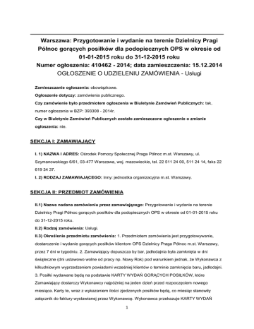 Warszawa: Przygotowanie i wydanie na terenie Dzielnicy Pragi Północ gorących posiłków dla podopiecznych OPS w okresie od 01-01-2015 roku do 31-12-2015 roku Numer ogłoszenia: 410462 - 2014; data zamieszczenia: 15.12.2014 OGŁOSZENIE O UDZIELENIU ZAMÓWIENIA - Usługi Zamieszczanie ogłoszenia: obowiązkowe. Ogłoszenie dotyczy: zamówienia publicznego. Czy zamówienie było przedmiotem ogłoszenia w Biuletynie Zamówień Publicznych: tak, numer ogłoszenia w BZP: 393308 - 2014r. Czy w Biuletynie Zamówień Publicznych zostało zamieszczone ogłoszenie o zmianie ogłoszenia: nie. SEKCJA I: ZAMAWIAJĄCY I. 1) NAZWA I ADRES: Ośrodek Pomocy Społecznej Praga Północ m.st. Warszawy, ul. Szymanowskiego 6/61, 03-477 Warszawa, woj. mazowieckie, tel. 22 511 24 00, 511 24 14, faks 22 619 34 37. I. 2) RODZAJ ZAMAWIAJĄCEGO: Inny: jednostka organizacyjna m.st. Warszawy. SEKCJA II: PRZEDMIOT ZAMÓWIENIA II.1) Nazwa nadana zamówieniu przez zamawiającego: Przygotowanie i wydanie na terenie Dzielnicy Pragi Północ gorących posiłków dla podopiecznych OPS w okresie od 01-01-2015 roku do 31-12-2015 roku. II.2) Rodzaj zamówienia: Usługi. II.3) Określenie przedmiotu zamówienia: 1. Przedmiotem zamówienia jest przygotowywanie, dostarczenie i wydanie gorących posiłków klientom OPS Dzielnicy Praga Północ m.st. Warszawy, przez 7 dni w tygodniu. 2. Zamawiający dopuszcza by bar, jadłodajnia była zamknięta w dni świąteczne (dni ustawowo wolne od pracy np. Nowy Rok) pod warunkiem jednak, że Wykonawca z kilkudniowym wyprzedzeniem powiadomi wcześniej klientów o terminie zamknięcia baru, jadłodajni. 3. Posiłki wydawane będą na podstawie KARTY WYDAŃ GORĄCYCH POSIŁKÓW, które Zamawiający dostarczy Wykonawcy najpóźniej na jeden dzień przed rozpoczęciem nowego miesiąca. Karty te, wraz z wykazaniem ilości zjedzonych posiłków będą, co miesiąc stanowiły załącznik do faktury wystawianej przez Wykonawcę. Wykonawca przekazuje KARTY WYDAŃ 1 GORĄCYCH POSIŁKÓW do Zamawiającego za miesiąc, którego dotyczy faktura w terminie do 5 dnia następnego miesiąca 4. Jadłodajnia, bar powinien być położony na terenie Dzielnicy Pragi Północ zgodnie z załącznikiem nr 1 do opisu przedmiotu zamówienia. 5. Szacunkowa liczba posiłków w okresie od 01-01-2015 roku do 31-12-2015 roku wyniesie 47250 przyjmując 270 dni (tj. spożywać posiłki będzie około 175 osób) - szczegółowy rejon został określony na mapie Pragi Północ - załącznik nr 1 do opisu przedmiotu zamówienia; 6. Wykonawcy starający się o udzielenie zamówienia muszą posiadać jadłodajnię, bar w rejonie, którego dotyczy oferta. 7. Posiłki będą wydawane, co najmniej w godzinach: od 10.00 do minimum 17.00. 8. Kaloryczność posiłków zgodna z normami ustalonymi przez instytut Żywienia i Żywności 9. Sala, jadalna jednorazowo powinna pomieścić min. 30 osób - klientów OPS 10. Zapewnienie klientom OPS spożywających posiłek do bezpłatnego dostępu do WC oraz umywalki. 11. Wydawane posiłki muszą być sycące, smaczne, kaloryczne, zdrowe, urozmaicone, estetycznie podane i gorące. 12. Posiłek powinien być przygotowany wg zasad racjonalnego żywienia i obowiązujących przepisów kulinarnych. 13. Klienci powinni otrzymać zawsze gorący posiłek, który zjedzą na miejscu, ewentualnie pobiorą we własne naczynia do domu przez osobę przez nią umocowaną na piśmie do odbioru posiłku. 14. Wykonawca zapewni, co najmniej dwuosobową obsługę przy wydawaniu posiłków 15. Personel Wykonawcy powinien być przyjaźnie nastawiony do klientów korzystających z posiłków. Ponadto musi posiadać odpowiednie zaświadczenia (badania na nosicielstwo) dokumentujące dopuszczenie tych osób do pracy przy żywieniu zbiorowym. 16. Wykonawca odpowiada za idealną czystość urządzeń gastronomicznych, w których przygotowywane będą posiłki, estetyczny wygląd i czystość zatrudnionego personelu, idealną czystość oraz technologie przygotowywania i wydawania posiłków. 17. Zamawiający będzie obciążony tylko za faktycznie wydane klientom posiłki. 18. Zamawiający zastrzega, że ilość obiadów może ulec zmniejszeniu w granicach 5% w stosunku do wielkości podanych w ust 5, stosownie do rzeczywistych potrzeb Zamawiającego. Wykonawcy nie będzie przysługiwało jakiekolwiek roszczenie z tego tytułu. 19. W przypadku, gdy ilość obiadów będzie większa niż określona w ust. 1, Zamawiający udzieli zamówienia uzupełniającego, o wartości nie większej niż 50% wartości zamówienia podstawowego, zgodnie z art. 67 ust 1 pkt 6 ustawy - Prawo zamówień publicznych i na zasadach tam opisanych. 20. Zamawiający będzie sprawdzać jakość obiadów. W przypadku naruszenia postanowień umowy oraz warunków określonych w niniejszym opisie przedmiotu zamówienia Zamawiający odstąpi od umowy w trybie natychmiastowym. 21. Zapewnienie przygotowania około 5% posiłków dietetycznych w szczególności takie jak: lekkostrawne, cukrzycowe. Ich ilość jest zmienna, uzależniona od rzeczywistych potrzeb zgłaszanych na bieżąco przez osoby uprawnione do korzystania z obiadów, które ze względów zdrowotnych lub innych nie mogą jeść potraw tradycyjnych 22. Zestaw obiadowy musi składać się z potraw tradycyjnych: zupy z pieczywem, drugiego dania i napoju z zachowaniem 2 następujących zasad: 1) raz w tygodniu musi być ryba, 2) raz w tygodniu musi być danie bezmięsne, 3) cztery razy w tygodniu muszą być dania z mięsem, z wyłączeniem podrobów, 4) raz w tygodniu może być danie półmięsne np. bigos. 23. Wykonawca zobowiązany będzie do przygotowywania obiadów urozmaiconych, te same potrawy nie mogą powtarzać się częściej niż raz na 10 dni. 24. Waga gotowych potraw nie może być mniejsza niż: 1) zupa - min. 400 ml., 2) pieczywo - min. 100 g., 3) napój - min. 200 ml., 4) ziemniaki, kasza, makaron, ryż - min. 250 g., 5) danie mięsne, ryba itp. - min. 100 g. bez kości, sos