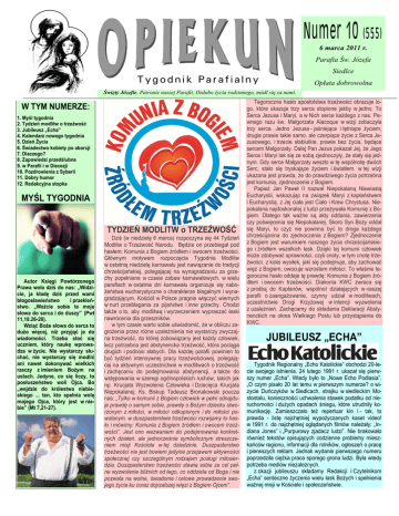 Numer 10 (555) 6 marca 2011 r. Parafia Św. Józefa Siedlce Tygodnik Parafialny Opłata dobrowolna Święty Józefie, Patronie naszej Parafii, Ozdobo życia rodzinnego, módl się za nami. W TYM NUMERZE: 1. Myśl tygodnia 2. Tydzień modlitw o trzeźwość 3. Jubileusz „Echa” 4. Kalendarz nowego tygodnia 5. Dzień Życia 6. Świadectwo kobiety po aborcji 7. Dlaczego? 8. Zapowiedzi przedślubne 9. w Parafii i w Diecezji 10. Pozdrowienia z Syberii 11. Dobry humor 12. Redakcyjna stopka MYŚL TYGODNIA TYDZIEŃ MODLITW o TRZEŹWOŚĆ Autor Księgi Powtórzonego Prawa woła dziś do nas: „Widzicie, ja kładę dziś przed wami błogosławieństwo i przekleństwo. „Weźcie sobie te moje słowa do serca i do duszy” (Pwt 11,18.26-28). Wziąć Boże słowa do serca to dużo więcej, niż przyjąć je do wiadomości. Trzeba stać się uczniem, który naukę wprowadza w życie. Nie wystarczy słuchać, nie wystarczy się modlić ani nawet dokonywać wielkich rzeczy z imieniem Bożym na ustach. Jedyne, co się liczy, to posłuszeństwo woli Ojca. Bo „wejdzie do królestwa niebieskiego ... ten, kto spełnia wolę mojego Ojca, który jest w niebie” (Mt 7,21-27). Dziś (w niedzielę 6 marca) rozpoczyna się 44 Tydzień Modlitw o Trzeźwość Narodu. Będzie on przebiegał pod hasłem: Komunia z Bogiem źródłem i owocem trzeźwości. Głównym motywem rozpoczęcia Tygodnia Modlitw w ostatnią niedzielę karnawału jest nawiązanie do tradycji chrześcijańskiej, polegającej na wynagradzaniu za grzechy popełniane w czasie zabaw karnawałowych. w wielu parafiach w ostatnie dni karnawału organizuje się nabożeństwa eucharystyczne o charakterze błagalnym i wynagradzającym. Kościół w Polsce pragnie włączyć wiernych w nurt przebłagania za pijaństwo i inne grzechy. Chodzi także o to, aby modlitwą i wyrzeczeniem wypraszać łaski nawrócenia dla grzeszników. w tym czasie warto sobie uświadomić, że w obliczu zagrożenia przez różne uzależnienia nie wystarczy zwyczajna trzeźwość, do której zobowiązany jest każdy człowiek, lecz potrzebna jest abstynencka trzeźwość, która pociąga drugich i podnosi słabych. Dla każdej parafii powinien to być tydzień intensywnej pracy trzeźwościowej, polegającej na aktywnym uczestnictwie w modlitwach o trzeźwość i zachęcaniu do podejmowania abstynencji, a także do wstępowania w szeregi ogólnopolskich ruchów, takich jak np. Krucjata Wyzwolenia Człowieka i Dziecięca Krucjata Niepokalanej. Ks. Biskup Tadeusz Bronakowski poucza nas: „Tylko w komunii z Bogiem człowiek w pełni odnajduje prawdę o samym sobie, prawdę o Bożym dziecku stworzonym z miłości, w miłości odkupionym i do miłości powołanym. w duszpasterstwie trzeźwości rozwijamy to hasło i mówimy: Komunia z Bogiem źródłem i owocem trzeźwości”. Jest ono wezwaniem do podejmowania konkretnych działań, ale jednocześnie symbolicznym streszczeniem misji Kościoła w tej dziedzinie. Duszpasterstwo trzeźwości nie jest bowiem jedynie przejawem aktywności społecznej czy szczególnym rodzajem posługi miłosierdzia. Duszpasterstwo trzeźwości stawia sobie za cel pełne wyzwolenie bliźnich od tego, co oddziela od Boga i nie pozwala na wolne, świadome i celowe prowadzenie swojego życia ku coraz dojrzalszej więzi z Bogiem Ojcem”. Tegoroczne hasło apostolstwa trzeźwości obrazuje logo, które ukazuje trzy serca stopione jakby w jedno. To Serca Jezusa i Maryi, a w Nich serce każdego z nas. Pewnego razu św. Małgorzata Alacoque w wizji zobaczyła trzy serca. Jedno Jezusa - jaśniejące i tętniące życiem, drugie prawie takie samo, ale czerpiące życie z Serca Jezusowego, i trzecie słabiutkie, prawie bez życia, będące sercem Małgorzaty. Dalej Pan Jezus pokazał Jej, że Jego Serce i Maryi tak się ze sobą zjednoczyły, że stały się jednym. Gdy serce Małgorzaty weszło w tę wspólnotę dwóch Serc, stało się tryskające życiem i światłem. w tej wizji ukazana jest prawda, że do prawdziwego życia potrzebna jest komunia, zjednoczenie z Bogiem. Papież Jan Paweł II nazwał Niepokalaną Niewiastą Eucharystii, wskazując na związek Maryi z kapłaństwem i Eucharystią. z Jej ciała jest Ciało i Krew Chrystusa. Niepokalana najdoskonalej z ludzi przeżywała Komunię z Bogiem. Dlatego tak ważne są akty oddania, zawierzenia czy poświęcenia się Niepokalanej. Skoro Syn Boży oddał się Maryi, to czyż nie powinna być to droga każdego chrześcijanina do zjednoczenia z Bogiem? Zjednoczenie z Bogiem jest warunkiem naszego życia chrześcijańskiego i źródłem wszelkich łask. Dzięki tej komunii człowiek może zdobywać sprawności, czyli cnoty, w tym cnotę trzeźwości. z kolei wysiłek, jaki się podejmuje, aby zachować więź z Bogiem, owocuje wzrostem miłości. To właśnie tegoroczne hasło oddaje tę prawdę: Komunia z Bogiem źródłem i owocem trzeźwości. Diakonia KWC zwraca się z prośbą do Kapłanów, wspólnot działających w naszej parafii o zaangażowanie, czynny udział w modlitwach, uczestnictwie Drogi Krzyżowej w intencji wyzwolenia z uzależnień. Zachęcamy do składania Deklaracji Abstynenckich na okres Wielkiego Postu lub przystąpienia do KWC. JUBILEUSZ „ECHA” Tygodnik Regionalny „Echo Katolickie” obchodzi 20-lecie swojego istnienia. 24 lutego 1991 r. ukazał się pierwszy numer „Echa”. Wtedy było to „Nowe Echo Podlasia”. „O czym pisało 20 lat temu w pierwszym numerze? o wizycie Duńczyków w Siedlcach, strajku w siedleckim Mostostalu, konieczności uchwalenia stawek podatku od nieruchomości i dużych opadach śniegu, które utrudniły komunikację. Zamieszczało też repertuar kin i - tak, to prawda - listę najchętniej wypożyczanych kaset video! w 1991 r. do najchętniej oglądanych filmów należały: „Indiana Jones” i „Purpurowy zjadacz ludzi”. Nie brakowało również tekstów opisujących codzienne problemy mieszkańców regionu, informacji dla rolników, o
