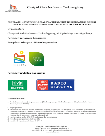Olsztyński Park Naukowo - Technologiczny Tel. REGULAMIN KONKURSU NA OPRACOWANIE PROJEKTU KONCEPCYJNEGO ŚCIEŻKI EDUKACYJNEJ W OLSZTYŃSKIM PARKU NAUKOWO- TECHNOLOGICZNYM Organizator: Olsztyński Park Naukowo – Technologiczny, ul. Trylińskiego 2 10-683 Olsztyn Patronat honorowy konkursu: Prezydent Olsztyna - Piotr Grzymowicz Patronat medialny konkursu: Przedmiot konkursu: 1. Przedmiotem konkursu jest opracowanie projektu koncepcyjnego ścieżki edukacyjnej w Olsztyńskim Parku Naukowo – Technologicznym (OPN-T). 2. Projekt powinien: 1) odzwierciedlać charakter oraz cel działalności instytucji jaką jest park technologiczny - to miejsce dla przedsiębiorstw i instytucji naukowych, w którym stymuluje się i zarządza przepływem wiedzy i technologii pomiędzy uczelniami wyższymi, instytucjami badawczo-rozwojowymi, przedsiębiorstwami oraz rynkiem, wspiera tworzenie i rozwój przedsiębiorstw innowacyjnych przy pomocy procesów inkubacyjnych. 2) nawiązywać do profilu OPN-T: IT, geoinformatyka, biotechnologia 3) być ekologiczny, przyjazny dla środowiska 4) znajdować się na terenach zielonych OPN-T Olsztyński Park Naukowo-Technologiczny 10-683 Olsztyn, ul. Władysława Trylińskiego 2 tel. +48 89 612 05 00, e-mail: [email protected] www.opnt.olsztyn.pl Olsztyński Park Naukowo - Technologiczny Tel. 5) być dostępny, oryginalny i atrakcyjny zarówno dla dzieci jak i dorosłych 6) koszt realizacji projektu nie może przekroczyć 50 tys. PLN Warunki uczestnictwa w konkursie: 1. Konkurs skierowany jest do studentów kierunków projektowych, w szczególności kierunku wzornictwo, wszystkich uczelni w Polsce. Każdy z autorów zobowiązany jest dostarczyć wraz z kartą zgłoszeniową zaświadczenie o posiadaniu statusu studenta określonego kierunku. 2. Regulamin, plan przestrzenny terenów OPN-T oraz kartę zgłoszeniową można pobrać ze strony internetowej organizatora www.opnt.olsztyn.pl. 3. Projekty mogą być zgłaszane w dowolnej ilości indywidualnie lub zespołowo. 4. Projekty musza być przygotowane zgodnie z regulaminem konkursu. 5. Udział w konkursie jest bezpłatny. 6. Uczestnictwo w konkursie jest jednoznaczne z akceptacją warunków Konkursu. 7. Nagroda zostanie przekazana na konto laureata po ogłoszeniu wyników konkursu. 8. Przyznana nagroda zostanie pomniejszona o podatki zgodnie z obowiązującymi przepisami prawa i wypłacone w terminie 14 dni od daty ogłoszenia wyników konkursu. Termin i miejsce nadsyłania projektów: 1. Termin składania projektów: do dnia 09.12.2015 r. (decyduje data dostarczenia przesyłki) 2. Miejsce składania projektów: Olsztyński Park Naukowo –Technologiczny ul. Trylińskiego 2 10-683 Olsztyn, sekretariat pok. 5 z dopiskiem „ścieżka edukacyjna OPN-T – konkurs” 3. Projekty konkursowe (plansze, CD) musza być oznaczone kodem, dowolnie wybranym przez autora umieszczonym na odwrocie każdego projektu (w prawym górnym rogu) 4. W oddzielnej kopercie należy dostarczyć kartę zgłoszeniową Harmonogram konkursu: 21.10.2015 r. – ogłoszenie konkursu 09.12.2015 r. – zakończenie przyjmowania zgłoszeń 10.12.2015 r. – obrady Jury (data może ulec zmianie ) 11.12.2015 r. – godz. 13.00 ogłoszenie wyników konkursu. Otwarcie wystawy pokonkursowej(data może ulec zmianie). 05.01.2015 r. – zakończenie wystawy pokonkursowej Forma prezentacji pracy konkursowej 1. projekt konkursowy musi składać się z części prezentacyjnej wraz z częścią opisową w języku polskim 2. Nadesłane projekty konkursowe powinny przede wszystkim charakteryzować się wysokim poziomem estetycznym, nowatorską formą oraz oryginalnością. 3. Część prezentacyjna projektu musi: 1) Zawierać jego wizualizację (do wyboru: fotografia, rysunki, rendering, makieta) – plansze rozmiaru min. A3 podklejone na piance lub wydrukowane na papierze min. 300 g. 2) Do dokumentacji należy dołączyć płytę CD z prezentacją projektu oraz w przypadku projektu w postaci fotografii, rysunku, renderingu, zapisem elektronicznym plansz. W formacie .TIFF 300 dpi oraz .PDF 300 dpi 4. Część opisowa projektu musi zawierać: 1) Nazwę i krótki opis projektu wykazujący zgodność projektu z oczekiwaniami Organizatora określonymi w punkcie Przedmiot Konkursu. 2) Wskazanie materiałów oraz dane techniczne poszczególnych elementów projektu. 3) Szacunkowy kosztorys realizacji projektu , nie przekraczający kwoty wskazanej w punkcie Przedmiot Konkursu. 5. Każdy plik prezentacyjny zapisany na CD powinien zawierać w nazwie kod autora orz nr planszy np. xxxxx_1, xxxx_2 6. Umieszczenie w projekcie konkursowym informacji ujawniającej tożsamość autora, dyskwalifikuje nadesłany projekt. 7. Dostarczone kody zostaną rozszyfrowane po wyłonieniu zwycięzcy konkursu. 8. Projekty Konkursowe, nie spełniające wymagań lub nadesłane po terminie nie podlegają uczestnictwo w konkursie. Kryteria oceny Projektów Konkursowych: 1. Zgodność z założeniami konkursu 2. Innowacyjność i oryginalność Olsztyński Park Naukowo-Technologiczny 10-683 Olsztyn, ul. Władysława Trylińskiego 2 tel. +48 89 612 05 00, e-mail: [email protected] www.opnt.olsztyn.pl Olsztyński Park Naukowo - Technologiczny Tel. 3. Walory estetyczne Jury: 1. Projekty biorące udział w konkursie oceniać będzie Jury w składzie powołanym przez Organizatora Konkursu 2. Jury dokonuje oceny projektów konkursowych w oparciu o kryteria zawarte w Regulaminie Konkursu 3. Z przebiegu obrad Jury sporządzony zostanie protokół zawierający dane zwycięzców 4. Decyzje Jury są ostateczne i niepowtarzalne 5. Organizator zastrzega sobie prawo do zmiany składu Jury Nagrody: 1. 2. 3. Organizator ufunduje 1 nagrodę w wysokości 4 000,00 PLN Autorzy wyróżnionych projektów otrzymają dyplomy Organizator zapewnia medialną promocję nagrodzonego projektu Rozstrzygnięcie Konkursu i Wystawa 1. Planowana data ogłoszenia wyników to 11.12.2015 r. godzina 13.00 w czasie otwarcia wystawy pokonkursowe