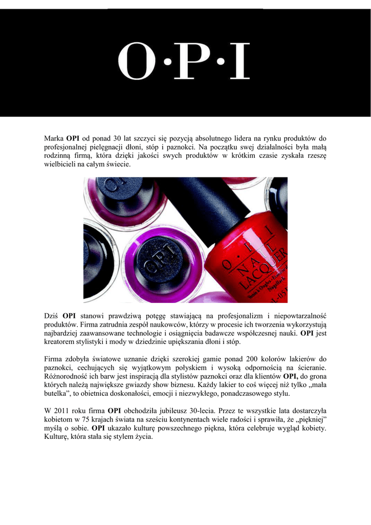 Marka OPI od ponad 30 lat szczyci się pozycją absolutnego lidera na rynku produktów do profesjonalnej pielęgnacji dłoni, stóp i paznokci. Na początku swej działalności była małą rodzinną firmą, która dzięki jakości swych produktów w krótkim czasie zyskała rzeszę wielbicieli na całym świecie. Dziś OPI stanowi prawdziwą potęgę stawiającą na profesjonalizm i niepowtarzalność produktów. Firma zatrudnia zespół naukowców, którzy w procesie ich tworzenia wykorzystują najbardziej zaawansowane technologie i osiągnięcia badawcze współczesnej nauki. OPI jest kreatorem stylistyki i mody w dziedzinie upiększania dłoni i stóp. Firma zdobyła światowe uznanie dzięki szerokiej gamie ponad 200 kolorów lakierów do paznokci, cechujących się wyjątkowym połyskiem i wysoką odpornością na ścieranie. Różnorodność ich barw jest inspiracją dla stylistów paznokci oraz dla klientów OPI, do grona których należą największe gwiazdy show biznesu. Każdy lakier to coś więcej niż tylko „mała butelka”, to obietnica doskonałości, emocji i niezwykłego, ponadczasowego stylu. W 2011 roku firma OPI obchodziła jubileusz 30-lecia. Przez te wszystkie lata dostarczyła kobietom w 75 krajach świata na sześciu kontynentach wiele radości i sprawiła, że „piękniej” myślą o sobie. OPI ukazało kulturę powszechnego piękna, która celebruje wygląd kobiety. Kulturę, która stała się stylem życia. NAGRODY OPI LAUREATEM NAGRODY JOY TRENDY 2015 Marka otrzymała nominację w kategorii Uroda za innowacyjny produkt Infinite Shine by OPI, czyli lakier do paznokci o trwałości i mocy żelu kolorowego GLAMMIES 2015 DLA OPI INFINITE SHINE OPI otrzymało nominację dla najlepszego produktu w kategorii lakier luksusowy, przyznawanego przez magazyn Glamour. Marka otrzymała tytuł Glammies 2015 za innowacyjny produkt Infinite Shine by OPI, czyli lakier do paznokci o trwałości i mocy żelu kolorowego. NAJNOWSZA KOLEKCJA LAKIERÓW OPI JESIEŃ/ZIMA 2015 - VENICE Wenecka kolekcja lakierów pokazuje też nowy, wyraźny trend w doborze kolorów na chłodne pory roku. Jasne i pastelowe odcienie nie są już przypisane wyłącznie do wiosny czy lata, ale nosimy je przez cały rok.