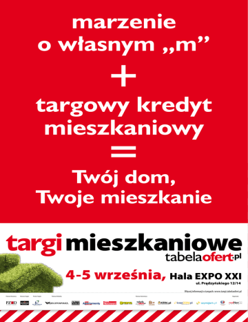 marzenie o własnym „m” targowy kredyt mieszkaniowy Twój dom, Twoje mieszkanie 4-5 września, Hala EXPO XXI ul. Prądzyńskiego 12/14 Więcej informacji o targach: www.targi.tabelaofert.pl Patronat Honorowy Mecenas Targów Partner Targów Patronat Medialny Patronat Internetowy Organizator koniecznie zobacz! 4-5 września, Hala Expo ACCIONA NIERUCHOMOŚCI wilanów - atmosfera apartamenty APM Poland OSLEDLE WOLICA BOUYGUES IMMOBILIER LE VILLAGE - etap Villa CREATION BUDIMEX NIERUCHOMOŚCI OSIEDLE IDZIKOWSKIEGO Dom Development Miasteczko Regaty DOMPOL OSADA KAMPINOS EBB NIERUCHOMOŚCI OSIEDLE GRAFITOWE ECC REAL ESTATE PUŁAWSKA 111 GANT DEVELOPMENT KASKADA NA WOLI HTC INVEST KASZMIROWY DOM KREATOR DOM OSIEDLE ROXANA MAGNOLIA OSIEDLE MAGNOLIA MELITA INVESTMENTS RIVERSIDE APARTMENTS MILL-YON AURA PARK PRO URBA 19. DZIELNICA RED DEVELOPMENT OSIEDLE ALPHA prestige Osiedle róż ROBYG CITY APARTMENTS ROGOWSKI DEVELOPMENT Apartamenty Mińska Trafo RONSON DEVELOPMENT VERDIS HITY, RABATY, PROMOCJE: nowe inwestycje na rynku: Na targach mieszkaniowych tabelaofert.pl możecie Państwo zakupić mieszkanie, dom lub wziąć kredyt w KORZYSTNYCH warunkach. Nasi Wystawcy przygotowują specjalne promocje dostępne wyłącznie na targach. Poniżej wybrane z nich: APM POLAND | W dniach trwania targów czyli 4 - 5 września wszyscy klienci, którzy dokonają zakupu domu wykończonego czyli w stanie developerskim otrzymają od firmy APM POLAND samochód osobowy marki KREATOR DOM | OSIEDLE ROXANA, ul. Wietrzna 109 Osiedle Roxana to zespół 36 jednorodzinnych segmentów w zabudowie bliźniaczej. Przyszli nabywcy znajdą tu lokale o powierzchni od 132,62 mkw. do 161,81 mkw. z dużymi, prywatnymi działkami o powierzchni od 180 mkw. do 368 mkw. Wnętrza domów zaprojektowano z dużą starannością i dbałością o komfort życia przyszłych mieszkańców. Dopełnieniem konstrukcji są duże okna dające dobre oświetlenie wnętrz. Volkswagen Polo, wersja pięcio drzwiowa, który to otrzymał prestiżową nagrodę „Car of the year 2010” w swojej klasie. Jednocześnie powyższej promocji podlegają klienci, którzy nawiążą kontakt z naszą firmą na targach a zakupu domu dokonają w terminie późniejszym. Promocja ważna do dnia 31 października. Klienci którzy zdecydują się natomiast na wariant domu wykończonego tylko na zewnątrz natomiast bez instalacji wewnętrznych, tynków, wykończeń poddaszy czyli w stanie surowym wewnątrz dający możliwość własnej aranżacji i wykonania według RONSON DEVELOPMENT | VERDIS, ul. Sowińskiego/Szulborska; Warszawa W pierwszym etapie projekt zakłada budowę trzech budynków mieszkalnych ze 128 mieszkaniami, zaś całościowo osiedle Verdis obejmuje osiem budynków i 346 mieszkań o funkcjonalnych, szytych na miarę Twoich potrzeb, rozkładach. Prosta i klasyczna struktura, idealnie wkomponowana w otaczającą zieleń, bogactwo okolicznych parków i przestrzeń. Mieszkania o powierzchni od 42 do 108 mkw. swoich upodobań materiałowych mogą liczyć na duże upusty cenowe sięgające 12 % ceny targowej. DOMPOL | DOM = MIESZKANIE ROZLICZENIU – szczegóły na stoisku nr 22 (mieszkania do 40mkw. w Warszawie lub w Płońsku). CENY SPECJALNE dla odwiedzających targi w osiedlach OSADA KAMPINOS w Starych Grochalach oraz SYMFONIA HTC INVEST | Promocyjna cena domów o powierzchni 175mkw. w cenie 850 000 zł. RONSON DEVELOPMENT | SAKURA, ul. Kobłucka; Warszawa Tu znajdziesz to, czego szukasz- naturalny odpoczynek, harmonię ciała i ducha... Łącznie na terenie osiedla przewidziane są 4 budynki, które będą realizowane etapowo. W pierwszym etapie powstanie jeden budynek o XI-kondygnacjach naziemnych i jednej kondygnacji garażu podziemnego. W budynku zostało zaprojektowanych 99 mieszkań o najbardziej poszukiwanych na rynku metrażach od 51 mkw. do 85 mkw. RONSON DEVELOPMENT | NATURALIS, ul. Wiślana i Fabryczna; Łomianki „Naturalis” to nowoczesny projekt położony w pobliżu licznych terenów zielonych w tym Kampinoskiego Parku Krajobrazowego. Projekt będzie realizowany w czterech etapach i przewiduje niską 3-piętrową zabudowę wraz z halą garażową i komórkami lokatorskimi na poziomie -1. Na działce o powierzchni 31800 mkw. łącznie przewidzianych jest 11 budynków – 500 mieszkań. W pierwszym etapie zostanie zrealizowany jeden budynek – łącznie 52 mieszkania. ROGOWSKI DEVELOPMENT | APARTAMENTY MIŃSKA TARFO, ul. Mińska; Warszawa Inwestycja położona jest w części dzielnicy, gdzie niedawno zrealizowane zespoły apartamentowców komponują się z urokliwymi zabytkami Pragi. Ciekawostką jest obecność na terenie inwestycji najstarszej warszawskiej stacji trafo. To piękny zabytek industrialny świadczący o rozwoju prawobrzeżnej Warszawy został wybudowany w 1929 r. Teraz ma szanse na drugą młodość. Mieszkania od 40 do 130 mkw. UNIDEVELOPMENT | POINT HOUSE, ul. Rzymowskiego, Pallutha i Al. Wyścigowej – Warszawa Point House graniczy bezpośrednio z zabytkowym Torem Wyścigów Konnych na Służewcu (140 ha zielonej enklawy w sercu miasta), a od zachodniej z Potokiem Służewieckim i niską zabudową wielorodzinną. W Point House będzie 236 mieszkań o podwyższonym standardzie wykończenia, 250 miejsc postojowych w garażu podziemnym oraz 7 lokali usługowych. Do wyboru mieszkania od 38 do 119 mkw. (1-5 pokoi).