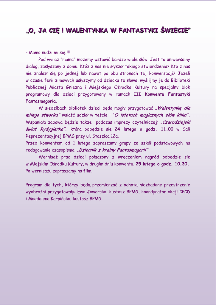 „„O O,, J JA A CCIIĘ Ę !! W WA ALLE EN NT TY YN NKKA AW W FFA AN NT TA AS ST TY YKKII Ś ŚW WIIE ECCIIE E”” - Mamo nudzi mi się !!! Pod wyraz "mama" możemy wstawić bardzo wiele słów. Jest to uniwersalny dialog, zasłyszany z domu. Któż z nas nie słyszał takiego stwierdzenia? Kto z nas nie znalazł się po jednej lub nawet po obu stronach tej konwersacji? Jeżeli w czasie ferii zimowych usłyszymy od dziecka te słowa, wyślijmy je do Biblioteki Publicznej Miasta Gniezna i Miejskiego Ośrodka Kultury na specjalny blok programowy dla dzieci przygotowany w ramach III Konwentu Fantastyki Fantasmagoria. W siedzibach bibliotek dzieci będą mogły przygotować „Walentynkę dla miłego stworka” wsiąść udział w teście : ”O istotach magicznych słów kilka”, Wspaniała zabawa będzie także podczas imprezy czytelniczej: „Czarodziejski świat Rydygierka”, która odbędzie się 24 lutego o godz. 11.00 w Sali Reprezentacyjnej BPMG przy ul. Staszica 12a. Przed konwentem od 1 lutego zapraszamy grupy ze szkół podstawowych na redagowanie czasopisma: „Dziennik z krainy Fantasmagorii” Wernisaż prac dzieci połączony z wręczeniem nagród odbędzie się w Miejskim Ośrodku Kultury, w drugim dniu konwentu, 25 lutego o godz. 10.30. Po wernisażu zapraszamy na film. Program dla tych, którzy będą przemierzać z ochotą niezbadane przestrzenie wyobraźni przygotowały: Ewa Jaworska, kustosz BPMG, koordynator akcji CPCD i Magdalena Karpińska, kustosz BPMG.