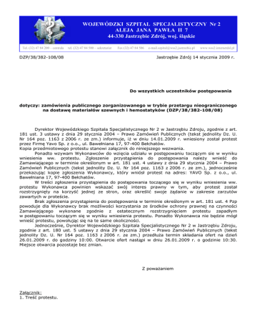 WOJEWÓDZKI SZPITAL SPECJALISTYCZNY Nr 2 ALEJA JANA PAWŁA II 7 44-330 Jastrzębie Zdrój, woj. śląskie Tel. (32) 47 84 200 – centrala DZP/38/382-108/08 tel. (32) 47 84 500 – sekretariat Fax (32) 47 84 506 [email protected] www.wss2.internetdsl.pl Jastrzębie Zdrój 14 stycznia 2009 r. Do wszystkich uczestników postępowania dotyczy: zamówienia publicznego zorganizowanego w trybie przetargu nieograniczonego na dostawę materiałów szewnych i hemostatyków (DZP/38/382-108/08) Dyrektor Wojewódzkiego Szpitala Specjalistycznego Nr 2 w Jastrzębiu Zdroju, zgodnie z art. 181 ust. 3 ustawy z dnia 29 stycznia 2004 – Prawo Zamówień Publicznych (tekst jednolity Dz. U. Nr 164 poz. 1163 z 2006 r. ze zm.) informuje, iŜ w dniu 14.01.2009 r. wniesiony został protest przez Firmę Yavo Sp. z o.o., ul. Bawełniana 17, 97-400 Bełchatów. Kopia przedmiotowego protestu stanowi załącznik do niniejszego wezwania. Ponadto wzywam Wykonawców do wzięcia udziału w postępowaniu toczącym sie w wyniku wniesienia ww. protestu. Zgłoszenie przystąpienia do postępowania naleŜy wnieść do Zamawiającego w terminie określonym w art. 181 ust. 4 ustawy z dnia 29 stycznia 2004 – Prawo Zamówień Publicznych (tekst jednolity Dz. U. Nr 164 poz. 1163 z 2006 r. ze zm.), jednocześnie przekazując kopie zgłoszenia Wykonawcy, który wniósł protest na adres: YAVO Sp. z o.o., ul. Bawełniana 17, 97-400 Bełchatów. W treści zgłoszenia przystąpienia do postępowania toczącego się w wyniku wniesienia ww. protestu Wykonawca powinien wskazać swój interes prawny w tym, aby protest został rozstrzygnięty na korzyść jednej ze stron, oraz określić swoje Ŝądanie w zakresie zarzutów zawartych w proteście. Brak zgłoszenia przystąpienia do postępowania w terminie określonym w art. 181 ust. 4 Pzp powoduje dla Wykonawcy brak moŜliwości korzystania ze środków ochrony prawnej na czynności Zamawiającego wykonane zgodnie z ostatecznym rozstrzygnięciem protestu zapadłym w postępowaniu toczącym się w wyniku wniesienia protestu. Ponadto Wykonawca nie będzie mógł wnieść protestu, powołując się na te same okoliczności. Jednocześnie, Dyrektor Wojewódzkiego Szpitala Specjalistycznego Nr 2 w Jastrzębiu Zdroju, zgodnie z art. 180 ust. 5 ustawy z dnia 29 stycznia 2004 – Prawo Zamówień Publicznych (tekst jednolity Dz. U. Nr 164 poz. 1163 z 2006 r. ze zm.) przedłuŜa termin składania ofert na dzień 26.01.2009 r. do godziny 10:00. Otwarcie ofert nastąpi w dniu 26.01.2009 r. o godzinie 10:30. Miejsce otwarcia pozostaje bez zmian. Z powaŜaniem Załącznik: 1. Treść protestu.