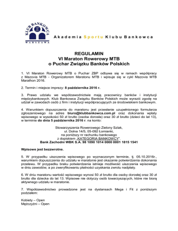 REGULAMIN VI Maraton Rowerowy MTB o Puchar Związku Banków Polskich 1. VI Maraton Rowerowy MTB o Puchar ZBP odbywa się w ramach współpracy z Mazovia MTB - Organizatorem Maratonu MTB i wpisuje się w cykl Mazovia MTB Marathon 2016. 2. Termin i miejsce imprezy: 8 października 2016 r. 3. Prawo udziału we współzawodnictwie mają pracownicy banków i instytucji międzybankowych. Klub Bankowca Związku Banków Polskich może wyrazić zgodę na udział w zawodach osób z firm i instytucji współpracujących ze środowiskiem bankowym. 4. Warunkiem dopuszczenia do maratonu jest przesłanie uzupełnionego formularza zgłoszeniowego na adres [email protected] oraz dokonania wpłaty wpisowego w wysokości 50 zł brutto (osoba dorosła) oraz 30 zł brutto (dzieci do lat 13), w terminie do dnia 5 października 2016 r. na konto: Stowarzyszenia Rowerowego Zielony Szlak, ul. Dolna 14/5, 05-092 Łomianki, na poniższy nr rachunku bankowego z dopiskiem „KATEGORIA BANKOWCY”. Bank Zachodni WBK S.A. 98 1090 1014 0000 0001 1815 1541 Wpisowe jest bezzwrotne. 5. W przypadku uiszczenia wpisowego po wyznaczonym terminie, tj. 05.10.2016r., warunkiem dopuszczenia do udziału w maratonie jest okazanie potwierdzenia dokonania przelewu. W przypadku braku potwierdzenia istnieje możliwość uiszczenia wpisowego w dniu zawodów, a po zweryfikowaniu płatności uzyskania zwrotu nadpłaty. 6. W dniu maratonu wartość wpisowego wynosi 50 zł brutto dla osoby dorosłej oraz 30 zł brutto dla dziecka do lat 13. Wpisowe nie dotyczy osób towarzyszących, które nie biorą aktywnego udziału w maratonie. 7. Współzawodnictwo prowadzone jest na dystansach Mega i Fit z poniższym podziałem: Kobiety – Open Mężczyźni – Open 8. Podczas zawodów obowiązuje regulamin Mazovia MTB Marathon 2016. 9. Opłata startowa płatna w dniu maratonu 50 zł - start na dystansach Fit, Mega 30 zł dzieci do lat 13 start na dystansie Hobby 20 zł - zestaw startowy obowiązują numery startowe z cyklu Mazovia MTB Marathon 2016. 10. Zawodnicy startują na własną odpowiedzialność i zobowiązani są do przestrzegania regulaminu Organizatora. 11. Dekoracja zwycięzców na wymienionych dystansach z podziałem na kategorie wiekowe zostanie przeprowadzona po zawodach. Dekorowane będą pierwsze trzy osoby z każdej kategorii wiekowej. 12. Punktacja będzie liczona zgodnie z zasadami cyklu głównego Mazovia MTB Marathon 2016. 13. W przypadkach spornych i nie ujętych w regulaminie, stosuje się regulamin Mazovia MTB Marathon, a decyzje podejmie Sędzia Główny w porozumieniu z Organizatorem. Klub Bankowca Związek Banków Polskich Regulamin V Maratonu Rowerowego MTB o Puchar ZBP – Akademia Sportu Klubu Bankowca 2015r.