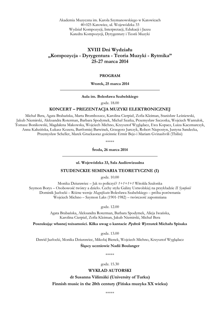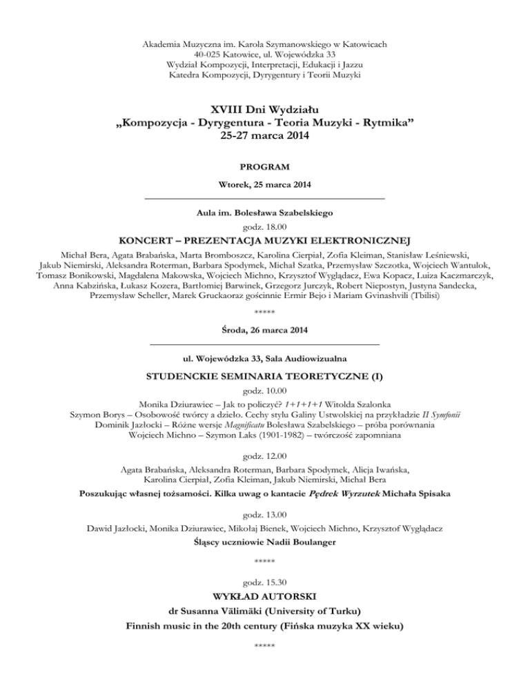 Akademia Muzyczna im. Karola Szymanowskiego w Katowicach 40-025 Katowice, ul. Wojewódzka 33 Wydział Kompozycji, Interpretacji, Edukacji i Jazzu Katedra Kompozycji, Dyrygentury i Teorii Muzyki XVIII Dni Wydziału „Kompozycja - Dyrygentura - Teoria Muzyki - Rytmika” 25-27 marca 2014 PROGRAM Wtorek, 25 marca 2014 _____________________________________________ Aula im. Bolesława Szabelskiego godz. 18.00 KONCERT – PREZENTACJA MUZYKI ELEKTRONICZNEJ Michał Bera, Agata Brabańska, Marta Bromboszcz, Karolina Cierpiał, Zofia Kleiman, Stanisław Leśniewski, Jakub Niemirski, Aleksandra Roterman, Barbara Spodymek, Michał Szatka, Przemysław Szczotka, Wojciech Wantulok, Tomasz Bonikowski, Magdalena Makowska, Wojciech Michno, Krzysztof Wyglądacz, Ewa Kopacz, Luiza Kaczmarczyk, Anna Kabzińska, Łukasz Kozera, Bartłomiej Barwinek, Grzegorz Jurczyk, Robert Niepostyn, Justyna Sandecka, Przemysław Scheller, Marek Gruckaoraz gościnnie Ermir Bejo i Mariam Gvinashvili (Tbilisi) ***** Środa, 26 marca 2014 ___________________________________________ ul. Wojewódzka 33, Sala Audiowizualna STUDENCKIE SEMINARIA TEORETYCZNE (I) godz. 10.00 Monika Dziurawiec – Jak to policzyć? 1+1+1+1 Witolda Szalonka Szymon Borys – Osobowość twórcy a dzieło. Cechy stylu Galiny Ustwolskiej na przykładzie II Symfonii Dominik Jazłocki – Różne wersje Magnificatu Bolesława Szabelskiego – próba porównania Wojciech Michno – Szymon Laks (1901-1982) – twórczość zapomniana godz. 12.00 Agata Brabańska, Aleksandra Roterman, Barbara Spodymek, Alicja Iwańska, Karolina Cierpiał, Zofia Kleiman, Jakub Niemirski, Michał Bera Poszukując własnej tożsamości. Kilka uwag o kantacie Pędrek Wyrzutek Michała Spisaka godz. 13.00 Dawid Jazłocki, Monika Dziurawiec, Mikołaj Bienek, Wojciech Michno, Krzysztof Wyglądacz Śląscy uczniowie Nadii Boulanger ***** godz. 15.30 WYKŁAD AUTORSKI dr Susanna Välimäki (University of Turku) Finnish music in the 20th century (Fińska muzyka XX wieku) ***** (Środa, 26 marca 2014 – cd.) _______________________________________ ul. Wojewódzka 33, Aula im. Bolesława Szabelskiego godz. 18.00 KONCERT STUDENTÓW KLAS KOMPOZYCJI Tomasz Bonikowski, Grzegorz Jurczyk, Anna Kabzińska, Stanisław Leśniewski, Wojciech Michno, Robert Niepostyn, Michał Szatka, Przemysław Szczotka, Krzysztof Wyglądacz Wykonawcy: soliści, zespoły kameralne, Chór AM i Orkiestra Muzyki Nowej – dyr. Szymon Bywalec ***** Czwartek, 27 marca 2014 ___________________________________________ ul. Wojewódzka 33, Sala Audiowizualna STUDENCKIE SEMINARIA TEORETYCZNE (II) godz. 9.30 Agnieszka Bagińska – Bolesław Szabelski jako przedstawiciel polskiego neobaroku Dorota Pieniążek – De Tijd Louisa Andriessena – muzyczny traktat o czasie Ewelina Wilburg-Marzec – Wierny sobie – przemiany stylu kompozytorskiego Wojciecha Kilara godz. 11.00 Aleksandra Kruż, Karolina Glenc, Paulina Kucharczyk, Agnieszka Podsiadło, Szymon Reichel Formy koncertujące w twórczości Bolesława Woytowicza, Józefa Świdra i Witolda Szalonka godz. 12.15 Bartłomiej Barwinek, Maciej Cisowski, Luiza Kaczmarczyk, Ewa Kopacz, Łukasz Kozera, Justyna Sandecka Anton Webern – muzyka, natura, transcendencja ***** godz. 14.00 Spotkanie informacyjne dla kandydatów na studia na kierunku Kompozycja, dyrygentura i teoria muzyki ***** godz. 15.30 WYKŁAD AUTORSKI Prof. Marta Szoka (Akademia Muzyczna w Łodzi) George Crumb – kompozytor amerykański (?) ***** ul. Krasińskiego 27, Dom Studenta „Parnas”, Sala Teatralna godz. 18.00 KONCERT INTERPRETACJI RUCHOWYCH MUZYKI ORAZ IMPROWIZACJI FORTEPIANOWEJ Utwory: Wolfgang Amadeus Mozart, Karol Szymanowski, Toru Takemitsu, György Ligeti, Olga Kozłowska Improwizacje fortepianowe: Monika Litwin, Marta Kleszcz, Katarzyna Kobielska, Agnieszka Podsiadło, Zuzanna Pałka, Katarzyna Zegarek, Anna Januszewska Wykonawcy: studentki Zakładu Rytmiki, Teatr Rytmu „Katalog” oraz zaproszeni goście *****