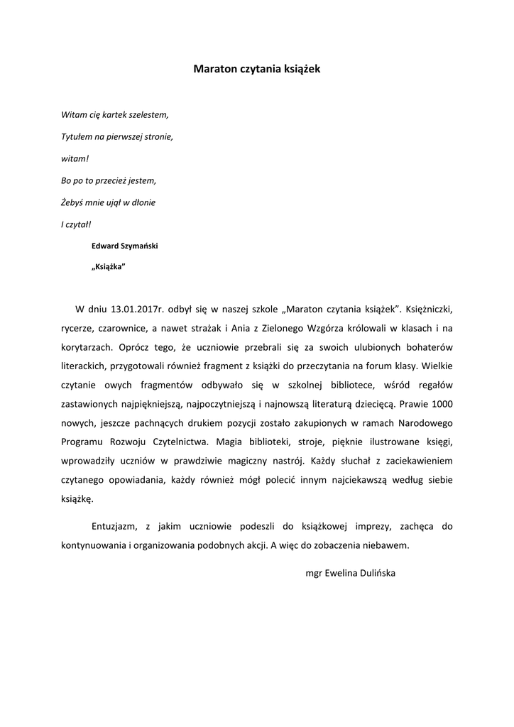 Maraton czytania książek Witam cię kartek szelestem, Tytułem na pierwszej stronie, witam! Bo po to przecież jestem, Żebyś mnie ujął w dłonie I czytał! Edward Szymański „Książka” W dniu 13.01.2017r. odbył się w naszej szkole „Maraton czytania książek”. Księżniczki, rycerze, czarownice, a nawet strażak i Ania z Zielonego Wzgórza królowali w klasach i na korytarzach. Oprócz tego, że uczniowie przebrali się za swoich ulubionych bohaterów literackich, przygotowali również fragment z książki do przeczytania na forum klasy. Wielkie czytanie owych fragmentów odbywało się w szkolnej bibliotece, wśród regałów zastawionych najpiękniejszą, najpoczytniejszą i najnowszą literaturą dziecięcą. Prawie 1000 nowych, jeszcze pachnących drukiem pozycji zostało zakupionych w ramach Narodowego Programu Rozwoju Czytelnictwa. Magia biblioteki, stroje, pięknie ilustrowane księgi, wprowadziły uczniów w prawdziwie magiczny nastrój. Każdy słuchał z zaciekawieniem czytanego opowiadania, każdy również mógł polecić innym najciekawszą według siebie książkę. Entuzjazm, z jakim uczniowie podeszli do książkowej imprezy, zachęca do kontynuowania i organizowania podobnych akcji. A więc do zobaczenia niebawem. mgr Ewelina Dulińska
