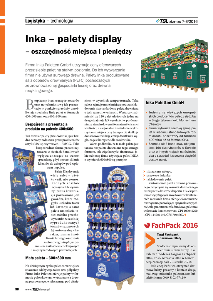 Logistyka – technologia TSL biznes 7-8/2016 Inka – palety display – oszczędność miejsca i pieniędzy Firma Inka Paletten GmbH utrzymuje ceny oferowanych przez siebie palet na stałym poziomie. Do ich wytwarzania firma nie używa surowego drewna. Palety Inka produkowane są z odpadów drewnianych (PEFC) pochodzących ze zrównoważonej gospodarki leśnej oraz drewna recyklingowego. B ezpieczny i tani transport towarów oraz natychmiastową ich prezentację w punkcie sprzedaży umożliwiają spec jalne linie palet w formacie 400×600 mm oraz 600×800 mm. Bezpośrednia prezentacja produktu na palecie 400x600 Ten rozmiar palety (tzw. ćwiartka) jest bardzo ceniony zwłaszcza przez producentów artykułów spożywczych i FMCG. Taka bezpośrednia forma prezentacji towaru w sieciach handlowych wpływa znacząco na wzrost sprzedaży, gdyż często skłania klientów do zakupów pod wpływem impulsu. Palety Display mają wiele zalet – użytkownik nie ponosi ż a d ny c h k o s z t ów wynajmu lub wymiany; prosta konstrukcja pozbawiona jest gwoździ, które mogłyby uszkodzić towar lub kartony; a sama paleta umożliwia tanie i stabilne przechowywanie wcześniej w y p r o d u k o w a ny c h towarów sezonowych. Jej uniwersalny charakter, rozmiar i możliwość łatwego osadzenia kartonowego displayu pozwala na zastosowanie w krajowych i międzynarodowych prezentacjach. Mała paleta – 600×800 mm Na dzisiejszym rynku palet coraz większe znaczenie zdobywają także tzw. półpalety. Firma Inka Paletten oferuje palety w formacie połówkowym, wytwarzane z drewna prasowanego, wytłaczanego pod ciśnie30 www.TSL biznes.pl niem w wysokich temperaturach. Taka paleta zajmuje mniej miejsca podczas składowania niż standardowa paleta drewniana o tych samych wymiarach. Wystarczy nadmienić, że 120 palet ułożonych jedna na drugiej zajmuje 1/3 wysokości w porównaniu ze standardowymi formatami tej samej wielkości, a racjonalne i świadome wykorzystanie miejsca przy transporcie skutkuje dodatkowo redukcją emisji dwutlenku węgla, co jest korzystne dla środowiska. Warto podkreślić, że ta mała paleta jest tańsza niż paleta drewniana tego samego formatu, tak więc korzyści finansowe, jakie odnoszą firmy używające palet INKA o wymiarch 600×800 są potrójne: Inka Paletten GmbH > Jeden z największych europej- skich producentów palet z siedzibą w Siegertsbrunn koło Monachium (Niemcy). > Firma wytwarza szeroką gamę palet w siedmiu standardowych rozmiarach, począwszy od formatu 400×600 aż do formatu CP3. > Szeroka sieć handlowa, obejmująca 160 dystrybutorów w Europie oraz w innych krajach na świecie, dba o sprzedaż i zapewnia ciągłość dostaw palet. > niższa cena zakupu, > przewozu ładunku > i składowania palet. Zastosowanie palet z drewna prasowanego przyczynia się również do znacznego zmniejszenia kosztów eksportu. Dla eksporterów wysyłających swój towar w kontenerach morskich firma oferuje ekonomiczne rozwiązania, pozwalające optymalnie wypełnić całą przestrzeń załadunkową paletami w formacie kontenerowym: CP1 1000×1200 i CP3 1140×1140, CP5 760×760. < Targi Fachpack – darmowe bilety Serdecznie zapraszamy do odwiedzenia stoiska firmy Inka Paletten podczas targów Fachpack 2016, 27-29 września 2016 w Nuremberg/Niemcy, hala 7 – stoisko 7-218. Jeśli chcą Państwo otrzymać darmowe bilety, prosimy o kontakt drogą mailową: [email protected] lub telefoniczną: 0049 8102-7742-0