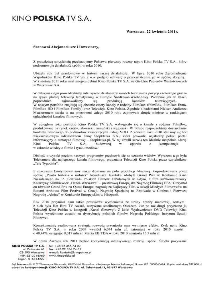 Warszawa, 22 kwietnia 2011r. Szanowni Akcjonariusze i Inwestorzy, Z prawdziwą satysfakcją przekazujemy Państwu pierwszy roczny raport Kino Polska TV S.A., który podsumowuje działalność spółki w roku 2010. Ubiegły rok był przełomowy w historii naszej działalności. W lipcu 2010 roku Zgromadzenie Wspólników Kino Polska TV Sp. z o.o. podjęło uchwałę o przekształceniu jej w spółkę akcyjną. W kwietniu 2011 roku miał miejsce debiut Kino Polska TV S.A. na Giełdzie Papierów Wartościowych w Warszawie S.A. W dalszym ciągu prowadziliśmy intensywne działania w ramach budowania pozycji czołowego gracza na rynku płatnej telewizji tematycznej w Europie Środkowo-Wschodniej. Podobnie jak w latach poprzednich zajmowaliśmy się produkcją kanałów telewizyjnych . W naszym portfolio znajdują się obecnie cztery kanały z rodziny FilmBox (FilmBox, FilmBox Extra, FilmBox HD i FilmBox Family) oraz Telewizja Kino Polska. Zgodnie z badaniami Nielsen Audience Measurement stacja ta na przestrzeni całego 2010 roku zajmowała drugie miejsce w rankingach oglądalności kanałów filmowych. W ubiegłym roku portfolio Kino Polska TV S.A. wzbogaciło się o kanały z rodziny FilmBox, produkowane na rynek czeski, słowacki, rumuński i węgierski. W Polsce rozpoczęliśmy dostarczanie kontentu filmowego do podmiotów świadczących usługi VOD. Z końcem roku 2010 staliśmy się też większościowym udziałowcem firmy Stopklatka S.A., która prowadzi najstarszy polski portal informacyjny o tematyce filmowej – Stopklatka.pl. W tej chwili serwis ten idealnie uzupełnia ofertę Kino Polska TV S.A., budowaną w oparciu o kompetencje w zakresie wiedzy o filmie i rynku mediów. Dbałość o wysoki poziom naszych programów przełożyła się na uznanie widzów. Wyrazem tego była Telekamera dla najlepszego kanału filmowego, przyznana Telewizji Kino Polska przez czytelników „Tele Tygodnia”. Z sukcesami kontynuowaliśmy nasze działania na polu produkcji filmowej. Koprodukowana przez spółkę „Prosta historia o miłości” Arkadiusza Jakubika zdobyła Grand Prix w Konkursie Kina Niezależnego na 35. Festiwalu Polskich Filmów Fabularnych w Gdyni, a film krótkometrażowy Katarzyny Klimkiewicz „Hanoi-Warszawa” – prestiżową Europejską Nagrodę Filmową EFA. Otrzymał on również Grand Prix na Quest Europe, nagrodę za Najlepszy Film w sekcji Młodych Filmowców na Batumi Arthouse Film Festival w Gruzji, Nagrodę Specjalną na Festiwalu w Cottbus i Pierwszą Nagrodę „Alcine” w Konkursie Europejskim w Hiszpanii. Rok 2010 przyniósł nam także prestiżowe wyróżnienia ze strony branży mediowej. Jednym z nich była Hot Bird TV Award, nazywana satelitarnym Oscarem. Już po raz drugi przyznano ją Telewizji Kino Polska w kategorii „Kanał filmowy”. Z kolei Wydawnictwo DVD Telewizji Kina Polska wyróżnione zostało za dystrybucję polskich filmów Nagrodą Polskiego Instytutu Sztuki Filmowej. Konsekwentnie realizowana strategia rozwoju przyniosła nam wymierne efekty. Zysk netto Kino Polska TV S.A. w roku 2009 wyniósł 6,074 mln zł, natomiast w roku 2010 wzrósł o 48,44%, osiągając 9,017 mln zł. Marża EBITDA w roku 2010 wyniosła 13,7 mln zł. W opinii Zarządu rok 2011 będzie kontynuacją intensywnego rozwoju spółki. Środki pozyskane z emisji akcji serii B umożliwią nam poszerzenie oferty programowej, zakup infrastruktury technicznej i rozwój działań w zakresie produkcji filmowej. Do stojących przed nami wyzwań przystępujemy z wysoko wykwalifikowanym zespołem menadżerów oraz jasną wizją dalszej integracji naszego modelu biznesowego. W dalszym ciągu jednym z naszych najcenniejszych aktywów pozostaje pasja do kina, która od początku była motorem rozwoju spółki i w ciągu zaledwie 8 lat uczyniła z niej prężną firmę, działającą na międzynarodowym rynku mediów. Jesteśmy przekonani, że rozwijanie tego potencjału przyczyni się do wzrostu wartości spółki dla naszych Inwestorów i Akcjonariuszy. Z poważaniem, Piotr Reisch Prezes Zarządu Kino Polska TV S.A.