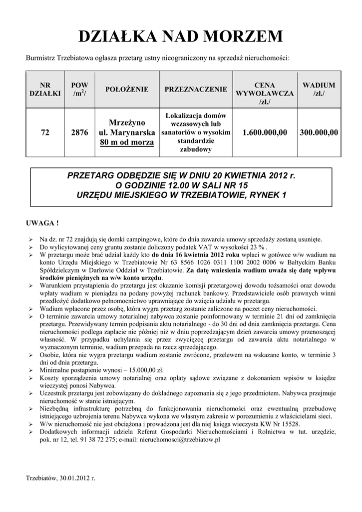 DZIAŁKA NAD MORZEM Burmistrz Trzebiatowa ogłasza przetarg ustny nieograniczony na sprzedaż nieruchomości: NR DZIAŁKI POW /m2/ POŁOŻENIE PRZEZNACZENIE CENA WYWOŁAWCZA /zł./ WADIUM /zł./ 1.600.000,00 300.000,00 Lokalizacja domów 72 2876 Mrzeżyno wczasowych lub ul. Marynarska sanatoriów o wysokim standardzie 80 m od morza zabudowy PRZETARG ODBĘDZIE SIĘ W DNIU 20 KWIETNIA 2012 r. O GODZINIE 12.00 W SALI NR 15 URZĘDU MIEJSKIEGO W TRZEBIATOWIE, RYNEK 1 UWAGA ! Na dz. nr 72 znajdują się domki campingowe, które do dnia zawarcia umowy sprzedaży zostaną usunięte. Do wylicytowanej ceny gruntu zostanie doliczony podatek VAT w wysokości 23 % . W przetargu może brać udział każdy kto do dnia 16 kwietnia 2012 roku wpłaci w gotówce w/w wadium na konto Urzędu Miejskiego w Trzebiatowie Nr 63 8566 1026 0311 1100 2002 0006 w Bałtyckim Banku Spółdzielczym w Darłowie Oddział w Trzebiatowie. Za datę wniesienia wadium uważa się datę wpływu środków pieniężnych na w/w konto urzędu. Warunkiem przystąpienia do przetargu jest okazanie komisji przetargowej dowodu tożsamości oraz dowodu wpłaty wadium w pieniądzu na podany powyżej rachunek bankowy. Przedstawiciele osób prawnych winni przedłożyć dodatkowo pełnomocnictwo uprawniające do wzięcia udziału w przetargu. Wadium wpłacone przez osobę, która wygra przetarg zostanie zaliczone na poczet ceny nieruchomości. O terminie zawarcia umowy notarialnej nabywca zostanie poinformowany w terminie 21 dni od zamknięcia przetargu. Przewidywany termin podpisania aktu notarialnego - do 30 dni od dnia zamknięcia przetargu. Cena nieruchomości podlega zapłacie nie później niż w dniu poprzedzającym dzień zawarcia umowy przenoszącej własność. W przypadku uchylania się przez zwycięzcę przetargu od zawarcia aktu notarialnego w wyznaczonym terminie, wadium przepada na rzecz sprzedającego. Osobie, która nie wygra przetargu wadium zostanie zwrócone, przelewem na wskazane konto, w terminie 3 dni od dnia przetargu. Minimalne postąpienie wynosi – 15.000,00 zł. Koszty sporządzenia umowy notarialnej oraz opłaty sądowe związane z dokonaniem wpisów w księdze wieczystej ponosi Nabywca. Uczestnik przetargu jest zobowiązany do dokładnego zapoznania się z jego przedmiotem. Nabywca przejmuje nieruchomość w stanie istniejącym. Niezbędną infrastrukturę potrzebną do funkcjonowania nieruchomości oraz ewentualną przebudowę istniejącego uzbrojenia terenu Nabywca wykona we własnym zakresie w porozumieniu z właścicielami sieci. W/w nieruchomość nie jest obciążona i prowadzona jest dla niej księga wieczysta KW Nr 15528. Dodatkowych informacji udziela Referat Gospodarki Nieruchomościami i Rolnictwa w tut. urzędzie, pok. nr 12, tel. 91 38 72 275; e-mail: [email protected] Trzebiatów, 30.01.2012 r.