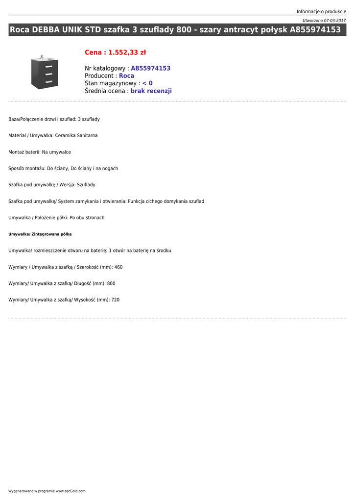 Informacje o produkcie Utworzono 07-03-2017 Roca DEBBA UNIK STD szafka 3 szuflady 800 - szary antracyt połysk A855974153 Cena : 1.552,33 zł Nr katalogowy : A855974153 Producent : Roca Stan magazynowy : < 0 Średnia ocena : brak recenzji Baza/Połączenie drzwi i szuflad: 3 szuflady Materiał / Umywalka: Ceramika Sanitarna Montaż baterii: Na umywalce Sposób montażu: Do ściany, Do ściany i na nogach Szafka pod umywalkę / Wersja: Szuflady Szafka pod umywalkę/ System zamykania i otwierania: Funkcja cichego domykania szuflad Umywalka / Położenie półki: Po obu stronach Umywalka/ Zintegrowana półka Umywalka/ rozmieszczenie otworu na baterię: 1 otwór na baterię na środku Wymiary / Umywalka z szafką / Szerokość (mm): 460 Wymiary/ Umywalka z szafką/ Długość (mm): 800 Wymiary/ Umywalka z szafką/ Wysokość (mm): 720 Wygenerowano w programie www.oscGold.com