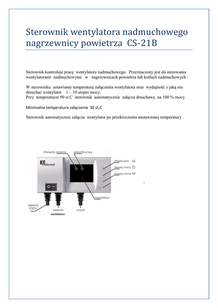 Sterownik wentylatora nadmuchowego nagrzewnicy powietrza CS-21B Sterownik kontroluje pracę wentylatora nadmuchowego. Przeznaczony jest do sterowania wentylatorami nadmuchowymi w nagrzewnicach powietrza lub kotłach nadmuchowych . W sterowniku ustawiamy temperaturę załączenia wentylatora oraz wydajność z jaką ma dmuchać wentylator 1 – 10 stopni mocy, Przy temperaturze 90 st.C sterownik automatycznie załącza dmuchawę na 100 % mocy. Minimalna temperatura załączenia 30 st,C Sterownik automatycznie załącza wentylator po przekroczeniu nastawionej temperatury . Opcje serwisowe W opcjach serwisowych można zmienić typ dmuchawy w celu poprawnej regulacji obrotów silnika Wejście w opcje serwisowe jest możliwe po wyłączeniu zasilania i po ponownym włączeniu przytrzymując jednocześnie klawisze + i – d- to typ dmuchawy: 1- DMUCHAWA D1 2- DMUCHAWA D2 3- DMUCHAWA D3 4- DMUCHAWA D4 Po ustawieniu typu dmuchawy sterownik automatycznie przejdzie do pracy na zadanych parametrach po 5 sekundach. GWARANCJA PRODUCENT UDZIELA GWARANCJI NA SPRAWNE DZIAŁANIE URZĄDZENIA NA OKRES 24 M-C OD DATY SPRZEDAŻY. GWARANT ZOBOWIAZUJE SIĘ DO NAPRAWY URZĄDZENIA JEŚLI WADY WYSTĄPIŁY Z WINY PRODUCENTA. URZĄDZENIE NALEŻY DOSTARCZYC DO SERWISU FIRMOWEGO KG ELEKTRONIK LUB DO MIEJSCA ZAKUPU. WSZELKIE ZWIĄZANE Z TYM KOSZTY PONOSI UŻYTKOWNIK. GWARANCJA NA SPRZEDANY TOWAR KONSUMPCYJNY NIE WYŁĄCZA ,NIE OGRANICZA ANI NIE ZAWIESZA UPRAWNIEŃ KUPUJACEGO WYNIKAJACYCH Z NIEZGODNOSCI TOWARU Z UMOWĄ . DATA SPRZEDAŻY …………………………………….. FIRMA KG ELEKTRONIK UL. SIENKIEWICZA 121 39-300 MIELEC [email protected] Informacja o pozbywaniu się urządzeń elektrycznych i elektronicznych Przedstawiony symbol umieszczony na produktach lub dołączonej do nich dokumentacji informuje że niesprawnych urządzeń elektrycznych lub elektronicznych nie można wyrzucać razem z odpadami gospodarczymi. Prawidłowe postępowanie w razie konieczności utylizacji powtórnego użycia lub odzysku podzespołów polega na przekazaniu urządzenia do wyspecjalizowanego punktu zbiórki, gdzie będzie przyjęte bezpłatnie W niektórych krajach produkt można oddać lokalnemu dystrybutorowi podczas zakupu innego urządzenia. Prawidłowa utylizacja urządzenia umożliwia zachowanie cennych zasobówi uniknięcie negatywnego wpływu na zdrowie i środowisko, które może być zagrożone przez nieodpowiednie postępowanie z odpadami. Szczegółowe informacje o najbliższym punkcie zbiórki można uzyskać u władz lokalnych. Nieprawidłowa utylizacja odpadów zagrożona jest karami przewidzianymi w odpowiednich przepisach lokalnych.