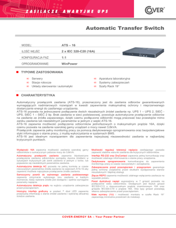 Automatic Transfer Switch MODEL: ATS – 16 ILOŚĆ WEJŚĆ 2 x IEC 320-C20 (16A) KONFIGURACJA FAZ: 1:1 OPROGRAMOWANIE: WinPower TYPOWE ZASTOSOWANIA • • • Serwery Stacje robocze Układy sterowania i automatyki • • • Aparatura laboratoryjna Systemy zabezpieczeń Szafy Rack 19’’ CHARAKTERYSTYKA Automatyczny przełącznik zasilania (ATS-16), przeznaczony jest do zasilania odbiorów gwarantowanych wymagających nadmiarowych rozwiązań w kwestii zapewnienia maksymalnej ochrony i nieprzerwanego dostarczanie energii do zasilanego urządzenia. ATS-16 pozwala na jednoczesne podłączenie dwóch niezależnych źródeł zasilania np. UPS 1 – UPS 2, SIEĆ UPS, SIEĆ 1 – SIEĆ 2 itp. Brak zasilania w sieci podstawowej, powoduje automatyczne przełączenie odbiorów na zasilanie ze źródła zapasowego, dzięki czemu podłączone odbiorniki mogą pracować bez przestojów mimo zaniku zasilania lub niestabilnych parametrów w jednym z wejść ATS-16. ATS-16 zapewnia możliwość podłączenia odbiorników jednofazowych o maksymalnym prądzie 16A, dzięki czemu pozwala na zasilanie szerokiej gamy urządzeń o mocy nawet 3,6kVA. Przełącznik zapewnia pełny monitoring pracy za pomocą dedykowanego oprogramowania oraz bezpotencjałowe styki informujące o stanie pracy, z myślą wykorzystania w systemach BMS. ATS-16 jest idealnym rozwiązaniem dla zapewnienia najwyższej niezawodności zasilania w najbardziej krytycznych punktach. Wydajność 16A zapewnia możliwość zasilania szerokiej gamy odbiorników o sumarycznym poborze mocy do 3,6kVA. Możliwość regulacji tolerancji napięcia zasilającego pozwala zapewnić stabilne warunki zasilania dla krytycznych odbiorników. Automatyczny przełącznik zasilania zapewnia błyskawiczne przełączenie zasilania odbiorników pomiędzy dwoma źródłami w sytuacjach krytycznych jak zanik zasilania w jednym z torów, lub pojawienie się niestabilnych parametrów zasilania. Interfejs RS-232 oraz DryContact zapewnia pełną komunikację oraz możliwość zdalnego informowania o stanie pracy urządzenia. Automatyczna detekcja AC pozwala na pełną kontrolę w czasie rzeczywistym parametrów źródła zasilania na wejściach ATS-16 aby zapewnić możliwie najszybsze przełączenie źródła zasilania. Zabezpieczenie przed przeciążeniem i przegrzaniem gwarantuje pełną ochronę urządzenia przed skutkami występowania stanów nieustalonych i błędnej obsługi. Samoczynny powrót do wybranego zasilania podstawowego zapewnia utrzymanie wybranego toru zasilania w każdym momencie, kiedy wybrane źródło jest dostępne i spełnia wymagane parametry napięcia. Złącze REPO zapewnia możliwość zdalnego wyłączenia zasilacza na wypadek pożaru. Automatyczna detekcja prądu na wyjściu urządzenia zabezpiecza przed przeciążeniem. Intuicyjny interfejs graficzny w postaci 7 diod LED zapewnia przejrzystą informację o stanie źródeł zasilania i wybranej aktualnej ścieżce zasilania. Dedykowane oprogramowanie komunikacyjne do zapewnienia monitoringu pracy w czasie rzeczywistym i zarządzania. Panel dystrybucji napięć wyposażony w 7 gniazd pozwala na podłączenie wielu odbiorników. Dostępnych jest 6sztuk gniazd IEC320-C13 o dopuszczalnym prądzie znamionowym 10A oraz gniazdo IEC320-C19 o prądzie 16A. Oba typy gniazd posiadają własne zabezpieczenie przed przeciążeniem. Małe wymiary (1U) i możliwość montażu w szafie Rack 19’’ zapewniają minimalna przestrzeń do instalacji. COVER-ENERGY SA – Your Pow er Partner ATS-16 Klawisz funkcyjny Dioda alarmu Status zasilania gniazd wyjściowych PS1 S1 SW1 F1 PS2 BP2 S2 BP1 SW2 Status obecności źródła zasilania Klawisz wyboru preferowanego źródła zasilania Preferowane źródło zasilania Model Ilość faz WE : WY Wejście Napięcie zasilające Prąd znamionowy Zakres napięcia Częstotliwość Rodzaj i ilość gniazd zasilających Wyjście Napięcie nominalne Częstotliwość nominalna Prąd znamionowy Czas przełączenia pomiędzy źródłami zasilania Rodzaj i ilość gniazd Odporność na przeciążenia Odporność na zwarcia Wymiary i masa Wymiary (SxGxW) Masa Sygnalizacja i porty komunikacyjne Wskaźnik stanu pracy Komunikacja Warunki środowiskowe Poziom hałasu Dopuszczalna temperatura pracy Temperatura składowania Wilgotność Stopień ochrony obudowy Normy Bezpieczeństwo EMI EMS ATS-16 1:1 220 / 230 / 240 VAC 16 A 160 - 290 VAC 50/60 Hz 2 x IEC320-C20 (2 x 16A) Takie samo jak wejściowe Taka sama jak wejściowa 16A <10ms IEC320-C13 x6 (10A) IEC320-C19 x1 (16A) 105 – 125% - 45 sekund 126 – 150% - 27 sekund 151 – 210% - 5 sekund 211 – 300% - 2 sekundy Zabezpieczenie bezpiecznikiem topikowym 430 x 315 x 44 mm (1U) 8 kg Panel LED, alarm dźwiękowy RS232, DryContact, złącze REPO <25 dB 0 °C ÷ 40 °C - 25 °C ÷ 75 °C 0 ÷ 95 % (bez kondensacji) IP 30 CE, IEC 60950-1 IEC62310-2, C1 IEC61000-4-2 level 3, IEC61000-4-3 level 2 (Lab.), IEC61000-4-4 level 2, IEC610004-5 level 3, IEC 61000-2-2 LF Immunity, IEC61000-4-6 level 2 (Lab.), IEC61000-3-2 Harmonic (Lab.), IEC61000-3-3 Flicks W związku ze stałym udoskonalaniem produktu zastrzega się możliwość zmian parametrów bez uprzedniego informowania. CE/CSA-1220-001 Autoryzowany dystrybutor: COMEX S.A. www.coverenergy.com ul. Azymutalna 9; 80-298 Gdańsk Tel.: +48 58 5561313 www.comex.com.pl