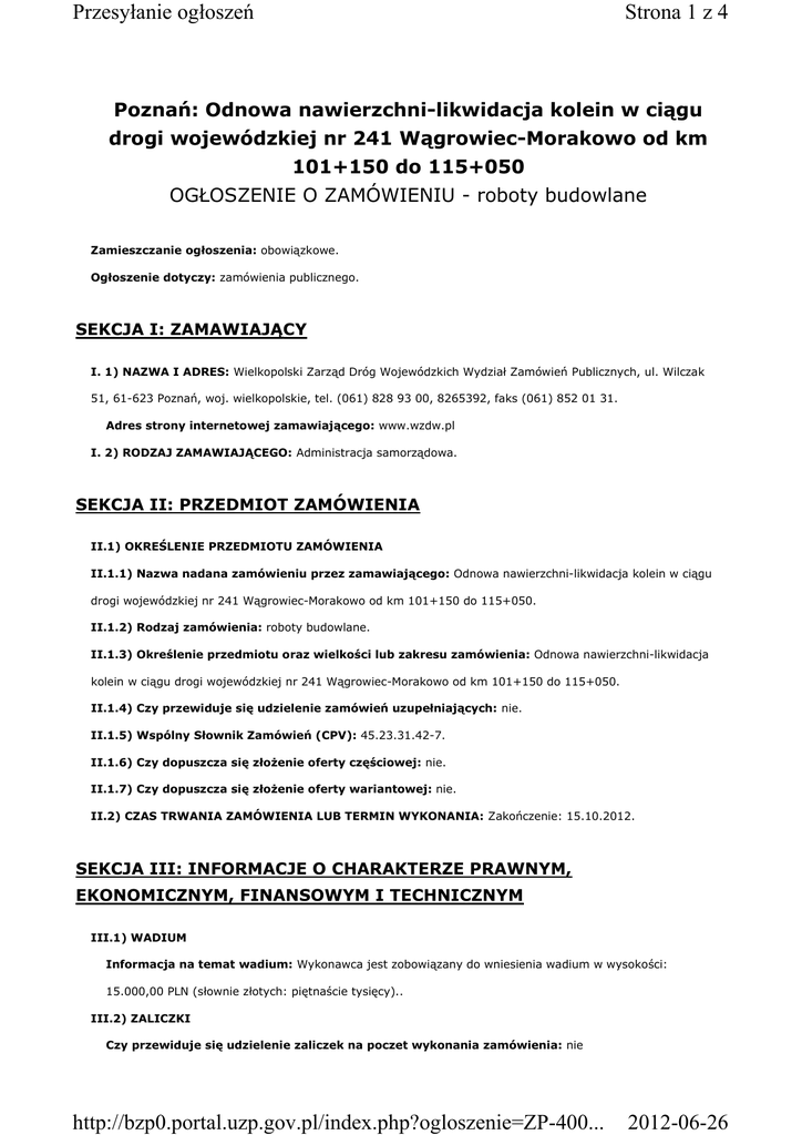 Przesyłanie ogłoszeń Strona 1 z 4 Poznań: Odnowa nawierzchni-likwidacja kolein w ciągu drogi wojewódzkiej nr 241 Wągrowiec-Morakowo od km 101+150 do 115+050 OGŁOSZENIE O ZAMÓWIENIU - roboty budowlane Zamieszczanie ogłoszenia: obowiązkowe. Ogłoszenie dotyczy: zamówienia publicznego. SEKCJA I: ZAMAWIAJĄCY I. 1) NAZWA I ADRES: Wielkopolski Zarząd Dróg Wojewódzkich Wydział Zamówień Publicznych, ul. Wilczak 51, 61-623 Poznań, woj. wielkopolskie, tel. (061) 828 93 00, 8265392, faks (061) 852 01 31. Adres strony internetowej zamawiającego: www.wzdw.pl I. 2) RODZAJ ZAMAWIAJĄCEGO: Administracja samorządowa. SEKCJA II: PRZEDMIOT ZAMÓWIENIA II.1) OKREŚLENIE PRZEDMIOTU ZAMÓWIENIA II.1.1) Nazwa nadana zamówieniu przez zamawiającego: Odnowa nawierzchni-likwidacja kolein w ciągu drogi wojewódzkiej nr 241 Wągrowiec-Morakowo od km 101+150 do 115+050. II.1.2) Rodzaj zamówienia: roboty budowlane. II.1.3) Określenie przedmiotu oraz wielkości lub zakresu zamówienia: Odnowa nawierzchni-likwidacja kolein w ciągu drogi wojewódzkiej nr 241 Wągrowiec-Morakowo od km 101+150 do 115+050. II.1.4) Czy przewiduje się udzielenie zamówień uzupełniających: nie. II.1.5) Wspólny Słownik Zamówień (CPV): 45.23.31.42-7. II.1.6) Czy dopuszcza się złoŜenie oferty częściowej: nie. II.1.7) Czy dopuszcza się złoŜenie oferty wariantowej: nie. II.2) CZAS TRWANIA ZAMÓWIENIA LUB TERMIN WYKONANIA: Zakończenie: 15.10.2012. SEKCJA III: INFORMACJE O CHARAKTERZE PRAWNYM, EKONOMICZNYM, FINANSOWYM I TECHNICZNYM III.1) WADIUM Informacja na temat wadium: Wykonawca jest zobowiązany do wniesienia wadium w wysokości: 15.000,00 PLN (słownie złotych: piętnaście tysięcy).. III.2) ZALICZKI Czy przewiduje się udzielenie zaliczek na poczet wykonania zamówienia: nie http://bzp0.portal.uzp.gov.pl/index.php?ogloszenie=ZP-400... 2012-06-26 Przesyłanie ogłoszeń Strona 2 z 4 III.3) WARUNKI UDZIAŁU W POSTĘPOWANIU ORAZ OPIS SPOSOBU DOKONYWANIA OCENY SPEŁNIANIA TYCH WARUNKÓW III.3.1) Uprawnienia do wykonywania określonej działalności lub czynności, jeŜeli przepisy prawa nakładają obowiązek ich posiadania Opis sposobu dokonywania oceny spełniania tego warunku 1.W postępowaniu mogą brać udział Wykonawcy niepodlegający wykluczeniu z powodu niespełnienia warunków o których mowa w art.24 ust.1 i 2 ustawy Pzp oraz spełniający warunki o których mowa w art. 22 ust 1 ustawy Pzp i określonych w SIWZ. 2.Zamawiający dokona oceny spełniania warunków udziału w postępowaniu na podstawie oświadczeń i dokumentów na zasadzie spełnia/nie spełnia. III.3.2) Wiedza i doświadczenie Opis sposobu dokonywania oceny spełniania tego warunku Wykonawca musi wykazać, Ŝe zrealizował (zakończył) , jako strona umowy w okresie ostatnich 5 lat przed upływem terminu składania ofert, a jeŜeli okres prowadzenia działalności jest krótszy- w tym okresie co najmniej trzy zadania związane z budową, przebudową lub remontem dróg, kaŜde o wartości nie mniejszej niŜ 1.500.000,00 PLN W przypadku gdy wartość wykazywanego zamówienia określona została w walucie innej niŜ wskazana przez Zamawiającego Wykonawca przeliczy ją według średniego kursu NBP na dzień zatwierdzenia protokołu odbioru robót lub równowaŜnego dokumentu, podając datę zatwierdzenia protokołu/ dokumentu i kurs walut. III.3.3) Potencjał techniczny Opis sposobu dokonywania oceny spełniania tego warunku nie dotyczy III.3.4) Osoby zdolne do wykonania zamówienia Opis sposobu dokonywania oceny spełniania tego warunku nie dotyczy III.3.5) Sytuacja ekonomiczna i finansowa Opis sposobu dokonywania oceny spełniania tego warunku nie dotyczy III.4) INFORMACJA O OŚWIADCZENIACH LUB DOKUMENTACH, JAKIE MAJĄ DOSTARCZYĆ WYKONAWCY W CELU POTWIERDZENIA SPEŁNIANIA WARUNKÓW UDZIAŁU W POSTĘPOWANIU ORAZ NIEPODLEGANIA WYKLUCZENIU NA PODSTAWIE ART. 24 UST. 1 USTAWY III.4.1) W zakresie wykazania spełniania przez wykonawcę warunków, o których mowa w art. 22 ust. 1 ustawy, oprócz oświadczenia o spełnieniu warunków udziału w postępowaniu, naleŜy przedłoŜyć: wykaz robót budowlanych w zakresie niezbędnym do wykazania spełniania warunku wiedzy i doświadczenia, wykonanych w okresie ostatnich pięciu lat przed upływem terminu składania ofert albo wniosków o dopuszczenie do udziału w postępowaniu, a jeŜeli okres prowadzenia działalności http://bzp0.portal.uzp.gov.pl/index.php?ogloszenie=ZP-400... 2012-06-26 Przesyłanie ogłoszeń Strona 3 z 4 jest krótszy - w tym okresie, z podaniem ich rodzaju i wartości, daty i miejsca wykonania oraz załączeniem dokumentu potwierdzającego, Ŝe roboty zostały wykonane zgodnie z zasadami sztuki budowlanej i prawidłowo ukończone III.4.2) W zakresie potwierdzenia niepodlegania wykluczeniu na podstawie art. 24 ust. 1 ustawy, naleŜy przedłoŜyć: oświadczenie o braku podstaw do wykluczenia aktualny odpis z właściwego rejestru, jeŜeli odrębne przepisy wymagają wpisu do rejestru, w celu wykazania braku podstaw do wykluczenia w oparciu o art. 24 ust. 1 pkt 2 ustawy, wystawiony nie wcześniej niŜ 6 miesięcy przed upływem terminu składania wniosków o dopuszczenie do udziału w postępowaniu o udzielenie zamówienia albo składania ofert, a w stosunku do osób fizycznych oświadczenie w zakresie art. 24 ust. 1 pkt 2 ustawy III.4.3) Dokumenty podmiotów zagranicznych JeŜeli wykonawca ma siedzibę lub miejsce zamieszkania poza terytorium Rzeczypospolitej Polskiej, przedkłada: III.4.3.1) dokument wystawiony w kraju, w którym ma siedzibę lub miejsce zamieszkania potwierdzający, Ŝe: nie otwarto jego likwidacji ani nie ogłoszono upadłości - wystawiony nie wcześniej niŜ 6 miesięcy przed upływem terminu składania wniosków o dopuszczenie do udziału w postępowaniu o udzielenie zamówienia albo składania ofert III.7) Czy ogranicza się moŜliwość ubiegania się o zamówienie publiczne tylko dla wykonawców, u których ponad 50 % pracowników stanowi
