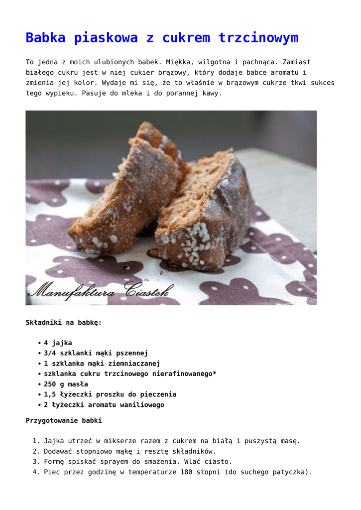 Babka piaskowa z cukrem trzcinowym To jedna z moich ulubionych babek. Miękka, wilgotna i pachnąca. Zamiast białego cukru jest w niej cukier brązowy, który dodaje babce aromatu i zmienia jej kolor. Wydaje mi się, że to właśnie w brązowym cukrze tkwi sukces tego wypieku. Pasuje do mleka i do porannej kawy. Składniki na babkę: 4 jajka 3/4 szklanki mąki pszennej 1 szklanka mąki ziemniaczanej szklanka cukru trzcinowego nierafinowanego* 250 g masła 1,5 łyżeczki proszku do pieczenia 2 łyżeczki aromatu waniliowego Przygotowanie babki 1. Jajka utrzeć w mikserze razem z cukrem na białą i puszystą masę. 2. Dodawać stopniowo mąkę i resztę składników. 3. Formę spiskać sprayem do smażenia. Wlać ciasto. 4. Piec przez godzinę w temperaturze 180 stopni (do suchego patyczka). 5. Smacznego! 6. * Cukier brązowy może być często mylony z cukrem trzcinowym nierafinowanym. To duży błąd. Cukier brązowy to zwykły biały „farbowany” cukier. Zatem nie ma tych samych właściwości co cukier trzcinowy.