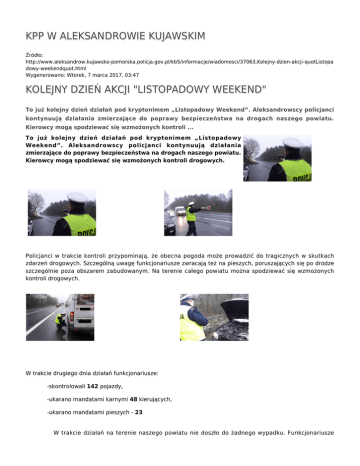 KPP W ALEKSANDROWIE KUJAWSKIM Źródło: http://www.aleksandrow.kujawsko-pomorska.policja.gov.pl/kb5/informacje/wiadomosci/37063,Kolejny-dzien-akcji-quotListopa dowy-weekendquot.html Wygenerowano: Wtorek, 7 marca 2017, 03:47 KOLEJNY DZIEŃ AKCJI "LISTOPADOWY WEEKEND" To już kolejny dzień działań pod kryptonimem „Listopadowy Weekend”. Aleksandrowscy policjanci kontynuują działania zmierzające do poprawy bezpieczeństwa na drogach naszego powiatu. Kierowcy mogą spodziewać się wzmożonych kontroli ... To już kolejny dzień działań pod kryptonimem „Listopadowy Weekend”. Aleksandrowscy policjanci kontynuują działania zmierzające do poprawy bezpieczeństwa na drogach naszego powiatu. Kierowcy mogą spodziewać się wzmożonych kontroli drogowych. Policjanci w trakcie kontroli przypominają, że obecna pogoda może prowadzić do tragicznych w skutkach zdarzeń drogowych. Szczególną uwagę funkcjonariusze zwracają też na pieszych, poruszających się po drodze szczególnie poza obszarem zabudowanym. Na terenie całego powiatu można spodziewać się wzmożonych kontroli drogowych. W trakcie drugiego dnia działań funkcjonariusze: -skontrolowali 142 pojazdy, -ukarano mandatami karnymi 48 kierujących, -ukarano mandatami pieszych - 23 W trakcie działań na terenie naszego powiatu nie doszło do żadnego wypadku. Funkcjonariusze odnotowali 4 kolizje drogowe. Do pierwszej kolizji doszło wczoraj (23.11.) w godzinach rannych w Nowym Ciechocinku. Kierujący fiatem w wyniku nieprawidłowego wyprzedzania zmusił do nagłego skrętu innego prawidłowo jadącego kierowcę. Zaledwie dwie godziny później w Ciechocinku kierujący oplem najechał na zaparkowanego volkswagena. W tym samym czasie w Kamieńcu na drodze, bez oświetlenia zatrzymał się kierujący ciągnikiem. Podążający za ciągnikiem opel aby uniknąć zderzenia zjechał na przeciwległy pas i uderzył w jadącego z naprzeciwka seata. Popołudniu w Niszczewach doszło do potrącenia rowerzysty przez kierującego oplem. Na szczęście nikt nie ucierpiał w tych zdarzeniach. st. sierż. Marta Błachowicz Oficer Prasowy KPP Aleksandrów Kuj. Autor: marta_blachowicz Publikacja: marta_blachowicz Ocena: 0/5 (0) Tweetnij