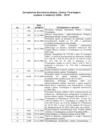 Zarządzenia Burmistrza Miasta i Gminy Twardogóra wydane w kadencji 2006 - 2010 Lp. Nr Data podjęcia 1. 1/06 01.12.2006 2. 2/06 01.12.2006 3. 3/06 04.12.2006 4. 4/06 04.12.2006 5. 5/06 04.12.2006 6. 6/06 07.12.2006 6a. 6a/06 07.12.2006 7. 7/06 07.12.2006 8. 8/06 11.12.2006 9. 9/06 18.12.2006 10. 10/06 20.12.2006 11. 11/06 21.12.2006 12. 12/06 21.12.2006 Zarządzenie w sprawie Powołania Zastępcy Burmistrza Miasta i Gminy Twardogóra Zakresu obowiązków i odpowiedzialności Zastępcy Burmistrza Miasta i Gminy Twardogóra Wyrażenia zgody na przejęcie do gminnego zasobu nieruchomości działki nr 7/2 AM 1 położonej w obrębie geodezyjnym Gola Wielka Zatwierdzenia trybu udzielenia zamówienia publicznego na dostawę artykułów biurowych dla Urzędu Miasta i Gminu w Twardogórze na I kwartał 2007 roku Zmiany Zarządzenia Nr 1211/06 z dnia 18 września 2006 r. w sprawie przeznaczenia do dzierżawy działek nr 6 AM 28, 7 AM 28, 43/5 AM 19, 55 AM 19, część dz. 14/1 AM 23, 47 AM 17 położone w m. Twardogóra, działki nr 610/12 AM 2, 610/13 AM 2 położone w Goszczu i dz. 57/8 AM 1 położonych w Chełstowie Przeprowadzenia kontroli podatku od nieruchomości na terenie miasta i gminy Twardogóra Wyrażenia zgody na przeprowadzenie ograniczonego przetargu na najem budynku położonego w miejscowości Łazisko na dz. Nr 5/2 AM 1 Ogłoszenia otwartego konkursu ofert w/z upowszechniania kultury fizycznej i sportu poprzez udział dzieci i młodzieży oraz mieszkańców z terenu miasta i gminy Twardogóra w zajęciach sportowych w 2007 roku Powołania Komisji odbioru robót wykonywanych na zadaniu pn. „Rekultywacja nielegalnych wysypisk na terenie miasta i gminy Twardogóra dla zadania Nr 1 – Twardogóra ul. Stolarska dz. Nr 8/4 AM – 15 pow. ok. 1,00 ha Zadanie Nr 2 Twardogóra ul. Długa dz. Nr 16/8 AM 32 pow. ok. 0,10 ha, Zadanie Nr 3 Olszówka dz. Nr 87 AM -1 o pow. 0,25 ha, Zadanie Nr 4 Goszcz ul. Sienkiewicza dz. Nr 385/2 AM 3 pow. ok. 0,10 ha Przeprowadzenia inwentaryzacji kasy Urzędu Miasta i Gminy w Twardogórze na dzień 29 grudnia 2006 r. Zmian budżetu i w budżecie gminy na rok 2006 Taryf za zbiorowe zaopatrzenie w wodę i zbiorowe odprowadzanie ścieków Nieodpłatnego przekazania mienia komunalnego – 13. 13/06 28.12.2006 14. 14/06 28.12.2006 15. 15/06 28.12.2006 17. 17/06 29.12.2006 18. 18/06 29.12.2006 19. 19/06 29.12.2006 20. 20/06 29.12.2006 21. 21/06 29.12.2006 22. 22/06 29.12.2006 23. 23/06 29.12.2006 24. 24/07 02.01.2007 25. 25/07 02.01.2007 26. 26/07 03.01.2007 27. 27/07 03.01.2007 28. 28/07 03.01.2007 29. 29/07 03.01.2007 30. 30/07 03.01.2007 31. 31/07 03.01.2007 32. 32/07 03.01.2007 33. 33/07 03.01.2007 34. 34/07 03.01.2007 słupów i opraw oświetlenia drogowego oraz linii zasilającej na ul. Kilińskiego w Twardogórze na rzecz EnergiaPro Koncern Energetyczny S.A oddział we Wrocławiu Prowadzenia kontroli wydatkowanych środków w jednostkach organizacyjnych Gminy Twardogóra Wyrażenia zgody na sprzedaż gruntów będących w użytkowaniu wieczystym Wyrażenia zgody na sprzedaż lokalu mieszkalnego dotychczasowemu najemcy Zmian budżetu i w budżecie gminy na rok 2006 Korekty planu przychodów rachunku dochodów własnych wydatków nimi sfinansowanych oraz korekty przychodów i rozchodów zakładów budżetowych na rok 2006 Ustalenia wysokości opłat i cen za usługi komunalne świadczone przez Zakład Gospodarki Komunalnej i Mieszkaniowej w Twardogórze na rok 2007 Korekty planów finansowych w 2006 roku Zawarcia umowy najmu lokalu mieszkalnego z zasobów komunalnych dla P. Danuty Adamowskiej zam. ul. Leśna 6 w Goszczu Rozłożenia na raty czynszu za najem lokalu użytkowego położonego w Twardogórze przy ul. Wielkopolskiej 7 Ustalenia wymiaru czasu pracy na poszczególne okresy rozliczeniowe w Urzędzie Miasta i Gminy w Twardogórze w roku 2007 Rozkładu czasu pracy w Urzędzie Miasta i Gminy w Twardogórze Ustalenia wysokości pogotowia kasowego na 2007 r. Ustalenia planu finansowego zadań z zakresu administracji rządowej budżetu gminy Twardogóra na rok 2007 Szczegółowego podziału dochodów i wydatków budżetowych na 2007 rok Zmiany zarządzenia Nr 870/05 Burmistrza Miasta i Gminy Twardogóra z dnia 24.05.2005 r. Przyznania dodatku motywacyjnego dla dyrektora Szkoły Podstawowej Nr 2 w Twardogórze Przyznania dodatku motywacyjnego dla dyrektora Szkoły Podstawowej w Grabownie Wielkim Przyznania dodatku motywacyjnego dla dyrektora Gimnazjum Nr 1 w Twardogórze Przyznania dodatku motywacyjnego dla dyrektora Szkoły Podstawowej w Goszczu Przyznania dodatku motywacyjnego dla dyrektora Szkoły Podstawowej Nr 1 w Twardogórze Przyznania dodatku motywacyjnego dla dyrektora 35. 35/07 03.01.2007 36. 36/07 03.01.2007 37. 37/07 03.01.2007 38. 38/07 03.01.2007 39. 39/07 03.01.2007 40. 40/07 03.01.2007 41. 41/07 03.01.2007 42. 43. 44. 45. 46. 47. 42/07 43/07 44/07 45/07 46/07 47/07 11.01.2007 11.01.2007 11.01.2007 11.01.2007 18.01.2007 18.01.2007 48. 48/07 24.01.2007 49. 49/07 24.01.2007 50. 50/07 24.01.2007 51. 51/07 30.01.2007 52. 52/07 30.01.2007 53. 53/07 30.01.2007 54. 54/07 01.02.2007 55. 55/07 01.02.2007 56. 56/07 01.02.2007 57. 57/07 06.02.2007 58. 59. 60. 61. 58/07 59/07 60/07 61/07 06.02.2007 06.02.2007 06.02.2007 14.02.2007 Szkoły Podstawowej w Chełstowie Przyznania dodatku motywacyjnego dla dyrektora Szkoły Podstawowej Nr 2 w Twardogórze Ustalenia wysokości dodatku funkcyjnego dla dyrektora Szkoły Podstawowej w Grabownie Wielkim Ustalenia wysokości dodatku funkcyjnego dla dyrektora Szkoły Podstawowej Nr 1 w Twardogórze Ustalenia wysokości dodatku funkcyjnego dla dyrektora Szkoły Podstawowej w Chełstowie Ustalenia wysokości dodatku funkcyjnego dla dyrektora Szkoły Podstawowej w Goszczu Ustalenia wysokości dodatku funkcyjnego dla dyrektora Gimnazjum Nr 1 w Twardogórze Ogłoszenia konkursu ofert na kompleksową oprawę techniczną imprez związanych z obchodami „Dni Twardogóry – 2007” Powołania komisji przetargowej Pow