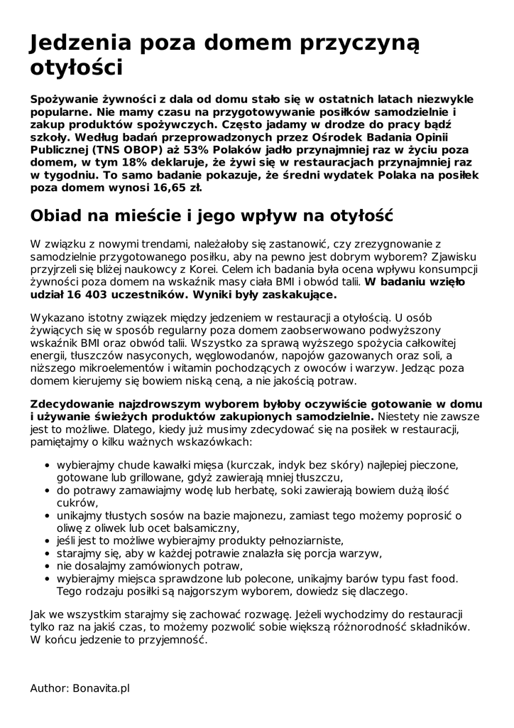 Jedzenia poza domem przyczyną otyłości Spożywanie żywności z dala od domu stało się w ostatnich latach niezwykle popularne. Nie mamy czasu na przygotowywanie posiłków samodzielnie i zakup produktów spożywczych. Często jadamy w drodze do pracy bądź szkoły. Według badań przeprowadzonych przez Ośrodek Badania Opinii Publicznej (TNS OBOP) aż 53% Polaków jadło przynajmniej raz w życiu poza domem, w tym 18% deklaruje, że żywi się w restauracjach przynajmniej raz w tygodniu. To samo badanie pokazuje, że średni wydatek Polaka na posiłek poza domem wynosi 16,65 zł. Obiad na mieście i jego wpływ na otyłość W związku z nowymi trendami, należałoby się zastanowić, czy zrezygnowanie z samodzielnie przygotowanego posiłku, aby na pewno jest dobrym wyborem? Zjawisku przyjrzeli się bliżej naukowcy z Korei. Celem ich badania była ocena wpływu konsumpcji żywności poza domem na wskaźnik masy ciała BMI i obwód talii. W badaniu wzięło udział 16 403 uczestników. Wyniki były zaskakujące. Wykazano istotny związek między jedzeniem w restauracji a otyłością. U osób żywiących się w sposób regularny poza domem zaobserwowano podwyższony wskaźnik BMI oraz obwód talii. Wszystko za sprawą wyższego spożycia całkowitej energii, tłuszczów nasyconych, węglowodanów, napojów gazowanych oraz soli, a niższego mikroelementów i witamin pochodzących z owoców i warzyw. Jedząc poza domem kierujemy się bowiem niską ceną, a nie jakością potraw. Zdecydowanie najzdrowszym wyborem byłoby oczywiście gotowanie w domu i używanie świeżych produktów zakupionych samodzielnie. Niestety nie zawsze jest to możliwe. Dlatego, kiedy już musimy zdecydować się na posiłek w restauracji, pamiętajmy o kilku ważnych wskazówkach: wybierajmy chude kawałki mięsa (kurczak, indyk bez skóry) najlepiej pieczone, gotowane lub grillowane, gdyż zawierają mniej tłuszczu, do potrawy zamawiajmy wodę lub herbatę, soki zawierają bowiem dużą ilość cukrów, unikajmy tłustych sosów na bazie majonezu, zamiast tego możemy poprosić o oliwę z oliwek lub ocet balsamiczny, jeśli jest to możliwe wybierajmy produkty pełnoziarniste, starajmy się, aby w każdej potrawie znalazła się porcja warzyw, nie dosalajmy zamówionych potraw, wybierajmy miejsca sprawdzone lub polecone, unikajmy barów typu fast food. Tego rodzaju posiłki są najgorszym wyborem, dowiedz się dlaczego. Jak we wszystkim starajmy się zachować rozwagę. Jeżeli wychodzimy do restauracji tylko raz na jakiś czas, to możemy pozwolić sobie większą różnorodność składników. W końcu jedzenie to przyjemność. Author: Bonavita.pl Link do artykułu: http://bonavita.pl/jedzenia-poza-domem-przyczyna-otylosci