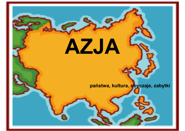 AZJA państwa, kultura, obyczaje, zabytki PołoŜenie Azji Azja połoŜona jest niemal w całości na półkuli wschodniej i północnej. Jedynie obszary leŜą na półkuli zachodniej (Półwysep Czukocki) i południowej (część Archipelagu Malajskiego). Państwa o największej powierzchni: 1. Rosja (12 806 439 km2) 2. Chiny (9 584 492 km2) 3. Indie (3 287 590 km2) 4. Kazachstan (2 346 927 km2) INDIE Stolicą Indii jest Delhi. Delhi zamieszkuje 23 tys. mieszkańców na km2. To drugie co do wielkości (po Bombaju) miasto Indii. Od północy Indie są ograniczone przez pasma górskie: Karakorum i Himalaje. Tadź Mahal Tadź Mahal to indyjskie mauzoleum, które zostało wzniesione w Agrze, nad rzeką Jamuna. Składa się z głównej świątyni z wielką kopułą, charakterystyczną dla sztuki islamu. Sztuka indyjska Sztuka indyjska od dawna była przepojona wartościami religijnymi, stanowiącymi odzwierciedlenie idei i pojęć, których oddziaływanie przyczyniło się do powstania w tym kraju hinduizmu i buddyzmu. CHINY Chiny leŜą we wschodniej części Azji nad zachodnim brzegiem Pacyfiku. Powierzchnia lądowa Chin liczy około 9 mln 600 tys. km2. Mieszkańcy Chin stanowią ponad 20% ogółu ludności świata. Mur Chiński Wielki Mur Chiński ma długość 2400 kilometrów, jest największą budowlą wzniesioną kiedykolwiek przez człowieka. Plac niebiańskiego spokoju Północną stronę placu Tienanmen zamyka monumentalna Brama Tienanmen (Brama Niebiańskiego Spokoju). Jest ona zarazem głównym wejściem do otoczonego do dnia dzisiejszego Zakazanego Miasta zwanego Pałacem Cesarskim, a obecnie Muzeum Pałacowym. Pałac Cesarki przez całe stulecie był niedostępny dla zwykłych ludzi. JAPONIA Japonia połoŜona jest na styku płyt tektonicznych w obrębie „ognistego pierścienia Pacyfiku”. Stałym zagroŜeniem są trzęsienia ziemi, wybuchy wulkanów i fale tsunami. Tokio W 645 r. ukończono poświęconą Kannon świątynie, będącą dziś najstarszym obiektem sakralnym w Tokio. Ulica upominków W Tokio znajduje się 200 – metrowa uliczka sklepów i straganów oferująca całą gamę upominków. JAPOŃSKA KUCHNIA Dla kuchni japońskiej charakterystyczne jest powszechne uŜycie ryb (jedzonych takŜe na surowo), rozmaitych owoców morza, w tym wodorostów oraz warzyw. Pałeczki W Japonii kaŜdy posiłek je się, oczywiście pałeczkami. Popularne są zupy gotowane bezpośrednio na stole, w specjalnym garnku podgrzewanym dawniej węglem drzewnym , a obecnie gazem, a takŜe jedzenie zanurzanych we wrzątku mięs, ryb i warzyw. Pismo chińskie Chińskie pismo jest systemem otwartym, co oznacza, Ŝe ciągle powstają nowe znaki. Pismo chińskie składa się z około 50 000 znaków. Ortografia pisma chińskiego Ortografia pisma chińskiego obejmuje kształt oraz kolejność stawianych kresek, których wyróŜnia się obecnie 12 rodzajów – od kropki do połączenia kreski poziomej i pionowej. Prawidłowo wykreślony znak powinien dać się wpisać w kwadrat.