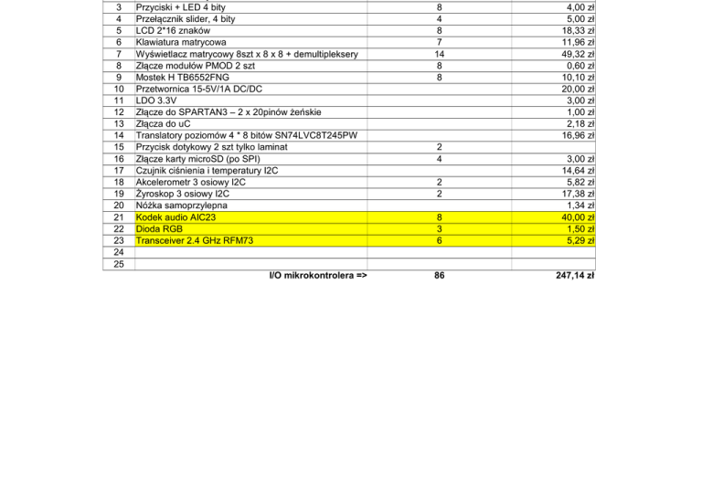 3 4 5 6 7 8 9 10 11 12 13 14 15 16 17 18 19 20 21 22 23 24 25 Przyciski + LED 4 bity Przełącznik slider, 4 bity LCD 2*16 znaków Klawiatura matrycowa Wyświetlacz matrycowy 8szt x 8 x 8 + demultipleksery Złącze modułów PMOD 2 szt Mostek H TB6552FNG Przetwornica 15-5V/1A DC/DC LDO 3.3V Złącze do SPARTAN3 – 2 x 20pinów żeńskie Złącza do uC Translatory poziomów 4 * 8 bitów SN74LVC8T245PW Przycisk dotykowy 2 szt tylko laminat Złącze karty microSD (po SPI) Czujnik ciśnienia i temperatury I2C Akcelerometr 3 osiowy I2C Żyroskop 3 osiowy I2C Nóżka samoprzylepna Kodek audio AIC23 Dioda RGB Transceiver 2.4 GHz RFM73 I/O mikrokontrolera => 8 4 8 7 14 8 8 2 4 4,00 zł 5,00 zł 18,33 zł 11,96 zł 49,32 zł 0,60 zł 10,10 zł 20,00 zł 3,00 zł 1,00 zł 2,18 zł 16,96 zł 8 3 6 3,00 zł 14,64 zł 5,82 zł 17,38 zł 1,34 zł 40,00 zł 1,50 zł 5,29 zł 86 247,14 zł 2 2 na oko na oko MARITEX TME MARITEX MARITEX KAMAMI cena orientacyjna cena orientacyjna MARITEX MARITEX KAMAMI MARITEX MARITEX MARITEX MARITEX TME KAMAMI MARITEX+TME MARITEX <=CENA ŁĄCZNA 80mm x 36mm 51mm x 70mm 8szt X 20,2mm x 20,2mm cena złącz śrubowych (2zł) na oko 51mm x 7mm cena na oko cena na oko (dużo drobnicy) 6x10mm (LED + 3x rezystor) 13x3mm (złącze) https://www.maritex.com.pl/pl/shop/item/lcmfd1602g6yly/14671/170 http://www.tme.eu/pl/details/kb304-pnw/klawiatury/accord/# https://www.maritex.com.pl/pl/shop/item/ltm0788r-cmbw-for/13103/11494 https://www.maritex.com.pl/pl/shop/item/pb06r/3436/9327 http://www.kamami.pl/index.php?ukey=product&productID=180048 https://www.maritex.com.pl/pl/shop/item/pld40r-1/8440/9327 https://www.maritex.com.pl/pl/shop/item/pb32s/3454/9327 http://www.kamami.pl/index.php?ukey=product&productID=178025 https://www.maritex.com.pl/pl/shop/item/card-msde8tfn/27134/ https://www.maritex.com.pl/pl/shop/item/ps-hp203b/32609/19627 https://www.maritex.com.pl/pl/shop/item/mma8451qt/34491/34509 https://www.maritex.com.pl/pl/shop/item/l3gd20/34495/34509 http://www.tme.eu/pl/details/ri-rbs-35/obudowy-nozki/richco/# http://kamami.pl/index.php?ukey=product&productID=180372 http://kamami.pl/index.php?ukey=product&productID=199233 https://www.maritex.com.pl/pl/shop/item/rfm73-s/26416/18064