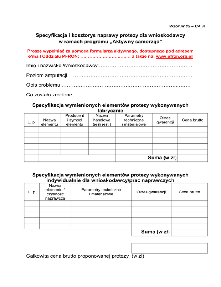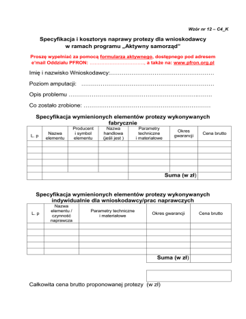 Wzór nr 12 – C4_K Specyfikacja i kosztorys naprawy protezy dla wnioskodawcy w ramach programu „Aktywny samorząd” Proszę wypełniać za pomocą formularza aktywnego, dostępnego pod adresem e’mail Oddziału PFRON: ……………………………, a także na: www.pfron.org.pl Imię i nazwisko Wnioskodawcy:……………………………………………… Poziom amputacji: …………………………………………………………… Opis problemu …………………………………………………………..……. Co zostało zrobione: ………………………………………………………… Specyfikacja wymienionych elementów protezy wykonywanych fabrycznie L. p Nazwa elementu Producent i symbol elementu Nazwa handlowa (jeśli jest ) Parametry techniczne i materiałowe Okres gwarancji Cena brutto Suma (w zł) Specyfikacja wymienionych elementów protezy wykonywanych indywidualnie dla wnioskodawcy/prac naprawczych L. p Nazwa elementu / czynność naprawcza Parametry techniczne i materiałowe Okres gwarancji Suma (w zł) Całkowita cena brutto proponowanej protezy (w zł) Cena brutto