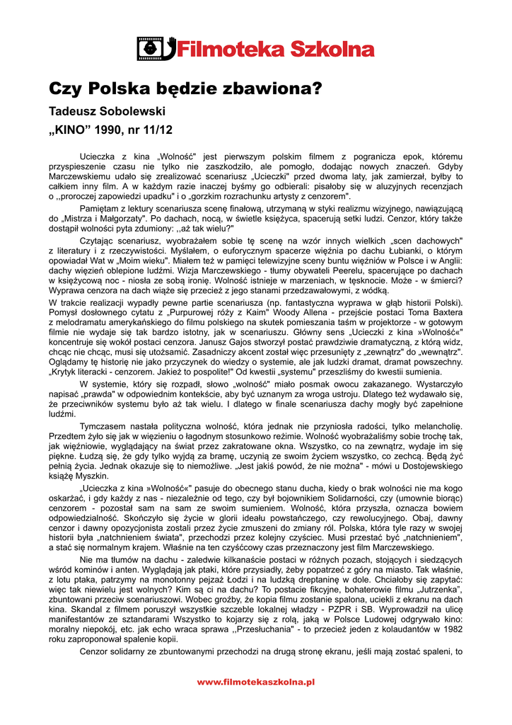 Czy Polska bdzie zbawiona? Tadeusz Sobolewski „KINO” 1990, nr 11/12 Ucieczka z kina „Wolno" jest pierwszym polskim filmem z pogranicza epok, któremu przyspieszenie czasu nie tylko nie zaszkodzio, ale pomogo, dodajc nowych znacze. Gdyby Marczewskiemu udao si zrealizowa scenariusz „Ucieczki" przed dwoma laty, jak zamierza, byby to cakiem inny film. A w kadym razie inaczej bymy go odbierali: pisaoby si w aluzyjnych recenzjach o ,,proroczej zapowiedzi upadku" i o „gorzkim rozrachunku artysty z cenzorem". Pamitam z lektury scenariusza scen finaow, utrzyman w styki realizmu wizyjnego, nawizujc do „Mistrza i Magorzaty". Po dachach, noc, w wietle ksiyca, spaceruj setki ludzi. Cenzor, który take dostpi wolnoci pyta zdumiony: ,,a tak wielu?" Czytajc scenariusz, wyobraaem sobie t scen na wzór innych wielkich „scen dachowych" z literatury i z rzeczywistoci. Mylaem, o euforycznym spacerze winia po dachu ubianki, o którym opowiada Wat w „Moim wieku". Miaem te w pamici telewizyjne sceny buntu winiów w Polsce i w Anglii: dachy wizie oblepione ludmi. Wizja Marczewskiego - tumy obywateli Peerelu, spacerujce po dachach w ksiycow noc - niosa ze sob ironi. Wolno istnieje w marzeniach, w tsknocie. Moe - w mierci? Wyprawa cenzora na dach wie si przecie z jego stanami przedzawaowymi, z wódk. W trakcie realizacji wypady pewne partie scenariusza (np. fantastyczna wyprawa w gb historii Polski). Pomys dosownego cytatu z „Purpurowej róy z Kaim" Woody Allena - przejcie postaci Toma Baxtera z melodramatu amerykaskiego do filmu polskiego na skutek pomieszania tam w projektorze - w gotowym filmie nie wydaje si tak bardzo istotny, jak w scenariuszu. Gówny sens „Ucieczki z kina »Wolno«" koncentruje si wokó postaci cenzora. Janusz Gajos stworzy posta prawdziwie dramatyczn, z któr widz, chcc nie chcc, musi si utosami. Zasadniczy akcent zosta wic przesunity z „zewntrz" do „wewntrz". Ogldamy t histori nie jako przyczynek do wiedzy o systemie, ale jak ludzki dramat, dramat powszechny. „Krytyk literacki - cenzorem. Jakie to pospolite!" Od kwestii „systemu" przeszlimy do kwestii sumienia. W systemie, który si rozpad, sowo „wolno" miao posmak owocu zakazanego. Wystarczyo napisa „prawda" w odpowiednim kontekcie, aby by uznanym za wroga ustroju. Dlatego te wydawao si, e przeciwników systemu byo a tak wielu. I dlatego w finale scenariusza dachy mogy by zapenione ludmi. Tymczasem nastaa polityczna wolno, która jednak nie przyniosa radoci, tylko melancholi. Przedtem yo si jak w wizieniu o agodnym stosunkowo reimie. Wolno wyobraalimy sobie troch tak, jak winiowie, wygldajcy na wiat przez zakratowane okna. Wszystko, co na zewntrz, wydaje im si pikne. udz si, e gdy tylko wyjd za bram, uczyni ze swoim yciem wszystko, co zechc. Bd y peni ycia. Jednak okazuje si to niemoliwe. „Jest jaki powód, e nie mona" - mówi u Dostojewskiego ksi Myszkin. „Ucieczka z kina »Wolno«" pasuje do obecnego stanu ducha, kiedy o brak wolnoci nie ma kogo oskara, i gdy kady z nas - niezalenie od tego, czy by bojownikiem Solidarnoci, czy (umownie biorc) cenzorem - pozosta sam na sam ze swoim sumieniem. Wolno, która przysza, oznacza bowiem odpowiedzialno. Skoczyo si ycie w glorii ideau powstaczego, czy rewolucyjnego. Obaj, dawny cenzor i dawny opozycjonista zostali przez ycie zmuszeni do zmiany ról. Polska, która tyle razy w swojej historii bya „natchnieniem wiata", przechodzi przez kolejny czyciec. Musi przesta by „natchnieniem", a sta si normalnym krajem. Wanie na ten czycowy czas przeznaczony jest film Marczewskiego. Nie ma tumów na dachu - zaledwie kilkanacie postaci w rónych pozach, stojcych i siedzcych wród kominów i anten. Wygldaj jak ptaki, które przysiady, eby popatrze z góry na miasto. Tak wanie, z lotu ptaka, patrzymy na monotonny pejza odzi i na ludzk dreptanin w dole. Chciaoby si zapyta: wic tak niewielu jest wolnych? Kim s ci na dachu? To postacie fikcyjne, bohaterowie filmu „Jutrzenka”, zbuntowani przeciw scenariuszowi. Wobec groby, e kopia filmu zostanie spalona, uciekli z ekranu na dach kina. Skandal z filmem poruszy wszystkie szczeble lokalnej wadzy - PZPR i SB. Wyprowadzi na ulic manifestantów ze sztandarami Wszystko to kojarzy si z rol, jak w Polsce Ludowej odgrywao kino: moralny niepokój, etc. jak echo wraca sprawa ,,Przesuchania" - to przecie jeden z kolaudantów w 1982 roku zaproponowa spalenie kopii. Cenzor solidarny ze zbuntowanymi przechodzi na drug stron ekranu, jeli maj zosta spaleni, to www.filmotekaszkolna.pl razem! Razem z bohaterami filmu cenzor wydostaje si na dach. Wydawaoby si - jest ju oczyszczony. A przecie dopiero tam zostanie zaatakowany: posta, któr usun kiedy z filmu, woa do niego: jak to, zbrodnia bya. a kary ma nie by?! „Nie mcz go, on przecie pamita" - broni cenzora Magorzata. Ale on ju rozumie i bez sowa wycofuje si tam, skd przyszed. Mamy wraenie, jakby na naszych oczach zwijaa si caa ta fantastyczno-groteskowa fabua, rodem z Buhakowa i Woody Allena. Wracamy do rzeczywistoci. Wic nie wystarczy by solidarnym z buntownikami, aby oczyci si z win? Dla cenzora nie ma miejsca na dachu, wród wolnych. Ale te - mao kto jest naprawd wolny. Cenzorowi nie pozostaje nic innego, jak wróci do siebie, do pokoju, który by wiadkiem jego degrengolady. Zasania okna, siedzi w pómroku. Ostatnie ujcie filmu: twarz Gajosa w zblieniu. Patrzy nam w oczy. Film zdaje si nie mie puenty - koczy si spojrzeniem, które zawisa w próni Marczewski celowo zrezygnowa z wielkiego finau na dachach. Pozostawi na kocu przejmujce spojrzenie bohatera, który domaga si odzewu ze strony widza. A jaka moe by odpowied na skruch? Po có by ten przysowiowy cenzor mia by przez autora prowokowany, draniony, poniany, wystawiany na prób, jak nie po to, bymy mogli mu w kocu przebaczy, tak jak zdaje si wspaniaomylnie wybacza Peerelowi reyser, skazany przez cenzur na dziewicioletnie milczenie? Marczewski posuguje si cytatami z cudzych dzie podobnie jak eseista, który chowa si za cudzymi sowami;