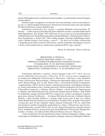232 KRONIKA danych bibliograficznych wyselekcjonowanych zgodnie z oczekiwaniami różnych kategorii użytkowników? Konferencyjne wystąpienia wywoływały ożywione dyskusje, zarówno po każdej sesji, jak i w ramach spotkań kuluarowych. Postulowano kontynuowanie tego typu spotkań. Dorobek konferencji zostanie opublikowany. Konferencji towarzyszyły trzy wystawy w gmachu Biblioteki Uniwersyteckiej: Biblioteka — źródło inspiracji prezentowała prace malarskie uczniów z Zespołu Społecznych Szkół Specjalnych „Dać Szansę” STO, Biblioteka Uniwersytecka dawniej przypominała na wielkoformatowych fotografiach poprzednią siedzibę Biblioteki, zbudowaną przy Krakowskim Przedmieściu w latach 1891–1894 według projektu Antoniego Jabłońskiego-Jasieńczyka i Stefana Szyllera, Duch płynący z materii — The Spirit out of Matter złożona była z fotograficznych kolaży autorstwa Diti Ravner, artystki izraelskiej mieszkającej czasowo w Polsce, która inspirowała się współczesnym gmachem BUW i jego „materią”. Wanda M. Rudzińska, Tadeusz Zadrożny BIBLIOTHECA LINDIANA. SAMUEL BOGUMIŁ LINDE (1771–1847), PIERWSZY DYREKTOR BIBLIOTEKI UNIWERSYTECKIEJ W WARSZAWIE. W 165. ROCZNICĘ ŚMIERCI (OGÓLNOPOLSKA KONFERENCJA NAUKOWA, WARSZAWA, BIBLIOTEKA UNIWERSYTECKA, 19–20 LISTOPADA 2012) Konferencja Bibliotheca Lindiana. Samuel Bogumił Linde (1771–1847), pierwszy dyrektor Biblioteki Uniwersyteckiej w Warszawie. W 165. rocznicę śmierci zorganizowana została przez Bibliotekę Uniwersytecką w Warszawie i włączona w ramy obchodów Święta Uniwersytetu Warszawskiego, a honorowym patronatem objęli ją rektor Uniwersytetu Warszawskiego prof. dr hab. Marcin Pałys i zwierzchnik Kościoła Ewangelicko-Augsburskiego w RP ks. bp Jerzy Samiec. Nad przygotowaniami i przebiegiem konferencji, której pomysłodawczynią i autorką głównych założeń programowych była dr Maria Cubrzyńska-Leonarczyk z Gabinetu Starych Druków, czuwał Komitet Organizacyjny w składzie: mgr Halina Mieczkowska, kierownik Gabinetu Starych Druków, i mgr Wanda M. Rudzińska, zastępca dyrektora BUW ds. naukowych i zbiorów specjalnych, wspomagany przez sekretarz konferencji — dr Joannę Milewską-Kozłowską z Gabinetu Starych Druków, a także Komitet Naukowy, w którego skład weszli: prof. dr hab. inż. Andrzej Marek Brandt (Instytut Podstawowych Problemów Techniki PAN), dr Maria Cubrzyńska-Leonarczyk, prof. dr hab. Stanisław Dubisz (Instytut Polonistyki UW), ks. radca Piotr Gaś (proboszcz parafii ewangelicko-augsburskiej św. Trójcy w Warszawie), mgr Ewa Kobierska-Maciuszko, dyrektor BUW, prof. dr hab. Wojciech Kriegseisen (Instytut Historii PAN), dr Marian Ptaszyk, emerytowany pracownik Biblioteki Uniwersytetu Mikołaja Kopernika w Toruniu, i dr Andrzej Sołtan (Muzeum Historyczne m.st. Warszawy). Celem konferencji było przypomnienie postaci Samuela Bogumiła Lindego i jego wielowątkowej działalności jako leksykografa, pedagoga, tłumacza, bibliografa, bibliote- Roczniki Biblioteczne LVII, 2013 © for this edition by CNS RB 57-2013.indb 232 2014-05-28 10:19:35 KRONIKA233 karza, ale także „człowieka politycznego”. Dla organizatorów szczególnie istotne było, iż Linde stworzył i kierował biblioteką przy założonym w 1816 roku Królewskim Uniwersytecie Warszawskim, a następnie był dyrektorem generalnym Biblioteki Publicznej przy tym Uniwersytecie i przyłączonych do niej gabinetów rycin, medali i starożytności — poprzedniczki dzisiejszej nowoczesnej Biblioteki Uniwersyteckiej w Warszawie. Program konferencji obejmował sześć sesji tematycznych. Obrady zainaugurowała sesja Czasy Samuela Bogumiła Lindego, której przewodniczyła dr Maria Cubrzyńska-Leonarczyk. W referacie Warszawa czasu Lindego dr Andrzej Sołtan przedstawił burzliwe i zmienne koleje losu miasta w pierwszej połowie XIX wieku, gdy okresy stagnacji i represji przeplatały się z okresami rozwoju, a stan i rozwój Warszawy zależał od panującego reżimu politycznego i racji stanu państw zaborczych, w związku z czym trudno mówić o jednej Warszawie podczas kilku dziesiątków lat, kiedy mieszkał w niej Linde. Profesor dr hab. Krzysztof Migoń (Uniwersytet Wrocławski) w referacie Kasaty klasztorów w XVIII i XIX w. i narodziny nowoczesnego bibliotekarstwa przedstawił konsekwencje sekularyzacji klasztorów w XVIII i XIX wieku: spowodowała ona głębokie zmiany w europejskim świecie książek — na rynku księgarskim, w kolekcjonerstwie i bibliofilstwie, a szczególnie w bibliotekach i bibliotekarstwie. Na przełomie stuleci pojawiły się nowe lub gruntownie zmodyfikowane typy bibliotek, zwłaszcza narodowe i uniwersyteckie, które zostały uposażone w niemałym stopniu zbiorami poklasztornymi. Rozwój nowych książnic (konieczność uporządkowania zbiorów, ich ochrony, skatalogowania, udostępniania, a także naukowego opracowania) przyczynił się do narodzin nowoczesnego bibliotekarstwa i profesjonalizacji zawodu bibliotekarza. Magister Jolanta Czerzniewska (BUW) w referacie Figura amatora. Stanisław Kostka Potocki — szlachcic, jako konserwator i inwentaryzator dziedzictwa na Królewskim Uniwersytecie Warszawskim scharakteryzowała dokonania Potockiego w organizacji Uniwersytetu — instytucji społecznej nastawionej na modernizację mentalności społecznej, inwentaryzację dóbr i konserwację pamięci. Podkreśliła, iż zakładając bibliotekę publiczną, gabinety i muzeum, minister Potocki posłużył się nowożytnymi metodami organizacji wiedzy, by wprowadzić je na tory reformy społecznej i legitymizacji narodowej wspólnoty językowej, Lindego zaś i Jana Feliksa Piwarskiego wyniósł do roli konserwatorów dziedzictwa i nauczycieli odpowiedzialnych za realizację projektu narodowego zjednoczenia. Sesję Linde i środowisko ewangelickie poprowadził ks. radca Piotr Gaś (parafia św. Trójcy, Warszawa). Profesor dr hab. inż. Andrzej Marek Brandt, potomek Lindego,