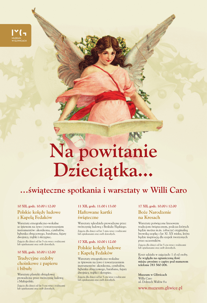Na powitanie Dzieciątka... …świąteczne spotkania i warsztaty w Willi Caro 10 XII, godz. 10.00 i 12.00 11 XII, godz. 11.00 i 13.00 17 XII, godz. 10.00 i 12.00 Polskie kolędy ludowe z Kapelą Fedaków Haftowane kartki świąteczne Boże Narodzenie na Kresach Warsztaty etnograficzno-wokalne ze śpiewem na żywo i towarzyszeniem instrumentów: akordeonu, cymbałów, bębenka obręczowego, barabanu, fujary dwojnicy, trąbki i skrzypiec. Warsztaty rękodzieła prowadzone przez twórczynię ludową z Beskidu Śląskiego. Zajęcia dla dzieci od lat 5-ciu wraz z rodzicami lub opiekunami oraz osób dorosłych. 17 XII, godz. 10.00 i 12.00 Warsztaty poświęcone kresowym tradycjom świątecznym, podczas których będzie można m.in. zobaczyć oryginalną lwowską szopkę z lat 30. XX wieku, która będzie inspiracją dla szopek tworzonych przez uczestników. 10 XII, godz. 10.00 i 12.00 Tradycyjne ozdoby choinkowe z papieru i bibuły Warsztaty plastyki obrzędowej prowadzone przez twórczynię ludową z Małopolski. Zajęcia dla dzieci od lat 5-ciu wraz z rodzicami lub opiekunami oraz osób dorosłych. Zajęcia dla dzieci od lat 7-miu wraz z rodzicami lub opiekunami oraz osób dorosłych. Polskie kolędy ludowe z Kapelą Fedaków Warsztaty etnograficzno-wokalne ze śpiewem na żywo i towarzyszeniem instrumentów: akordeonu, cymbałów, bębenka obręczowego, barabanu, fujary dwojnicy, trąbki i skrzypiec. Zajęcia dla dzieci od lat 5-ciu wraz z rodzicami lub opiekunami oraz osób dorosłych. Zajęcia dla dzieci od lat 5-ciu wraz z rodzicami lub opiekunami oraz osób dorosłych. Koszt udziału w zajęciach: 1 zł od osoby. Ze względu na ograniczoną ilość miejsc prosimy o zapisy pod numerem telefonu 783 560 006. Muzeum w Gliwicach Willa Caro ul. Dolnych Wałów 8 a www.muzeum.gliwice.pl