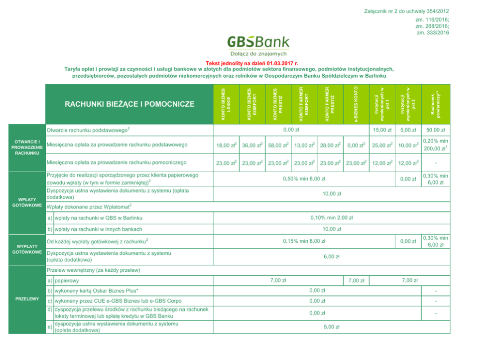 Załącznik nr do uchwały 354/2012 zm2 uchwała nr 254/2015; zm. 116/2016; zm. 268/2016; zm. 333/2016 OTWARCIE I PROWADZENIE RACHUNKU WPŁATY GOTÓWKOWE WYPŁATY GOTÓWKOWE Instytucji wymienionych w pkt 2 Rachunek powierniczy** e-BIZNES KONTO KONTO FARMER PRESTIŻ KONTO FARMER KOMFORT 0,00 zł Instytucji wymienionych w pkt 1 Otwarcie rachunku podstawowego2 KONTO BIZNES PRESTIŻ KONTO BIZNES KOMFORT RACHUNKI BIEŻĄCE I POMOCNICZE KONTO BIZNES LEKKIE Tekst jednolity na dzień 01.03.2017 r. Taryfa opłat i prowizji za czynności i usługi bankowe w złotych dla podmiotów sektora finansowego, podmiotów instytucjonalnych, przedsiębiorców, pozostałych podmiotów niekomercyjnych oraz rolników w Gospodarczym Banku Spółdzielczym w Barlinku 15,00 zł 5,00 zł 50,00 zł Miesięczna opłata za prowadzenie rachunku podstawowego 18,00 zł2 36,00 zł2 58,00 zł2 13,00 zł2 28,00 zł2 0,00 zł2 25,00 zł2 10,00 zł2 0,20% min 200,00 zł1 Miesięczna opłata za prowadzenie rachunku pomocniczego 23,00 zł2 23,00 zł2 23,00 zł2 23,00 zł2 23,00 zł2 23,00 zł2 12,00 zł2 12,00 zł2 - 0,00 zł 0,30% min 6,00 zł 0,00 zł 0,30% min 6,00 zł Przyjęcie do realizacji sporządzonego przez klienta papierowego dowodu wpłaty (w tym w formie zamkniętej)2 Dyspozycja ustna wystawienia dokumentu z systemu (opłata dodatkowa) 0,50% min 8,00 zł 10,00 zł Wpłaty dokonane przez Wpłatomat2 a) wpłaty na rachunki w GBS w Barlinku 0,10% min 2,00 zł b) wpłaty na rachunki w innych bankach 10,00 zł Od każdej wypłaty gotówkowej z rachunku2 0,15% min 8,00 zł Dyspozycja ustna wystawienia dokumentu z systemu (opłata dodatkowa) 6,00 zł Przelew wewnętrzny (za każdy przelew) a) papierowy PRZELEWY 7,00 zł 7,00 zł 7,00 zł b) wykonany kartą Oskar Biznes Plus* 0,00 zł - c) wykonany przez CUE e-GBS Biznes lub e-GBS Corpo 0,00 zł - 0,00 zł - d) dyspozycja przelewu środków z rachunku bieżącego na rachunek lokaty terminowej lub spłatę kredytu w GBS Banku dyspozycja ustna wystawienia dokumentu z systemu e) (opłata dodatkowa) 5,00 zł Rachunek powierniczy** Instytucji wymienionych w pkt 2 Instytucji wymienionych w pkt 1 e-BIZNES KONTO KONTO FARMER PRESTIŻ KONTO FARMER KOMFORT KONTO BIZNES PRESTIŻ KONTO BIZNES KOMFORT KONTO BIZNES LEKKIE RACHUNKI BIEŻĄCE I POMOCNICZE Przelew zewnętrzny (za każdy przelew) a) papierowy2 9,00 zł b) wykonany kartą Oskar Biznes Plus*2 9,00 zł 3,00 zł c) do ZUS i US wykonany przez CUE e-GBS Biznes d) pozostały wykonany przez CUE e-GBS Biznes 2 1,00 zł 0,00 zł 2 e) wykonany przez CUE e-GBS Corpo2 PRZELEWY 9,00 zł 0,00 zł 1,00 zł 1,00 zł - 1,00 zł - 1,00 zł - f) realizacja wysokokwotowych przelewów za pośrednictwem systemu SORBNET w kwocie niższej niż 1 mln zł 40,00 zł w kwocie wyższej lub równej 1 mln zł 20,00 zł Automatyczny z salda rachunku w terminie wynikającym z umowy lub dyspozycji Klienta (za każdy przelew) Przekazanie dywidendy od udziałów członkowskich na rachunek w innym banku 14,00 zł 5,00 zł Przekazanie wypowiedzianych udziałów członkowskich na rachunek w innym banku 0,2% min. 5,00 zł max. 20,00 zł Realizacja zlecenia stałego wewnętrznego2 0,00 zł - 5,00 zł - Realizacja zlecenia stałego zewnętrznego ze stałą i zmienną kwotą 2 a) za wykonanie każdego zlecenia za wykonanie każdego zlecenia do ZUS i US z wykorzystaniem usługi CUE e-GBS Biznes za wykonanie pozostałych zleceń z wykorzystaniem usługi c) CUE e-GBS Biznes za wykonanie każdego zlecenia z wykorzystaniem usługi d) CUE e-GBS CORPO b) ZLECENIA STAŁE POLECENIE ZAPŁATY 1,00 zł 0,00 zł 1,00 zł 0,00 zł 1,00 zł - 1,00 zł - 1,00 zł - Realizacja jednorazowego zlecenia stałego w oddziale banku 7,00 zł - Złożenie/ modyfikacja/ odwołanie dyspozycji zlecenia stałego ze stałą i zmienną kwotą a) w oddziale banku 3,00 zł - b) z wykorzystaniem usługi CUE e-GBS Biznes i e-GBS CORPO Zawiadomienie o braku środków na realizację zlecenia 0,00 zł - 8,00 zł - Realizacja wewnętrznego polecenia zapłaty 0,00 zł - 2 3,00 zł - Realizacja zewnętrznego polecenia zapłaty POLECENIE ZAPŁATY Przyjęcie/ modyfikacja/ odwołanie polecenia zapłaty 3,00 zł - WYCIĄGI Wyciągi okresowe wykonywane przez Klienta osobiście za pomocą usługi CUE e-GBS Biznes, e-GBS CORPO, za pomocą karty Oskar Biznes Plus* (za okres do 3 miesięcy) lub przekazywane raz w miesiącu zgodnie z dyspozycją Klienta zawartą w umowie 0,00 zł Na życzenie Klienta sporządzenie i wysyłanie wyciągów częściej niż raz w miesiącu. Opłata za każdy wyciąg 10,00 zł + koszty wysyłki wg opłat Poczty Polskiej Rachunek powierniczy** Instytucji wymienionych w pkt 2 Instytucji wymienionych w pkt 1 e-BIZNES KONTO KONTO FARMER PRESTIŻ KONTO FARMER KOMFORT KONTO BIZNES PRESTIŻ KONTO BIZNES KOMFORT KONTO BIZNES LEKKIE RACHUNKI BIEŻĄCE I POMOCNICZE Sporządzenie odpisu (opłata za każdy odpis, stawka podstawowa) a) każdego miesięcznego wyciągu 15,00 zł b) załącznika bez wyciągu 7,00 zł Sporządzenie historii operacji na rachunku na życzenie Klienta USŁUGA e-GBS BIZNES USŁUGA e-GBS CORPO USŁUGA GBS SMS BLANKIETY I KSIĄŻECZKI CZEKOWE a) z roku bieżącego 50,00 zł b) z lat ubiegłych (za każdy rok) 70,00 zł Opłata miesięczna za dostęp do usługi CUE e-GBS Biznes 0,00 zł - Wydanie jednego tokena do rachunku lub wydanie nowego tokena (np. w razie zgubienia, zniszczenia, itp.) lub wymiany tokena po upływie jego terminu ważności 50,00 zł - Instalacja i 2 godzinne szkolenie 50,00 zł - Wydanie 2 kart i 1 czytnika (za komplet) 50,00 zł - Wydanie kolejnego czytnika lub karty (za sztukę) 30,00 zł - 100,00 zł - Ponowna instalacja na wniosek Klienta 50,00 zł - Dodatkowe szkolenie - opłata za godzinę 50,00 zł - Opłata za wydanie karty lub czytnika w miejsce uszkodzonej karty lub czytnika (za sztukę) 50,00 zł - Nie zwrócenie karty lub czytnika do banku w ciągu 30 dni od daty wezwania (za sztukę) 50,00 zł - Obsługa - opłata miesięczna 2 Aktywna usługa GB