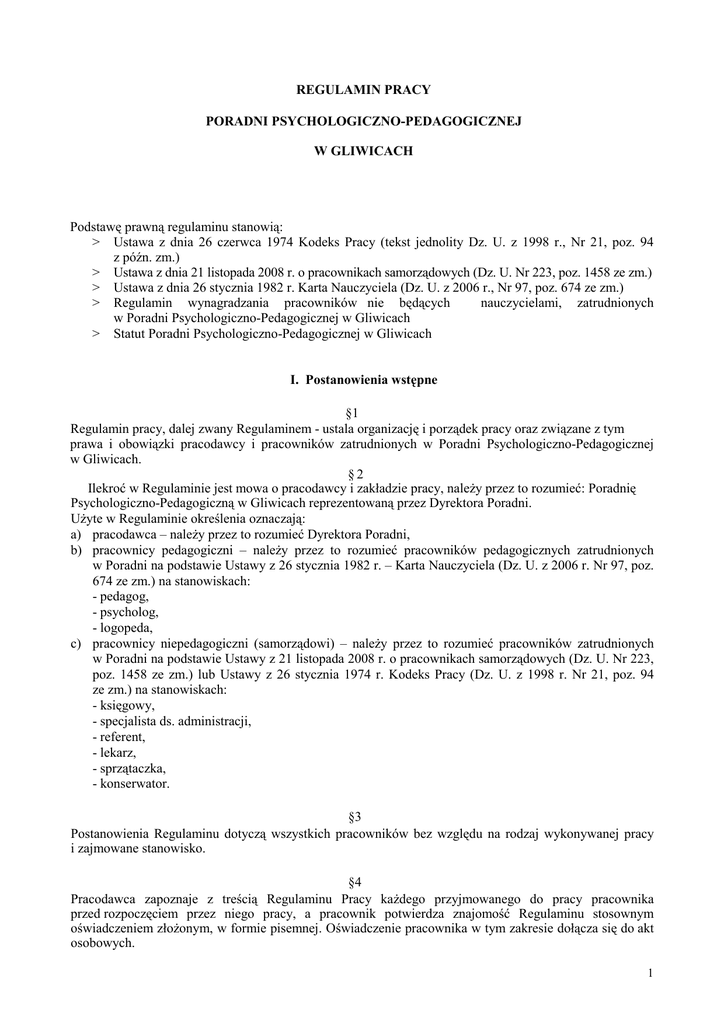 REGULAMIN PRACY PORADNI PSYCHOLOGICZNO-PEDAGOGICZNEJ W GLIWICACH Podstawę prawną regulaminu stanowią: > Ustawa z dnia 26 czerwca 1974 Kodeks Pracy (tekst jednolity Dz. U. z 1998 r., Nr 21, poz. 94 z późn. zm.) > Ustawa z dnia 21 listopada 2008 r. o pracownikach samorządowych (Dz. U. Nr 223, poz. 1458 ze zm.) > Ustawa z dnia 26 stycznia 1982 r. Karta Nauczyciela (Dz. U. z 2006 r., Nr 97, poz. 674 ze zm.) > Regulamin wynagradzania pracowników nie będących nauczycielami, zatrudnionych w Poradni Psychologiczno-Pedagogicznej w Gliwicach > Statut Poradni Psychologiczno-Pedagogicznej w Gliwicach I. Postanowienia wstępne §1 Regulamin pracy, dalej zwany Regulaminem - ustala organizację i porządek pracy oraz związane z tym prawa i obowiązki pracodawcy i pracowników zatrudnionych w Poradni Psychologiczno-Pedagogicznej w Gliwicach. §2 Ilekroć w Regulaminie jest mowa o pracodawcy i zakładzie pracy, należy przez to rozumieć: Poradnię Psychologiczno-Pedagogiczną w Gliwicach reprezentowaną przez Dyrektora Poradni. Użyte w Regulaminie określenia oznaczają: a) pracodawca – należy przez to rozumieć Dyrektora Poradni, b) pracownicy pedagogiczni – należy przez to rozumieć pracowników pedagogicznych zatrudnionych w Poradni na podstawie Ustawy z 26 stycznia 1982 r. – Karta Nauczyciela (Dz. U. z 2006 r. Nr 97, poz. 674 ze zm.) na stanowiskach: - pedagog, - psycholog, - logopeda, c) pracownicy niepedagogiczni (samorządowi) – należy przez to rozumieć pracowników zatrudnionych w Poradni na podstawie Ustawy z 21 listopada 2008 r. o pracownikach samorządowych (Dz. U. Nr 223, poz. 1458 ze zm.) lub Ustawy z 26 stycznia 1974 r. Kodeks Pracy (Dz. U. z 1998 r. Nr 21, poz. 94 ze zm.) na stanowiskach: - księgowy, - specjalista ds. administracji, - referent, - lekarz, - sprzątaczka, - konserwator. §3 Postanowienia Regulaminu dotyczą wszystkich pracowników bez względu na rodzaj wykonywanej pracy i zajmowane stanowisko. §4 Pracodawca zapoznaje z treścią Regulaminu Pracy każdego przyjmowanego do pracy pracownika przed rozpoczęciem przez niego pracy, a pracownik potwierdza znajomość Regulaminu stosownym oświadczeniem złożonym, w formie pisemnej. Oświadczenie pracownika w tym zakresie dołącza się do akt osobowych. 1 §5 Ilekroć w Regulaminie jest mowa o związkach zawodowych to rozumie się Związek Nauczycielstwa Polskiego (Ustawa o związkach zawodowych, art. 251). II. Obowiązki i prawa pracowników i pracodawcy §6 1. Dyrektor jest kierownikiem zakładu pracy dla zatrudnionych w Poradni PsychologicznoPedagogicznej w Gliwicach pracowników i dokonuje czynności w sprawach z zakresu prawa pracy w imieniu Pracodawcy. 2. Dyrektor jest uprawniony do podejmowania decyzji w sprawach dotyczących m. in.: a) zatrudniania i zwalniania pracowników, b) przyznawania nagród oraz wymierzania kar porządkowych pracownikom, c) występowania z wnioskami, po zasięgnięciu opinii Rady Pedagogicznej Poradni, w sprawach odznaczeń, nagród i innych wyróżnień pracowników. 3. Podczas nieobecności Dyrektora jego obowiązki przejmuje wyznaczona przez niego osoba, zaakceptowana przez Urząd Miasta. §7 1. Do obowiązków pracodawcy należy w szczególności: a) zaznajamianie pracowników podejmujących pracę z ich podstawowymi uprawnieniami, zakresem obowiązków, sposobem wykonywania pracy i ryzykiem zawodowym na poszczególnych stanowiskach, b) organizowanie pracy w sposób zapewniający pełne wykorzystanie czasu pracy, jak również osiąganie przez pracowników, z wykorzystaniem ich uzdolnień i kwalifikacji wysokiej wydajności i należytej jakości pracy, c) wpływanie na kształtowanie w zakładzie pracy zasad współżycia społecznego, d) zapewnienie bezpiecznych i higienicznych warunków pracy oraz prowadzenie systematycznie szkolenia pracowników z zakresu bezpieczeństwa i higieny pracy, e) kierowanie pracowników na badania profilaktyczne i okresowe, f) dopuszczanie do pracy wyłącznie pracowników, których stan zdrowia gwarantuje bezpieczne wykonywanie powierzonej pracy, g) terminowe i prawidłowe wypłacanie wynagrodzenia, h) ułatwianie pracownikom podnoszenia kwalifikacji zawodowych, i) zaspokajanie w miarę posiadanych środków socjalnych kulturalnych potrzeb pracowników, j) stosowanie obiektywnych i sprawiedliwych kryteriów oceny pracowników oraz wyników ich pracy, k) zabezpieczenie warunków ochrony przeciwpożarowej w zakresie bezpieczeństwa osób i ochrony mienia oraz zaznajamianie pracowników z przepisami p. poż., l) prowadzenie dokumentacji i akt osobowych pracowników w sprawach związanych ze stosunkiem pracy, m) zapewnienie pomocy nauczycielom w realizacji ich zadań i doskonaleniu zawodowym, n) przeciwdziałanie mobbingowi oraz dyskryminacji w zatrudnieniu, o) Dyrektor odpowiedzialny jest za realizację zadań zgodnie ze Statutem Poradni oraz uchwałami Rady Pedagogicznej, podjętymi w ramach jej kompetencji stanowiących oraz zarządzeniami organów nadzorujących Poradnię. §8 1. Dyrektor ma prawo wydawać decyzje i polecenia pracownikom bezpośrednio lub za pośrednictwem koordynatorów w zakresie organizacji pracy i porządku. 2. Dyrektor Poradni w czasie nieobecności podległego pracownika wyznacza na ten okres innego pracownika lub rozdziela czynności pracownika nieobecnego pomiędzy innych pracowników. §9 1. Dyrektor Poradni przyjmuje w wyznaczonych terminach w sprawach np. projektów, planów, w sprawach skarg, wniosków i zażaleń. 2. Terminy, o których mowa w pkt. 1 podaje się do wiadomości poprzez wywieszenie w widocznym miejscu. 2 §10 Pracodawca informuje pracownika, nie później niż wciągu 7 dni od dnia zawarcia umowy o pracę, o obowiązującej dobowej i tygodniowej normie czasu pracy, urlopie wypoczynkowym oraz długości okresu wypowiedzenia umowy o pracę. § 11 1. Ustawowy obowiązek przeciwdziałania mobbingowi pracodawca realizuje poprzez wyznaczenie pełnomocnika ds. przeciwdziałania mobbingowi i dyskrymi