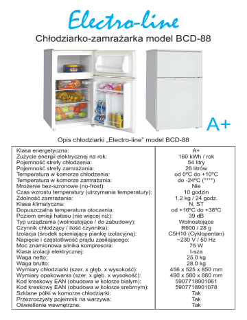 Electro-line Ch³odziarko-zamra¿arka model BCD-88 A+ Opis ch³odziarki „Electro-line” model BCD-88 Klasa energetyczna: Zu¿ycie energii elektrycznej na rok: Pojemnoœæ strefy ch³odzenia: Pojemnoœæ strefy zamra¿ania: Temperatura w komorze ch³odzenia: Temperatura w komorze zamra¿ania: Mro¿enie bez-szronowe (no-frost): Czas wzrostu temperatury (utrzymania temperatury): Zdolnoœæ zamra¿ania: Klasa klimatyczna: Dopuszczalna temperatura otoczenia: Poziom emisji ha³asu (nie wiêcej ni¿): Typ urz¹dzenia (wolnostoj¹ce / do zabudowy): Czynnik ch³odz¹cy / iloœæ czynnika): Izolacja (œrodek spieniaj¹cy piankê izolacyjn¹): Napiêcie i czêstotliwoœæ pr¹du zasilaj¹cego: Moc znamionowa silnika kompresora: Klasa izolacji elektrycznej: Waga netto: Waga brutto: Wymiary ch³odziarki (szer. x g³êb. x wysokoœæ): Wymiary opakowania (szer. x g³êb. x wysokoœæ): Kod kreskowy EAN (obudowa w kolorze bia³ym): Kod kreskowy EAN (obudowa w kolorze srebrnym): Szklane pó³ki w komorze ch³odziarki: Przezroczysty pojemnik na warzywa: Oœwietlenie wewnêtrzne: A+ 160 kWh / rok 54 litry 26 litrów od 0ºC do +10ºC do -24ºC (****) Nie 10 godzin 1.2 kg / 24 godz. N, ST od +16ºC do +38ºC 39 dB Wolnostoj¹ce R600 / 28 g C5H10 (Cyklopentan) ~230 V / 50 Hz 75 W I-sza 25.0 kg 28.0 kg 456 x 525 x 850 mm 490 x 580 x 880 mm 5907718901061 5907718901078 Tak Tak Tak