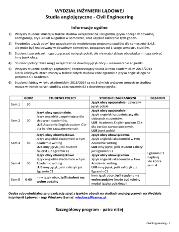 WYDZIAŁ INŻYNIERII LĄDOWEJ Studia anglojęzyczne - Civil Engineering Informacje ogólne 1) Wszyscy studenci muszą w trakcie studiów uczęszczad na 180 godzin języka obcego w dowolnej konfiguracji, czyli 30 lub 60 godzin w semestrze, oraz uzyskad zaliczenie tych godzin. 2) Przedmiot „Język obcy” jest przypisany do modelowego programu studiów dla semestrów 3,4,5, ale może byd realizowany w dowolnym semestrze, począwszy od 1-szego semestru studiów. 3) Studenci zagraniczni mogą uczęszczad na język polski, ale nie mają takiego obowiązku - mogą wybrad inny język obcy. 4) Studenci polscy także mogą uczęszczad na dowolny język obcy – niekoniecznie angielski. 5) Wszyscy studenci (polscy i zagraniczni) rozpoczynający studia w roku akademickim 2013/2014 lub w kolejnych latach muszą w trakcie całych studiów zdad egzamin z języka angielskiego na poziomie C1 Academic. 6) Studenci, którzy w roku akademickim 2013/2014 są na 3-cim lub wyższym semestrze studiów muszą w trakcie całych studiów zdad egzamin B2 z dowolnego języka. GODZ Sem 1 Sem 2 Sem 3 STUDENCI POLSCY 30 30 60 Sem 4 60 Sem 5 0-60 Język obcy opcjonalnie. Język angielski uzupełniający dla słabszych studentów. LUB Academic English poziom C1+ dla bardzo zaawansowanych. Język obcy obowiązkowo. Język angielski akademicki w tym Academic writing LUB inny język, jeśli student zaliczył już Egzamin C1 Język obcy obowiązkowo Język angielski akademicki w tym Academic writing. LUB inny język, jeśli zaliczyli już Egzamin C1 Inny język obcy, jeśli student ma wolne godziny STUDENCI ZAGRANICZNI Język obcy opcjonalnie - zalecany język polski Język obcy opcjonalnie. Język angielski uzupełniający dla słabszych studentów. LUB Academic English poziom C1+ dla bardzo zaawansowanych. LUB język polski Język obcy obowiązkowo. Język angielski akademicki w tym Academic writing LUB inny język, jeśli student zaliczył już Egzamin C1 Język obcy obowiązkowo Język angielski akademicki w tym Academic writing. LUB inny język, jeśli zaliczyli już Egzamin C1 Inny język obcy, jeśli student ma wolne godziny (może byd kolejny moduł języka polskiego). EGZAMIN Egzamin C1 najdalej do kooca sem. 4. Osoba odpowiedzialna za organizację zajęd z języków obcych na studiach anglojęzycznych na Wydziałe Inżyniernii Lądowej - mgr Wiesława Barnaś [email protected] Szczegółowy program - patrz niżej Civil Engineering - 1 Program dla studentów Civil Engineering rozpoczynających studia od roku akad. 2013/2014 Sem 1 Studentom zagranicznym zalecamy 30 h 30 godz języka polskiego. Zapisy przez stronę SJO (Polish for foreigners) i na dyżurach mgr Marty Szpak. Semestr kooczy się zaliczeniem. Pozostali studenci na 1-szym semestrze nie mają języka obcego Wszyscy Sem 2 studenci 30 h piszą test diagnostyczny Studenci, którzy po teście diagnostycznym zostali sklasyfikowani poniżej poziomu B2+. Lektorat tzw. ‘pościgowy’ przygotowujący do uczestnictwa w kursie Academic English poziom C1. Semestr kooczy się zaliczeniem. Studenci zagraniczni mogą kontynuowad naukę języka polskiego Pozostali studenci na 2-gim semestrze nie mają języka obcego Sem 3 Studenci, którzy nie zaliczyli jeszcze Egzaminu C1 Lektorat Academic English na poziomie C1. Semestr kooczy się zaliczeniem. Studenci, którzy zaliczyli już egzamin C1 Wybierają drugi język, który będą kontynuuowad do wykorzystania całych 180 godzin. Cudzoziemcy mogą kontynuowad naukę języka polskiego na kolejnych modułach. 60 h Studenci, którzy nie zaliczyli jeszcze Sem 4 Egzaminu C1 Zakooczenie kursu Kontynuują lektorat Academic English na Egzaminem C1 poziomie C1 Academic 60 h Studenci, którzy zaliczyli już egzamin C1 Sem 5 Studenci, którzy mają jeszcze wolne 0-60 h godziny Kontynuują drugi język i/lub wybierają lektorat języka angielskiego na poziomie C2 Kontynuują drugi język Zalecane zakooczenie kursu Egzaminem A2-B2 w zależności od poziomu studenta i/lub wybierają lektorat języka angielskiego na poziomie C2 JL 01.10.2015 Civil Engineering - 2