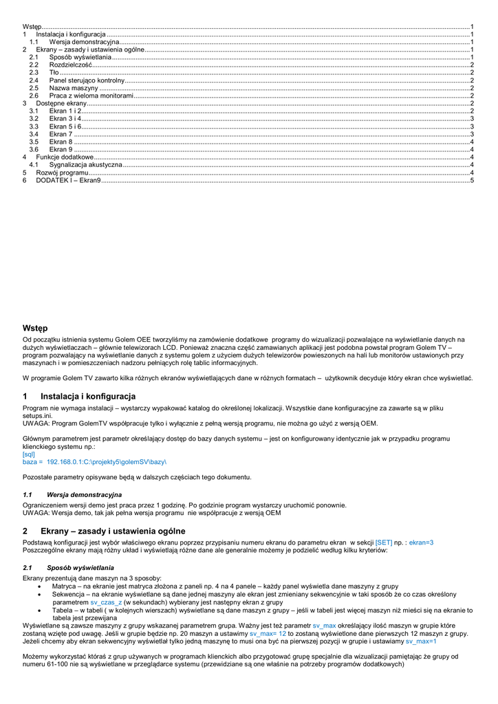 Wstęp............................................................................................................................................................................................................................................. 1 1 Instalacja i konfiguracja ......................................................................................................................................................................................................... 1 1.1 Wersja demonstracyjna.................................................................................................................................................................................................. 1 2 Ekrany – zasady i ustawienia ogólne.................................................................................................................................................................................... 1 2.1 Sposób wyświetlania ...................................................................................................................................................................................................... 1 2.2 Rozdzielczość................................................................................................................................................................................................................. 2 2.3 Tło ................................................................................................................................................................................................................................... 2 2.4 Panel sterująco kontrolny............................................................................................................................................................................................... 2 2.5 Nazwa maszyny ............................................................................................................................................................................................................. 2 2.6 Praca z wieloma monitorami .......................................................................................................................................................................................... 2 3 Dostępne ekrany.................................................................................................................................................................................................................... 2 3.1 Ekran 1 i 2....................................................................................................................................................................................................................... 2 3.2 Ekran 3 i 4....................................................................................................................................................................................................................... 3 3.3 Ekran 5 i 6....................................................................................................................................................................................................................... 3 3.4 Ekran 7 ........................................................................................................................................................................................................................... 3 3.5 Ekran 8 ........................................................................................................................................................................................................................... 4 3.6 Ekran 9 ........................................................................................................................................................................................................................... 4 4 Funkcje dodatkowe ................................................................................................................................................................................................................ 4 4.1 Sygnalizacja akustyczna ................................................................................................................................................................................................ 4 5 Rozwój programu................................................................................................................................................................................................................... 4 6 DODATEK I – Ekran9 ............................................................................................................................................................................................................ 5 Wstęp Od początku istnienia systemu Golem OEE tworzyliśmy na zamówienie dodatkowe programy do wizualizacji pozwalające na wyświetlanie danych na dużych wyświetlaczach – głównie telewizorach LCD. Ponieważ znaczna część zamawianych aplikacji jest podobna powstał program Golem TV – program pozwalający na wyświetlanie danych z systemu golem z użyciem dużych telewizorów powieszonych na hali lub monitorów ustawionych przy maszynach i w pomieszczeniach nadzoru pełniących rolę tablic informacyjnych. W programie Golem TV zawarto kilka różnych ekranów wyświetlających dane w różnych formatach – użytkownik decyduje który ekran chce wyświetlać. 1 Instalacja i konfiguracja Program nie wymaga instalacji – wystarczy wypakować katalog do określonej lokalizacji. Wszystkie dane konfiguracyjne za zawarte są w pliku setups.ini. UWAGA: Program GolemTV współpracuje tylko i wyłącznie z pełną wersją programu, nie można go użyć z wersją OEM. Głównym parametrem jest parametr określający dostęp do bazy danych systemu – jest on konfigurowany identycznie jak w przypadku programu klienckiego systemu np.: [sql]