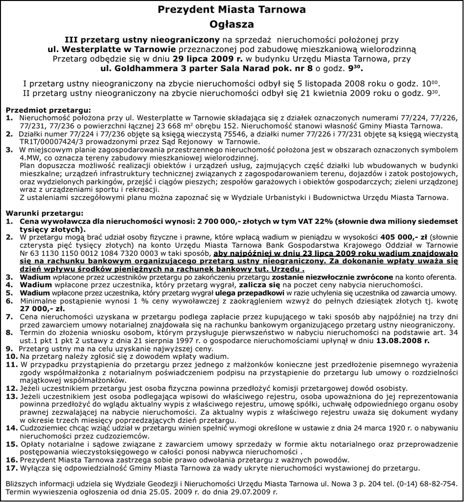 Prezydent Miasta Tarnowa Ogłasza III przetarg ustny nieograniczony na sprzedaż nieruchomości położonej przy ul. Westerplatte w Tarnowie przeznaczonej pod zabudowę mieszkaniową wielorodzinną Przetarg odbędzie się w dniu 29 lipca 2009 r. w budynku Urzędu Miasta Tarnowa, przy ul. Goldhammera 3 parter Sala Narad pok. nr 8 o godz. 930. I przetarg ustny nieograniczony na zbycie nieruchomości odbył się 5 listopada 2008 roku o godz. 1000. II przetarg ustny nieograniczony na zbycie nieruchomości odbył się 21 kwietnia 2009 roku o godz. 930. Przedmiot przetargu: 1. Nieruchomość położona przy ul. Westerplatte w Tarnowie składająca się z działek oznaczonych numerami 77/224, 77/226, 77/231, 77/236 o powierzchni łącznej 23 668 m2 obrębu 152. Nieruchomość stanowi własność Gminy Miasta Tarnowa. 2. Działki numer 77/224 i 77/236 objęte są księgą wieczystą 75546, a działki numer 77/226 i 77/231 objęte są księgą wieczystą TR1T/00007424/3 prowadzonymi przez Sąd Rejonowy w Tarnowie. 3. W miejscowym planie zagospodarowania przestrzennego nieruchomość położona jest w obszarach oznaczonych symbolem 4.MW, co oznacza tereny zabudowy mieszkaniowej wielorodzinnej. Plan dopuszcza możliwość realizacji obiektów i urządzeń usług, zajmujących część działki lub wbudowanych w budynki mieszkalne; urządzeń infrastruktury technicznej związanych z zagospodarowaniem terenu, dojazdów i zatok postojowych, oraz wydzielonych parkingów, przejść i ciągów pieszych; zespołów garażowych i obiektów gospodarczych; zieleni urządzonej wraz z urządzeniami sportu i rekreacji. Z ustaleniami szczegółowymi planu można zapoznać się w Wydziale Urbanistyki i Budownictwa Urzędu Miasta Tarnowa. Warunki przetargu: 1. Cena wywoławcza dla nieruchomości wynosi: 2 700 000,- złotych w tym VAT 22% (słownie dwa miliony siedemset tysięcy złotych). 2. W przetargu mogą brać udział osoby fizyczne i prawne, które wpłacą wadium w pieniądzu w wysokości 405 000,- zł (słownie czterysta pięć tysięcy złotych) na konto Urzędu Miasta Tarnowa Bank Gospodarstwa Krajowego Oddział w Tarnowie Nr 63 1130 1150 0012 1084 7320 0003 w taki sposób, aby najpóźniej w dniu 23 lipca 2009 roku wadium znajdowało się na rachunku bankowym organizującego przetarg ustny nieograniczony. Za dokonanie wpłaty uważa się dzień wpływu środków pieniężnych na rachunek bankowy tut. Urzędu . 3. Wadium wpłacone przez uczestników przetargu po zakończeniu przetargu zostanie niezwłocznie zwrócone na konto oferenta. 4. Wadium wpłacone przez uczestnika, który przetarg wygrał, zalicza się na poczet ceny nabycia nieruchomości. 5. Wadium wpłacone przez uczestnika, który przetarg wygrał ulega przepadkowi w razie uchylenia się uczestnika od zawarcia umowy. 6. Minimalne postąpienie wynosi 1 % ceny wywoławczej z zaokrągleniem wzwyż do pełnych dziesiątek złotych tj. kwotę 27 000,- zł. 7. Cena nieruchomości uzyskana w przetargu podlega zapłacie przez kupującego w taki sposób aby najpóźniej na trzy dni przed zawarciem umowy notarialnej znajdowała się na rachunku bankowym organizującego przetarg ustny nieograniczony. 8. Termin do złożenia wniosku osobom, którym przysługuje pierwszeństwo w nabyciu nieruchomości na podstawie art. 34 ust.1 pkt 1 pkt 2 ustawy z dnia 21 sierpnia 1997 r. o gospodarce nieruchomościami upłynął w dniu 13.08.2008 r. 9. Przetarg ustny ma na celu uzyskanie najwyższej ceny. 10. Na przetarg należy zgłosić się z dowodem wpłaty wadium. 11. W przypadku przystąpienia do przetargu przez jednego z małżonków konieczne jest przedłożenie pisemnego wyrażenia zgody współmałżonka z notarialnym poświadczeniem podpisu na przystąpienie do przetargu lub umowy o rozdzielności majątkowej współmałżonków. 12. Jeżeli uczestnikiem przetargu jest osoba fizyczna powinna przedłożyć komisji przetargowej dowód osobisty. 13. Jeżeli uczestnikiem jest osoba podlegająca wpisowi do właściwego rejestru, osoba upoważniona do jej reprezentowania powinna przedłożyć do wglądu aktualny wypis z właściwego rejestru, umowę spółki, uchwałę odpowiedniego organu osoby prawnej zezwalającej na nabycie nieruchomości. Za aktualny wypis z właściwego rejestru uważa się dokument wydany w okresie trzech miesięcy poprzedzających dzień przetargu. 14. Cudzoziemiec chcąc wziąć udział w przetargu winien spełnić wymogi określone w ustawie z dnia 24 marca 1920 r. o nabywaniu nieruchomości przez cudzoziemców. 15. Opłaty notarialne i sądowe związane z zawarciem umowy sprzedaży w formie aktu notarialnego oraz przeprowadzenie postępowania wieczystoksięgowego w całości ponosi nabywca nieruchomości . 16. Prezydent Miasta Tarnowa zastrzega sobie prawo odwołania przetargu z ważnych powodów. 17. Wyłącza się odpowiedzialność Gminy Miasta Tarnowa za wady ukryte nieruchomości wystawionej do przetargu. Bliższych informacji udziela się Wydziale Geodezji i Nieruchomości Urzędu Miasta Tarnowa ul. Nowa 3 p. 204 tel. (0-14) 68-82-754. Termin wywieszenia ogłoszenia od dnia 25.05. 2009 r. do dnia 29.07.2009 r.