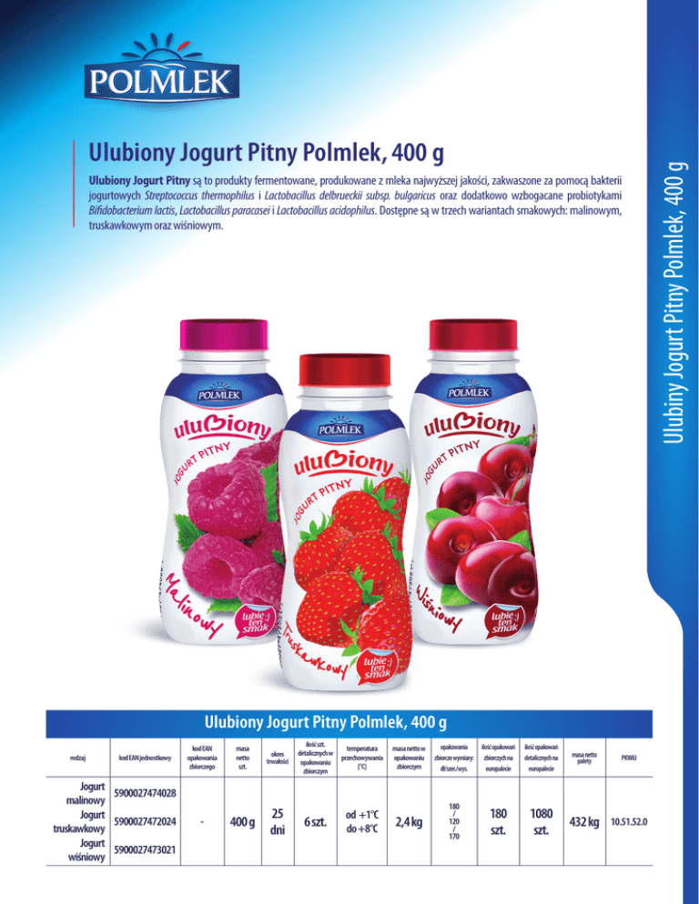 Ulubiony Jogurt Pitny są to produkty fermentowane, produkowane z mleka najwyższej jakości, zakwaszone za pomocą bakterii jogurtowych Streptococcus thermophilus i Lactobacillus delbrueckii subsp. bulgaricus oraz dodatkowo wzbogacane probiotykami Bifidobacterium lactis, Lactobacillus paracasei i Lactobacillus acidophilus. Dostępne są w trzech wariantach smakowych: malinowym, truskawkowym oraz wiśniowym. Ulubiony Jogurt Pitny Polmlek, 400 g rodzaj kod EAN jednostkowy Jogurt 5900027474028 malinowy Jogurt 5900027472024 truskawkowy Jogurt 5900027473021 wiśniowy kod EAN opakowania zbiorczego - masa netto szt. okres trwałości 25 400 g dni ilość szt. temperatura detalicznych w przechowywania opakowaniu [°C] zbiorczym 6 szt. od +1°C do +8°C masa netto w opakowaniu zbiorczym 2,4 kg opakowania ilość opakowań zbiorcze wymiary: zbiorczych na dł/szer./wys. europalecie 180 / 120 / 170 180 szt. ilość opakowań detalicznych na europalecie masa netto palety PKWiU 1080 szt. 432 kg 10.51.52.0 Ulubiny Jogurt Pitny Polmlek, 400 g Ulubiony Jogurt Pitny Polmlek, 400 g