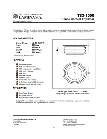 T83-1000 Phase Control Thyristor KKT83630, July 2005 version Thyristors type T83 are of modern design with pressure contacts, high alumina ceramic insulator and cold-welding encapsulation. Designed for use in power electronic circuits and equipment under normal operating conditions. KEY PARAMETERS UDRM, URRM IT(AV) ITSM du/dt* di/dt up to 1200 V 1000 A 18000 A 1000 V/s 200 A/s * maximum (non standard) value FEATURES all diffused design high current capabilities high surge current capabilities high rates voltages high du/dt low gate current dynamic gate low thermal impedance tested according to IEC standards compact size and small weight APPLICATION Outline type code: JEDEC TO-200AC See package details for further information High Power Drives DC Motor Control High Voltage Power Supplies Designed for use in high power industrial and commercial electronic circuits and equipment where high currents are encoutered and high reliability is essential. Zakłady Elektronowe LAMINA S.A. Puławska 34 PL-05-500 Piaseczno POLAND Tel.: +48-22-7572731 Tel.: +48-22-3989409 Fax.: +48-22-3989407 e-mail: [email protected] www.lamina.com.pl 1/7 T83-1000 Phase Control Thyristor KKT83630, July 2005 version ORDERING INFORMATION When ordering please refer to device code builder presented below. Please use the complete part number when ordering, quote or in any future correspondence relating to your order. T83-1000- voltage class (hundreds of volts) This is standard device, with no dynamic parameters specified and standard accessory set. Please refer to Electrical Parameters if specific dynamic demands have to be met. Those information, as well as any other concerning non-standard accessories e.g. custom leads lenght or lead terminal connector type should be included in the order. ELECTRICAL PARAMETERS Voltage ratings UDRM, URRM Voltage class UDSM, URSM IDRM, IRRM mA V V 02 200 300 04 400 500 06 600 700 08 800 900 10 1000 1100 12 1200 1300 60 dU/dt group codes du/dt Group code V/s 0 no specified value 5 320 6 500 7 1000 Zakłady Elektronowe LAMINA S.A. Puławska 34 PL-05-500 Piaseczno POLAND Tel.: +48-22-7572731 Tel.: +48-22-3989409 Fax.: +48-22-3989407 e-mail: [email protected] www.lamina.com.pl 2/7 T83-1000 Phase Control Thyristor KKT83630, July 2005 version Electrical properties Parameter Average on-state current Unit Test conditions Value IT(AV) A 1000 Tc °C 80 RMS on-state current IT(RMS) A Surge on-state current ITSM A I2t kA2s Case temperature I2t – value On-state voltage max. 1570 Tj=125°C, UR=URRM, tp=10ms 18000 1620 Tj=25°C, ITM=1500A UTM V Treshold voltage UT(T0) V 0,79 Slope resistance rT mΩ 0,20 Latching current Il mA Tj=25°C, UD=12V 800 Holding current IH mA Tj=25°C, UD=12V 200 tq (typ) s Tj=125°C, ITM=250A, diR/dt=25A/s, du/dt=20V/s, UD=0,67UDRM, URM=100V 150 ton s ITM=100A, UDM=100V 12 200 Circuit commutated turn-off time (typical) Turn-0n time (typical) 1,25 Rate of rise of on-state currentrepetitive di/dt A/s Tj=125°C, ITM=3IT(AV), UD=0,67UDRM, f=50Hz, IGM=1A, diG/dt=1A/s Critical rate of raise of off-state voltage du/dt V/s Tj=125°C, UD=0,67UDRM, 320 – 1000 (see du/dt group codes) Gate current to trigger IGT mA Tj=25°C, UD=12V 200 Gate voltage to trigger UGT V Tj=25°C, UD=12V 3 Termal properties Parameter Unit Test conditions Value RthJC °C/W two sided, DC 0,032 RthCS °C/W two sided 0,020 Tjmin...Tjmax °C -40...+125 Tstg °C -40...+125 Thermal resistance, junction to case Thermal resistance, case to heatsink Operating junction temperature Storage temperature Mechanical properties Parameter Unit Value Clamping force FM kN 12,0 ... 14,0 Weight m g 260 Zakłady Elektronowe LAMINA S.A. Puławska 34 PL-05-500 Piaseczno POLAND Tel.: +48-22-7572731 Tel.: +48-22-3989409 Fax.: +48-22-3989407 e-mail: [email protected] www.lamina.com.pl 3/7 T83-1000 Phase Control Thyristor KKT83630, July 2005 version Package details For further package information, please contact Sales & Marketing Department. All dimensions in mm, unless stated otherwise. Do not scale. Zakłady Elektronowe LAMINA S.A. Puławska 34 PL-05-500 Piaseczno POLAND Tel.: +48-22-7572731 Tel.: +48-22-3989409 Fax.: +48-22-3989407 e-mail: [email protected] www.lamina.com.pl 4/7 T83-1000 Phase Control Thyristor KKT83630, July 2005 version PT(AV), [W] PT(AV), [W] 1400 1800 o 180 DC o 120 1200 1600 o o 90 180 1400 o o 60 1000 120 1200 o o 30 800 o 90 60 1000 o 30 800 600 600 400 400 200 200 Q 0 0 100 200 300 400 500 600 700 800 900 Q 0 1000 1100 0 200 400 600 800 1000 1200 1400 IT(AV), [A] Power loss characteristics. Sinus wave form. 1600 IT(AV), [A] Power loss characteristics. Square wave form. o TC, [ C] o TC, [ C] 130 130 120 120 110 110 Q Q 100 100 90 90 o o 30 80 o 30 80 o 60 60 o 90 o 90 o 120 o 120 o 180 o 180 70 DC 70 0 100 200 300 400 500 600 700 800 900 Case temperature ratings. Sinus wave form. 60 1000 1100 0 200 400 600 800 1000 1200 IT(AV), [A] Case temperature ratings. Square wave form. Zakłady Elektronowe LAMINA S.A. Puławska 34 PL-05-500 Piaseczno POLAND Tel.: +48-22-7572731 Tel.: +48-22-3989409 Fax.: +48-22-3989407 e-mail: [email protected] www.lamina.com.pl 5/7 1400 1600 IT(AV), [A] T83-1000 Phase Control Thyristor KKT83630, July 2005 version ITSM, [kA] UTM, V 3,0 18 Tj=Tjmax 2,5 Tj=Tjmax UR=0,8URRM 16 2,0 14 1,5 12 1,0 10 8 1 10 0,5 100 100 1000 n Non-repetitive surge current rating On-state characteristic o Zth(t), C/W 0,1 0,01 0,001 0,001 0,01 0,1 1 10000 ITM, A 10 t, s Transient thermal impedance Zakłady Elektronowe LAMINA S.A. Puławska 34 PL-05-500 Piaseczno POLAND Tel.: +48-22-7572731 Tel.: +48-22-3989409 Fax.: +48-22-3989407 e-mail: [email protected] www.lamina.com.pl 6/7 600 iG, mA 500 400 o Tj = -40 C T83-1000 300 Phase Control Thyristor 200 o Tj = +25 C Tj = +125oC 100 KKT83630, July 2005 version uG, V 0 0 1 2 3 4 5 UGD = 0,25V Gate characteristics Gate characteristic. Possible trigger area. 4 600 iG, mA UFGM = 20V IFGM = 4A iG, A 500 3 400 Tj = -40oC 2 300 PGM = 16W B 200 Tj = +25oC o Tj = +125 C 1 R 1