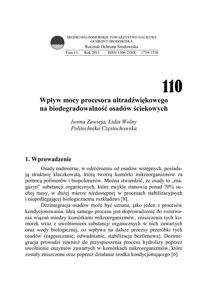 ŚRODKOWO-POMORSKIE TOWARZYSTWO NAUKOWE OCHRONY ŚRODOWISKA Rocznik Ochrona Środowiska Tom 13. Rok 2011 ISSN 1506-218X 1719-1730 110 Wpływ mocy procesora ultradźwiękowego na biodegradowalność osadów ściekowych Iwona Zawieja, Lidia Wolny Politechnika Częstochowska 1. Wprowadzenie Osady nadmierne, w odróżnieniu od osadów wstępnych, posiadają strukturę kłaczkowatą, którą tworzą komórki mikroorganizmów za pomocą polimerów i biopolimerów. Można stwierdzić, że osady to „magazyn” substancji organicznych, które zwykle stanowią ponad 70% suchej masy, w dużej mierze niedostępnej w procesach stabilizacyjnych i niepodlegającej biologicznemu rozkładowi [8]. Dezintegracja osadów może być uznana, jako jeden z procesów kondycjonowania. Ideą samego procesu jest doprowadzenie do rozerwania wiązań miedzy komórkami mikroorganizmów, zniszczenia tych komórek wraz z uwolnieniem substancji organicznych w nich zawartych oraz wody biologicznej, co wpływa na dalsze procesy przeróbki tych osadów (zagęszczanie, odwadnianie, stabilizacja beztlenowa). Dezintegracja prowadzi również do przyspieszenia procesu hydrolizy poprzez uwolnienie enzymów zawartych w komórkach mikroorganizmów, które zostały zniszczone oraz poprzez działanie środka kondycjonującego [6]. 1720 Iwona Zawieja, Lidia Wolny Istnieje pewna trudność w precyzyjnym określeniu granic pomiędzy metodami dezintegracji, a metodami klasycznymi wchodzącymi w skład kondycjonowania osadów. Przykładem takim może być kondycjonowanie przy użyciu fal ultradźwiękowych, które stanowi jedną z metod kondycjonowania osadów przed ich odwadnianiem, bądź zagęszczaniem. Z drugiej strony ultradźwięki traktowane są jako metoda dezintegracji osadów, która przyczynia się do przyspieszenia procesu hydrolizy biologicznej [8]. Dezintegracja osadów za pomocą metod fizycznych jest obecnie najczęściej stosowaną metodą ich wstępnej obróbki. Zaletą tej metody obróbki, wykorzystującej energię procesów fizycznych jest możliwość ingerencji w proces, jak również brak ubocznych produktów, których potencjalna możliwość wystąpienia istnieje podczas stosowania innych metod. Najczęściej stosowaną metodą spośród fizycznych metod dezintegracji jest wykorzystanie fal ultradźwiękowych, czyli sonifikacja osadów. W zależności od wielkości doprowadzonej energii oraz czasu trwania nadźwiękawiania, podczas pierwszej fazy kondycjonowania polem ultradźwiękowym dezintegracji ulegają struktury kłaczkowate, nie następuje jednak zniszczenie ścian komórkowych mikroorganizmów [6]. Natomiast podczas następnej fazy nadźwiękawiania następuje zniszczenie ścian komórkowych mikroorganizmów osadu czynnego oraz przekształcenie nierozpuszczonych substancji organicznych do form rozpuszczalnych [2÷7, 9]. Podczas dezintegracji osadów falami ultradźwiękowymi występuje zjawisko kawitacji, które uważane było do niedawna za zjawisko niepożądane. Zjawisko to przyczynia się do powstawania pustych przestrzeni w cieczy, powiększaniu ich, a następnie zanikaniu pęcherzyków lub obszarów zamkniętych (kawern). Powstające pęcherzyki powiększają swoją objętość w obszarach, gdzie występuje obniżone ciśnienie poniżej wartości krytycznej i następnie gwałtownie zmniejszają swoją objętość (implodują) w obszarach, gdzie występuje ciśnienie powyżej wartości krytycznej. Wartość ciśnienia krytycznego jest zbliżona do ciśnienia pary nasyconej i zależy od rodzaju i stanu ośrodka oraz od obecności zarodków (ośrodków) kawitacji (PN-86/H-4426). Zjawisko kawitacji jest wykorzystywane zarówno w kondycjonowaniu osadów ściekowych, do poprawy ich zagęszczania i odwadnia- Wpływ mocy procesora ultradźwiękowego na biodegradowalność… 1721 nia, jak również w procesie rozbijania kłaczków osadu nadmiernego w procesie dezintegracji. Dzięki zastosowaniu do dezintegracji osadu czynnego technologii ultradźwięków o dużej mocy, kłaczki osadów i komórki żywych organizmów ulegną rozbiciu, uwalniając w ten sposób rozpuszczalne składniki pokarmowe komórek do fazy wodnej osadu czynnego, co prowadzi do zwiększenia produkcji biogazu w procesie fermentacji. Najlepszy efekt dezintegracji osadów uzyskuje się dzięki stosowaniu ultradźwięków o niskiej częstotliwości (20 kHz) i odpowiednio wysokiej mocy. Wydajność rozdrabniania ultradźwiękami zależała głównie od mocy ultradźwięków, czasu dezintegracji i zawartości suchej masy w badanym osadzie. Działanie ultradźwięków wpływa na podwyższenie temperatury osadów, co także dodatkowo wspomaga proces dezintegracji [1]. Celem przeprowadzonych badań była ocena wpływu mocy procesora ultradźwiękowego na wzrost podatności na biochemiczny rozkład dezintegrowanych osadów nadmiernych w aspekcie wzrostu wartości chemicznego zapotrzebowania tlenu (ChZT) oraz wartości lotnych kwasów tłuszczowych (LKT). 2. Metodyka badań Nadmierny osad czynny, stanowiący substrat badań pochodził z Centralnej Oczyszczalni Ścieków P.S.W. „WARTA” w Częstochowie (Osad A) oraz z biologicznej oczyszczalni ścieków Koniecpolskich Zakładów Płyt Pilśniowych S.A. (Osad B). Doboru najkorzystniejszych parametrów operacyjnych dezintegracji ultradźwiękowej dokonano na podstawie wzrostu stężenia substancji organicznych w formie rozpuszczonej, wyrażonego chemicznym zapotrzebowaniem tlenu (ChZT) oraz wartością lotnych kwasów tłuszczowych (LKT). Proces kondycjonowania polem ultradźwiękowym osadów ściekowych odbywał się przy zastosowaniu dezintegratora ultradźwiękowego typu UD – 20, produkcji „Techpan” Warszawa z koncentratorem zanurzeniowym typu „Sandwich”. Generator ultradźwiękowy, którego maksymalna moc wyjściowa wynosiła 180 W, wytwarzał dla stałego natężenia pola drgania o częstotliwości 22 kHz. Iwona Zawieja, Lidia Wolny 1722 Tabela 1. Ogólna charakterystyka nadmierneg