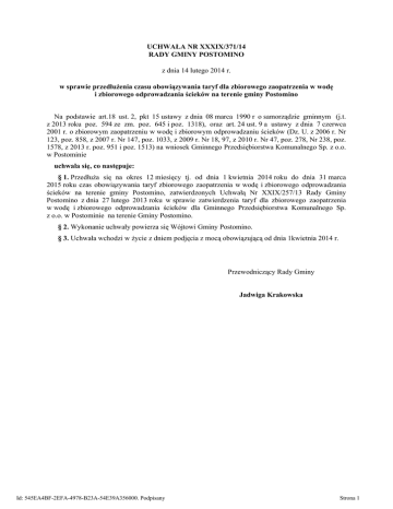 UCHWAŁA NR XXXIX/371/14 RADY GMINY POSTOMINO z dnia 14 lutego 2014 r. w sprawie przedłużenia czasu obowiązywania taryf dla zbiorowego zaopatrzenia w wodę i zbiorowego odprowadzania ścieków na terenie gminy Postomino Na podstawie art.18 ust. 2, pkt 15 ustawy z dnia 08 marca 1990 r o samorządzie gminnym (j.t. z 2013 roku poz. 594 ze zm. poz. 645 i poz. 1318), oraz art. 24 ust. 9 a ustawy z dnia 7 czerwca 2001 r. o zbiorowym zaopatrzeniu w wodę i zbiorowym odprowadzaniu ścieków (Dz. U. z 2006 r. Nr 123, poz. 858, z 2007 r. Nr 147, poz. 1033, z 2009 r. Nr 18, 97, z 2010 r. Nr 47, poz. 278, Nr 238, poz. 1578, z 2013 r. poz. 951 i poz. 1513) na wniosek Gminnego Przedsiębiorstwa Komunalnego Sp. z o.o. w Postominie uchwala się, co następuje: § 1. Przedłuża się na okres 12 miesięcy tj. od dnia 1 kwietnia 2014 roku do dnia 31 marca 2015 roku czas obowiązywania taryf zbiorowego zaopatrzenia w wodę i zbiorowego odprowadzania ścieków na terenie gminy Postomino, zatwierdzonych Uchwałą Nr XXIX/257/13 Rady Gminy Postomino z dnia 27 lutego 2013 roku w sprawie zatwierdzenia taryf dla zbiorowego zaopatrzenia w wodę i zbiorowego odprowadzania ścieków dla Gminnego Przedsiębiorstwa Komunalnego Sp. z o.o. w Postominie na terenie Gminy Postomino. § 2. Wykonanie uchwały powierza się Wójtowi Gminy Postomino. § 3. Uchwała wchodzi w życie z dniem podjęcia z mocą obowiązującą od dnia 1kwietnia 2014 r. Przewodniczący Rady Gminy Jadwiga Krakowska Id: 545EA4BF-2EFA-4978-B23A-54E39A356000. Podpisany Strona 1 Uzasadnienie Dotychczas ustalone stawki opłat za dostarczanie wody i odbiór nieczystości płynnych obowiązują do dnia 31 marca 2014 roku. Gminne Przedsiębiorstwo Komunalne wnioskiem z dnia 20 stycznia 2014 r. wystąpiło o przedłużenie o jeden rok obowiązujących taryf dla zbiorowego zaopatrzenia w wodę i zbiorowego odprowadzania ścieków na terenie Gminy Postomino. Id: 545EA4BF-2EFA-4978-B23A-54E39A356000. Podpisany Strona 1
