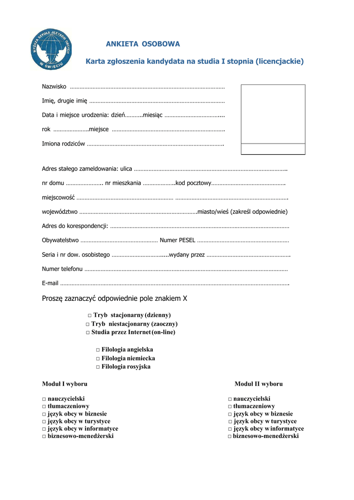 ANKIETA OSOBOWA Karta zgłoszenia kandydata na studia I stopnia (licencjackie) Nazwisko …………………………………………………………………………………… Imię, drugie imię ………………………………………………………………………… Data i miejsce urodzenia: dzień………..miesiąc …………………………….... rok ………………….miejsce ……………………………………………………………. Imiona rodziców …………………………………………………………………………. Adres stałego zameldowania: ulica ………………………………………………………………………………….. nr domu ………………….. nr mieszkania ………………..kod pocztowy………………………………………. miejscowość …………………………………………………… ……………………………………………………………. województwo ……………………………………………………………….miasto/wieś (zakreśl odpowiednie) Adres do korespondencji: ………………………………………………………………………………………………… Obywatelstwo ………………………………………… Numer PESEL ………………………………………………… Seria i nr dow. osobistego ………………………….....wydany przez ……………………………………………. Numer telefonu ……………………………………………………………………………………………………………… E-mail ……………………………………………………………………………………………………………………………. Proszę zaznaczyć odpowiednie pole znakiem X □ Tryb stacjonarny (dzienny) □ Tryb niestacjonarny (zaoczny) □ Studia przez Internet (on-line) □ Filologia angielska □ Filologia niemiecka □ Filologia rosyjska Moduł I wyboru □ nauczycielski □ tłumaczeniowy □ język obcy w biznesie □ język obcy w turystyce □ język obcy w informatyce □ biznesowo-menedżerski Moduł II wyboru □ nauczycielski □ tłumaczeniowy □ język obcy w biznesie □ język obcy w turystyce □ język obcy w informatyce □ biznesowo-menedżerski Wykształcenie: (nazwa, kierunek, rok ukończenia): …………………………...............................……………… ………………………………………………………………………………….……………………………………………………………… Wykształcenie uzupełniające: ................................................................................……………….......... ………………………………………………………………………………………………………………………………………………………. Przebieg dotychczasowego zatrudnienie (okres, firma, miejscowość, stanowisko): ............................. ………………………………………………………………………………………………………………………………………………… Podstawowe źródło utrzymania rodziny kandydata (zakreśl jedną odpowiedź): PRACA: etat, zlecenie, WŁASNA DZIAŁALNOŚĆ GOSPODARCZA, GOSPODARSTWO ROLNE, ZASIŁEK dla BEZROBOTNYCH, RENTA, EMERYTURA, ALIMENTY, INNE: …………………………………………………………………………………….. Kto będzie płacił za studia podyplomowe? Student Firma (nazwa firmy) ………………………………………………………………………………………………………….. Dotyczy mężczyzn, podlega WKU, proszę podać numer i miejscowość: …………………………………………… Prawidłowość niniejszych danych potwierdzam własnoręcznym podpisem. Wyrażam zgodę na przetwarzanie moich danych osobowych w bazie danych Wyższej Szkoły Języków Obcych w Świeciu ul. Chmielniki 2A, zgodnie z obowiązującymi przepisami. Informujemy, że osoby, które nie podejmą nauki w Wyższej Szkole Języków Obcych w Świeciu są zobowiązane odebrać dokumenty do 15 listopada br. Świecie, dnia ……………………………………… …………………………………………………………………………… podpis Proszę nie wypełniać poniżej – wypełnia Uczelnia Wpłynęło dnia: ………………………………………...... przyjmujący …………………………………………………………. umowa dnia ………………………………………………………………………………………………………………………………. egzamin dnia/podstawa zwolnienia z egzaminu …………………………………………………………………………….. opłata wpisowego ……………………………………… dokumenty: odpis dyplomu foto dowód osobisty uwagi ……………………………………………………………………………………………………………………………………….. Załączniki: - świadectwo dojrzałości/odpis - 3 zdjęcia (formatlegitymacyjny) - kwestionariusz osobowy - kserokopia dowodu osobistego Poświadczenie odbioru dokumentów Z powodu zakończenia nauki potwierdzam zwrot oryginałów moich dokumentów przekazanych Wyższej Szkole Języków Obcych w Świeciu w trakcie naboru na studia podyplomowe. …………………………………………………….. podpis pracownika WSJO ………………………………………………………… podpis odbierającego