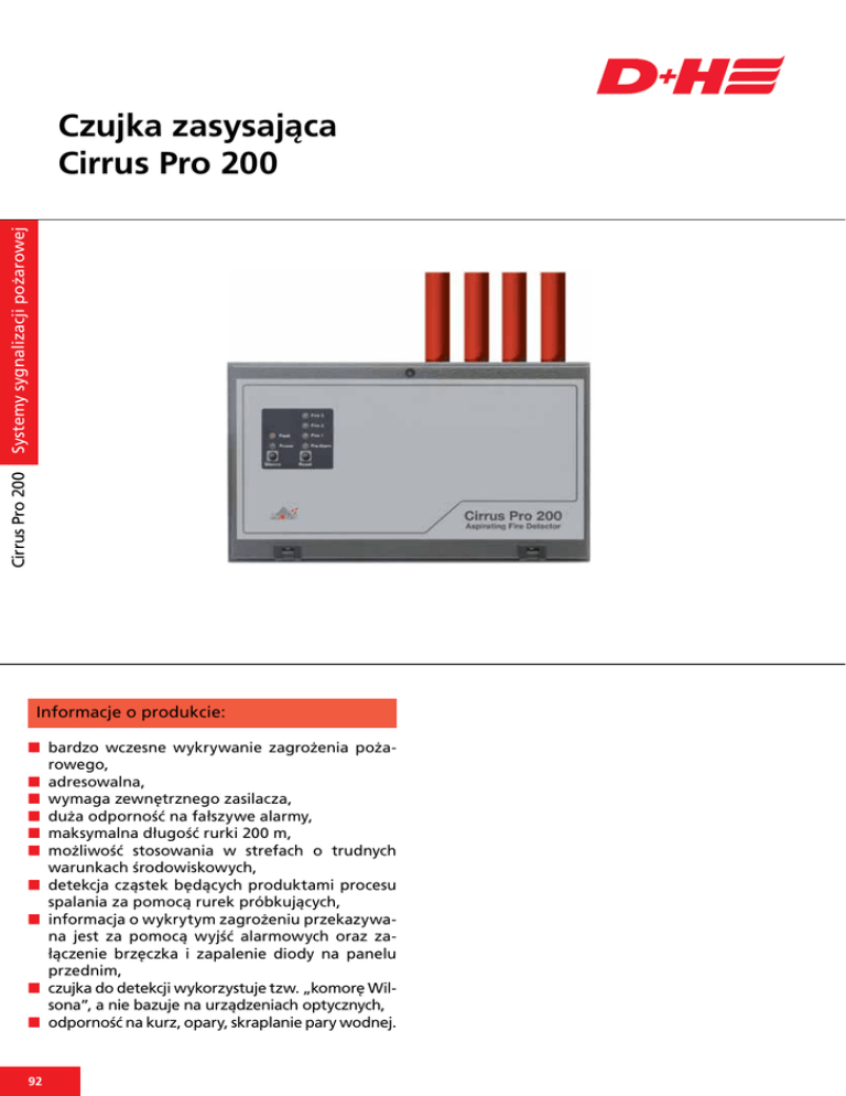 Cirrus Pro 200 Systemy sygnalizacji pożarowej Czujka zasysająca Cirrus Pro 200 Informacje o produkcie: ■■ bardzo wczesne wykrywanie zagrożenia pożarowego, ■■ adresowalna, ■■ wymaga zewnętrznego zasilacza, ■■ duża odporność na fałszywe alarmy, ■■ maksymalna długość rurki 200 m, ■■ możliwość stosowania w strefach o trudnych warunkach środowiskowych, ■■ detekcja cząstek będących produktami procesu spalania za pomocą rurek próbkujących, ■■ informacja o wykrytym zagrożeniu przekazywana jest za pomocą wyjść alarmowych oraz załączenie brzęczka i zapalenie diody na panelu przednim, ■■ czujka do detekcji wykorzystuje tzw. „komorę Wilsona”, a nie bazuje na urządzeniach optycznych, ■■ odporność na kurz, opary, skraplanie pary wodnej. 92 Schemat przyłączeniowy: weJŚcie 3 wyJŚcie alarMu 3 stoPnia weJŚcie 4 wyJŚcie usterki ogólneJ ZewnętrZny ZasilacZ buforowy Dane techniczne: Napięcie zasilania 20-29 VDC Pobór mocy 8,2 W spoczynkowy (24 VDC 90% prędkości wentylatora) Pobór prądu 340 mA spoczynkowy, 500 mA w alarmie (24 VDC 90 % prędkości wentylatora) Wymiary (W) 360 mm, (H) 215 mm, D (144 mm) Waga 5 kg (11 Ibs) Środowisko pracy czujki 0˚C do 38˚C (32˚F do 100˚F) Testowany przy 0˚C do 55˚C (32˚F do 131˚F) Próbki powietrza –20˚C do 60˚C (–4˚F do 140˚F) Wilgotność 10–95%RH, bez kondensacji Stopień ochrony IP30 Wejście kablowe 6 × 20 mm przetłoczeń (knock outs) Zakończenie kablowe Sieć rurek próbkujących Cirrus Pro 200 wyJŚcie alarMu 2 stoPnia AWARIA ZASILACZA weJŚcie 2 24 V wyJŚcie alarMu 1 stoPnia 0V weJŚcie 1 Systemy sygnalizacji pożarowej wyJŚcie alarMu wstęPnego RS485 Zaciski śrubowe (0,2–2,5 mm2, 30–12 AWG) Cztery porty wlotowe połączone z całkowitą długością rurek próbkujących do 200 m (600 ft). Maksymalny czas transportu – do 120 sekund Wymagana rurka 19–25 mm (preferowana 25 mm) Wskaźniki alarmowe Alarm wstępny, alarm 1 stopnia, alarm 2 stopnia, alarm 3 stopnia Inne wskaźniki Zasilanie, uszkodzenie ogólne Ustawienia czułości (zgodnie z normą EN-54) - Programowalne wejścia 4 monitorowane wejścia, które mogą być wykorzystywane do zdalnego resetu, blokowania, zmiany czułości lub przyjmowania zewnętrznych sygnałów, np. usterki zasilacza Programowalne przekaźniki wyjścia 5 przekaźnikow (NO) 1 A @ 30 VDC (styki bezpotencjałowe) Dziennik zdarzeń 128 pozycji Przechowywanie danych Około 10 dni wstecz w formie wykresu Zmienne ustawienia czułości Programowalne dla 7 dni z 3 ustawieniami stref czasowych Monitorowanie przepływu powietrza Monitorowanie błędu za wysokiego i za niskiego przepływu powietrza 93