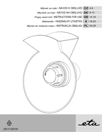 25/11/2016 Mlýnek na mák • NÁVOD Mlynček na mak • NÁVOD K OBSLUZE NA OBSLUHU 4-8 9-13 Poppy seed mill • INSTRUCTIONS FOR USE GB 14-18 Mákdaráló • HASZNÁLATI UTASÍTÁS H 19-23 Młynek do mielenia maku • INSTRUKCJA OBSŁUGI PL 24-28 1 H H6 2 2 3 H2 H1 2 1 1 H5 H4 H3 A7 4 3 1 2 1 Obrázky jsou pouze ilustrační / Obrázky sú len ilustračné / Product images are for illustrative purposes only / Illusztratív képek / Zdjęcia służą wyłącznie jako ilustracja 2 / 28 CZ I. BEZPEČNOSTNÍ UPOZORNĚNÍ II. POPIS SPOTŘEBIČE A PŘÍSLUŠENSTVÍ III. PŘÍPRAVA A POUŽITÍ IV. ÚDRŽBA V. EKOLOGIE VI. TECHNICKÁ DATA 4 5 6 7 7 8 SK I. BEZPEČNOSTNÉ UPOZORNENIA II. POPIS SPOTREBIČA A PRÍSLUŠENSTVA III. PRÍPRAVA A POUŽITIE IV. ÚDRŽBA V. EKOLÓGIA VI. TECHNICKÉ ÚDAJE 9 10 11 12 12 13 GB I. SAFETY NOTICE II. DESCRIPTION OF THE APPLIANCE AND ACCESSORIES III. PREPARATION AND USE IV. MAINTENANCE V. ENVIRONMENT VI. TECHNICAL DATA 14 16 16 17 18 18 HU I. BIZTONSÁGI FIGYELMEZTETÉS II. A KÉSZÜLÉK ÉS TARTOZÉKOK LEÍRÁSA III. ELŐKÉSZÍTÉS ÉS HASZNÁLAT IV. KARBANTARTÁS V. KÖRNYEZETVÉDELEM VI. MŰSZAKI ADATOK 19 21 21 22 23 23 PL I. UWAGI DOTYCZĄCE BEZPIECZEŃSTWA II. OPIS URZĄDZENIA I WYPOSAŻENIA III. PRZYGOTOWANIE I UŻYCIE IV. KONSERWACJA V. EKOLOGIA VI. DANE TECHNICZNE 24 26 26 27 28 28 3 / 28 CZ Přídavný strojek ke kuchyňskému robotu ETA 0023 Gratussino, ETA 0028 Gratus, ETA 0030 Meno, ETA 0033 Mezo, ETA 0128 Gustus a mlýnku na maso ETA 2075 Ambo. Mlýnek na mák eta 002896000 NÁVOD K OBSLUZE Vážený zákazníku, děkujeme Vám za zakoupení našeho produktu. Před uvedením tohoto přístroje do provozu si velmi pozorně přečtěte návod k obsluze a tento návod spolu se záručním listem, pokladním dokladem a podle možností i s obalem a vnitřním obsahem obalu dobře uschovejte. I. BEZPEČNOSTNÍ UPOZORNĚNÍ – Instrukce v návodu považujte za součást spotřebiče a postupte je jakémukoliv dalšímu uživateli spotřebiče. –T ento přídavný strojek nesmí být používán dětmi. Udržujte spotřebič mimo dosah dětí. Spotřebiče mohou používat osoby se sníženými fyzickými či mentálními schopnostmi nebo nedostatkem zkušeností a znalostí, pokud jsou pod dozorem nebo byly poučeny o používání spotřebiče bezpečným způsobem a rozumí případným nebezpečím. Děti si se přídavným strojkem nesmějí hrát. –P řed výměnou příslušenství nebo přístupných části, které se při používání pohybují, před montáží a demontáží, před čištěním nebo údržbou, spotřebič vypněte a odpojte od el. sítě vytažením vidlice napájecího přívodu z el. zásuvky! –V ždy vypněte a odpojte pohonnou jednotku od napájení, pokud přídavný strojek necháváte bez dozoru. –S potřebič nenechávejte v chodu bez dozoru a kontrolujte ho po celou dobu přípravy potravin! – Je-li spotřebič v činnosti, zabraňte v kontaktu s ním domácím zvířatům, rostlinám a hmyzu. –P o ukončení práce a před každou údržbou spotřebič vždy vypněte a odpojte od el. sítě vytažením vidlice napájecího přívodu z el. zásuvky. –N ikdy nepoužívejte přídavný strojek, pokud nepracuje správně, pokud upadl na zem a poškodil se. V takových případech zaneste přídavný strojek do odborného servisu k prověření bezpečnosti a správné funkce. – Přídavný strojek je určen pouze pro použití v domácnostech a podobné účely (v obchodech, kancelářích a podobných pracovištích, v hotelích, motelech a jiných obytných prostředích, v podnicích zajišťujících nocleh se snídaní)! Není určen pro komerční použití! –P řídavný strojek sestavte přesně podle pokynů v návodu k obsluze, jakékoli jiné kombinace sestavení strojků nejsou z hlediska správné funkce přípustné! –P řídavný strojek je určen pouze ke zpracování máku! Nezpracovávejte jiné potraviny (např. obilniny, lněná a sezamová semena, kukuřici, rýži, pohanku, sušené houby, byliny, koření a kávu, apod.). 4 / 28 CZ – Nikdy nezpracovávejte mokrý, vlhký nebo zmražený mák!! – Přídavný strojek nikdy nesestavujte na pohonné jednotce! – Nikdy nenastavujte hrubost mletí za chodu pohonné jednotky! – Nikdy nepřitahujte mlecí kameny násilím! – Sestavený přídavný strojek upevňujte a odnímejte jen tehdy, jeli pohonná jednotka vypnuta a vidlice napájecího přívodu odpojena od el. sítě. – Přídavný strojek nenechávejte v chodu bez dozoru a kontrolujte ho po celou dobu přípravy potravin! – Nenechávejte mlýnek v chodu, je-li násypka prázdná. – Dlouhé vlasy, volny oděv nebo doplňky a šperky mohou byt zachyceny rotujícími částmi přídavného strojku. Dbejte na to, aby se Vaše vlasy, oděv a doplňky se nedostaly do nebezpečné blízkosti rotujících části! – Přídavný strojek nebo jeho součásti nezasouvejte do žádných tělesných otvorů. – Unašeč nikdy neponořujte do vody ani nemyjte pod proudem vody! – Nepřekračujte maximální dobu nepřetržitého chodu spotřebiče / pohonné jednotky! – Než odejmete přídavný strojek z pohonné jednotky nechejte rotující části úplně zastavit. – Přídavný strojek používejte pouze s pohonnou jednotkou / robotem určeným pro tento typ. Použití jiné pohonné jednotky / robota může představovat nebezpečí pro obsluhu. – Nikdy nevsunujte předměty (např. prsty, vidličku, nůž, stěrku, lžíci) do násypného otvorů a rotujících částí přídavného strojku. – Před přípravou odstraňte z potravin případné obaly (např. papír, PE sáček, atd.). – Pokud se zpracovávané potraviny začnou zachycovat v přídavném strojku, pohonnou jednotku vypněte, strojek demontujte a vyčistěte. – Není přípustné jakýmkoli způsobem upravovat povrch přídavného strojku (např. pomocí samolepicí tapety, fólie, 